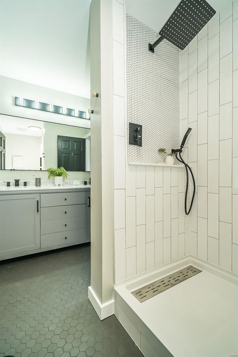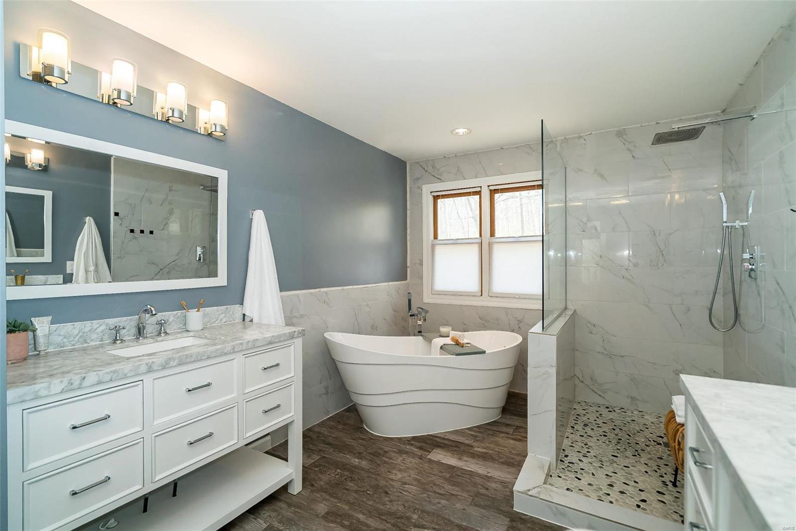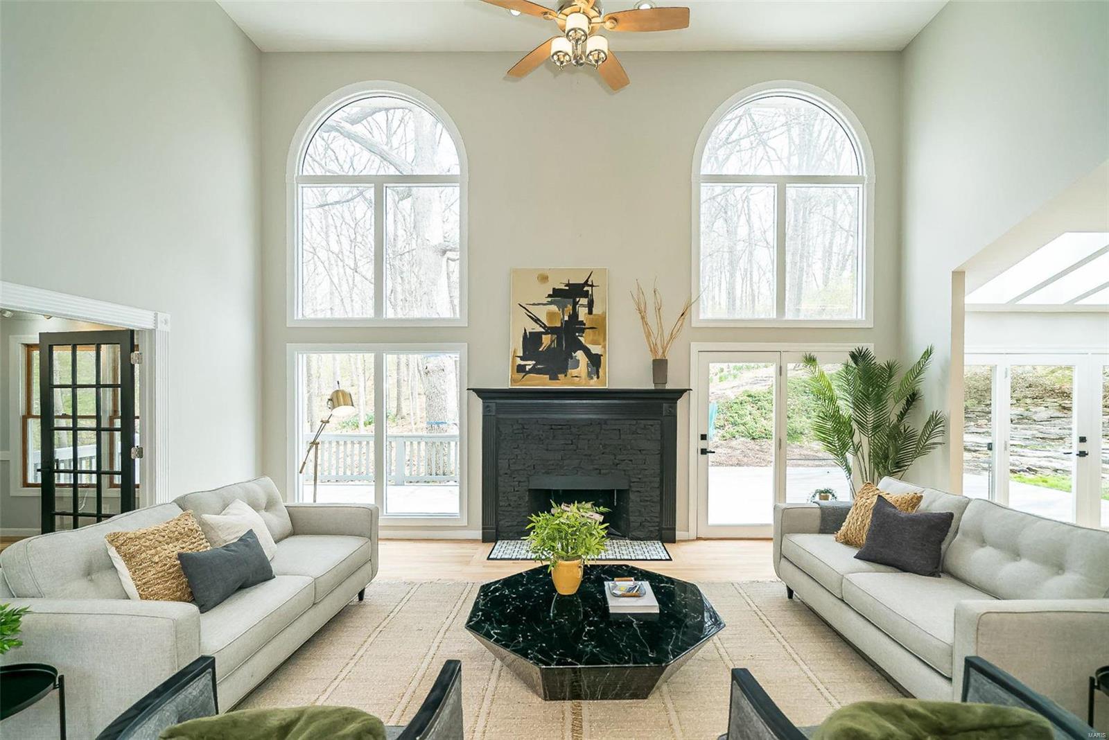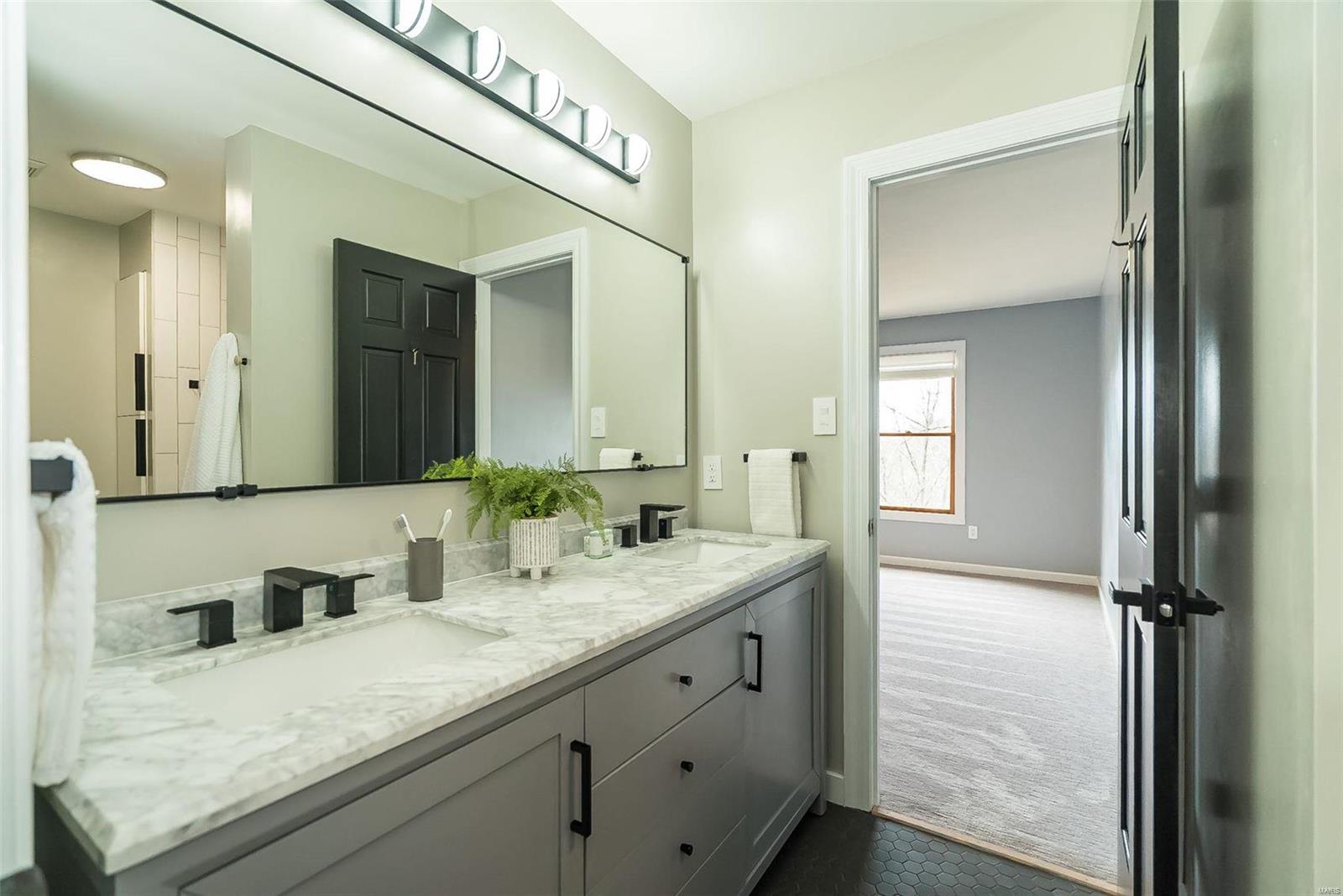 Classy. Modern. Chic! This hidden gem will lure you in with it's scenic picturesque views, soaring sundrenched spaces and spectacular renovations throughout! Dramatic two-story entry, dining room w/stylish accent wall, grand great room w/wall of windows, wet bar and focal fireplace. STUNNING kitchen w/luxe cabinetry, Calacatta Splendor quartz countertops w/waterfall side, fabulous island w/induction cooktop, double s/s ovens, Samsung Bespoke fridge and storage galore! Private office/study is adjacent to the tranquil primary suite featuring large walk-in closet, luxurious spa-like bath w/double vanities, corner soaking tub and deluxe shower. Head upstairs (note the side staircase!) to find (3) large bedrooms. (2) share a gorgeous jack-n-jill bath and the 3rd is private w/it's own full bath that is equally impressive. The massive lower level is a showstopper! Family room w/stunning stone fireplace, rec/game area, workout room, serene sauna and 4th full bath! Award winning Lindbergh SD!