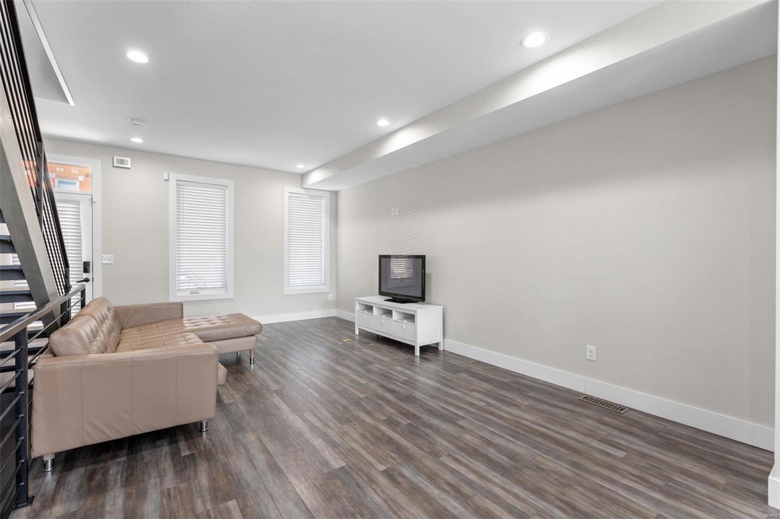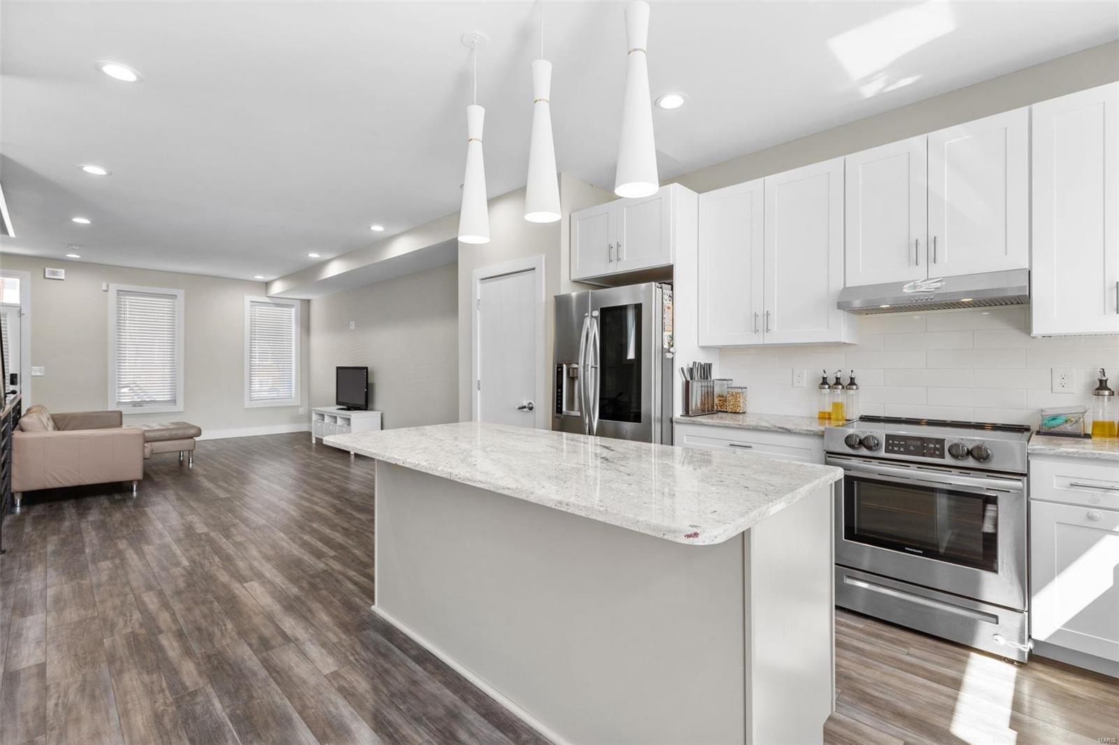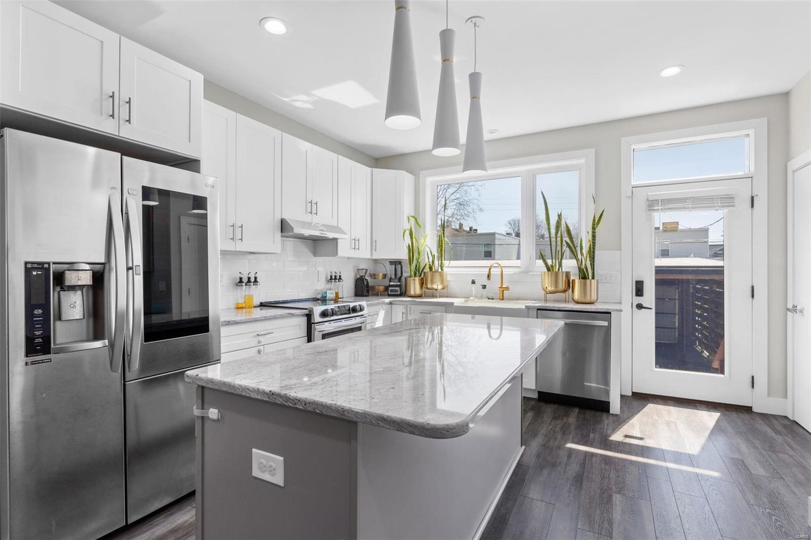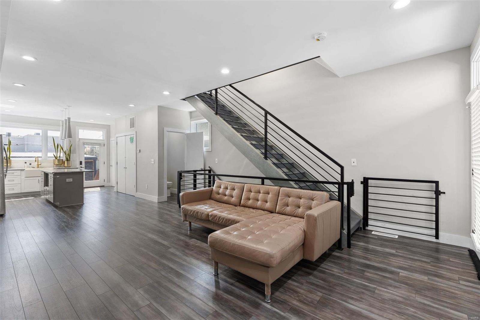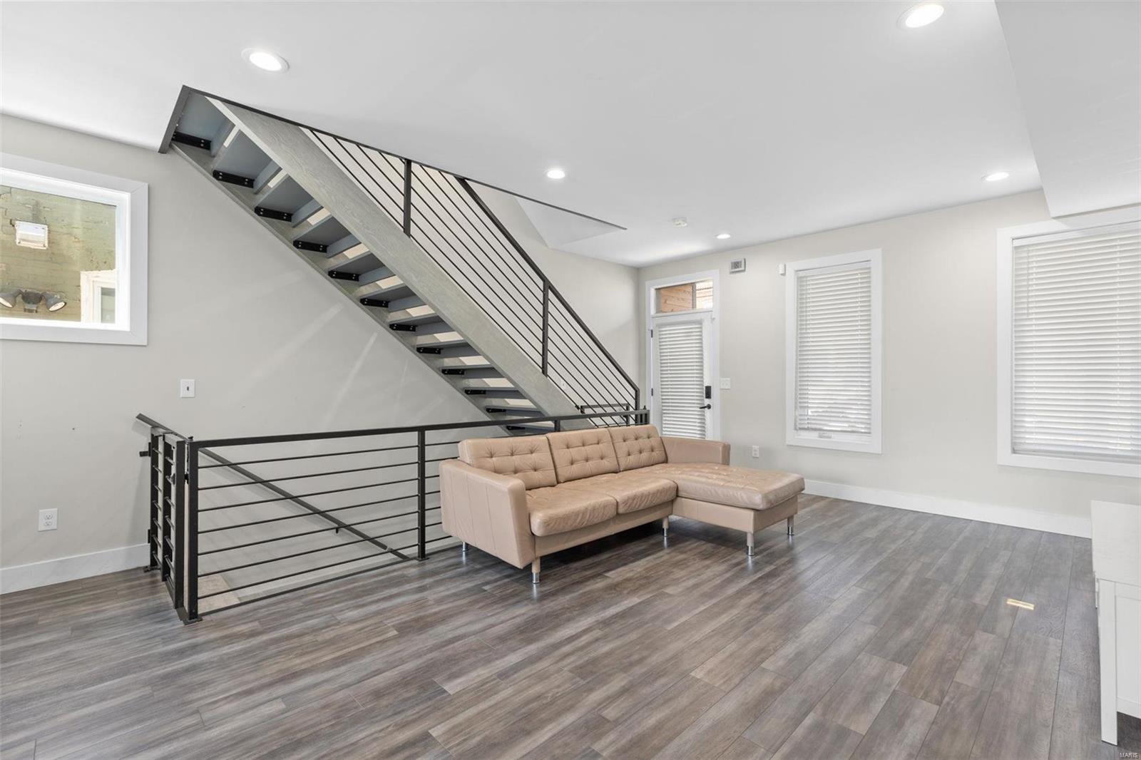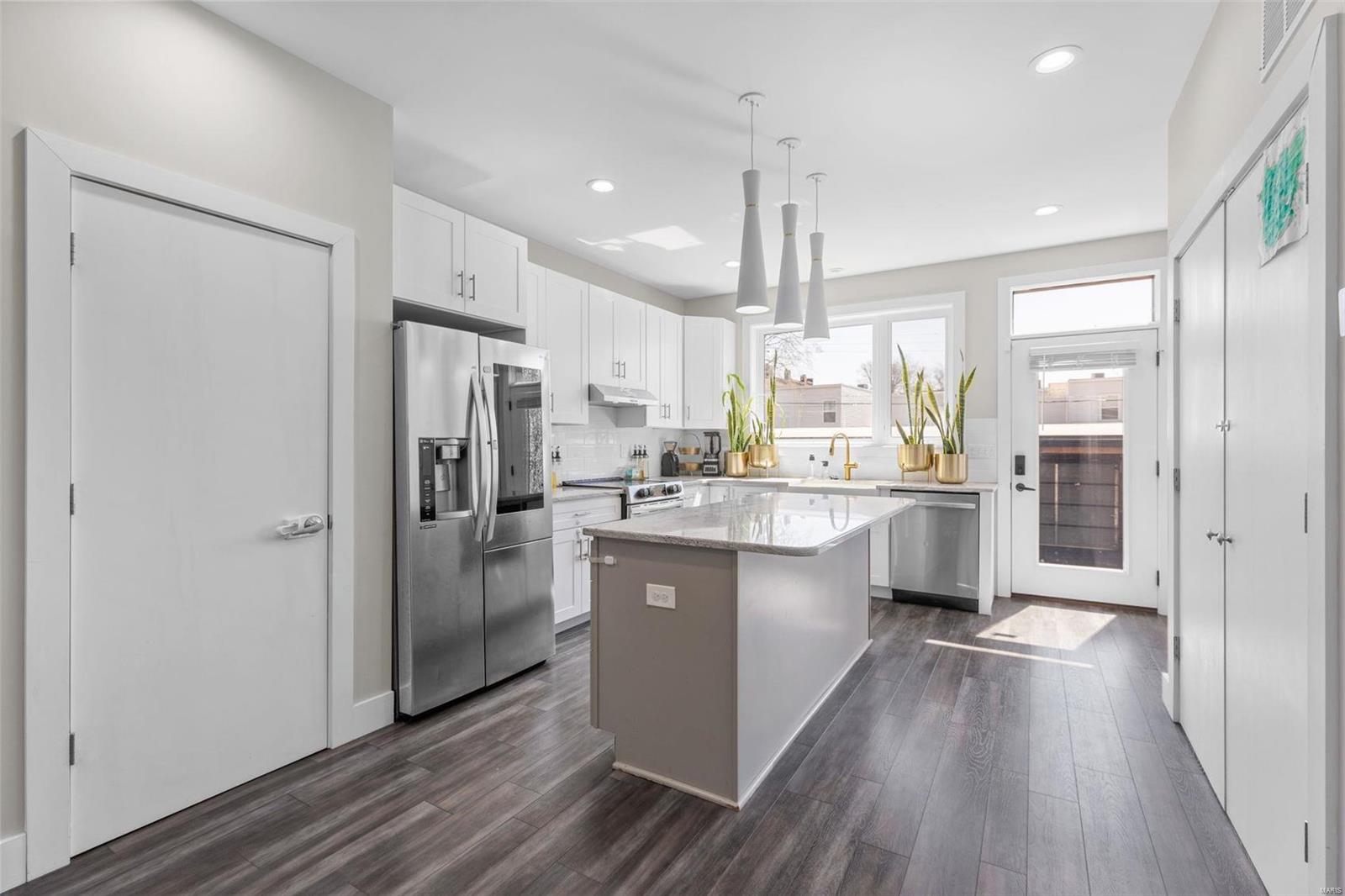 Modern townhome in the fast-growing Grove neighborhood without the wait! Within Washington University "Live Near Your Work" neighborhood. Walk or bike to Forest Park, CORTEX, & the hospitals. Just steps from the vibrant heart of the Grove strip, but located on a quiet cul-de-sac. Featuring open concept living and dining combo with chic kitchen & natural light. 2nd fl has large rooms w/ divided floorplan, full bathroom, and convenience of laundry area. 3rd floor offers a spacious primary bedroom and luxe en suite amenities. BONUS 3rd floor exclusive & private Rooftop Terrace w/ plenty of entertaining space and city views. The unfinished basement has all the rough-ins to turn it into a one-bedroom rental, home office or Airbnb--with a separate front entrance. Near-maintenance-free yard leads to covered, private, two-car parking with alley access that has been recently paved. This is one side of a two-unit building (separate owners / No HOA). It is the townhouse on the right side.