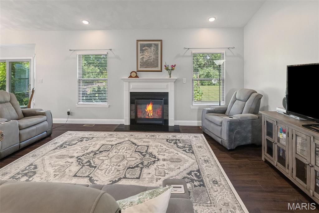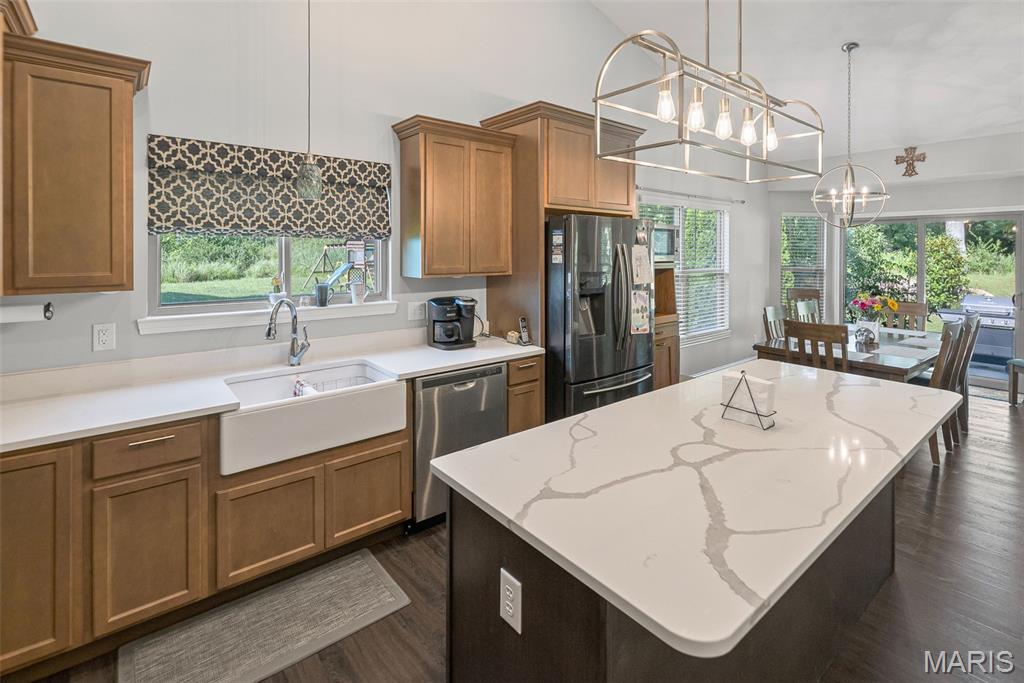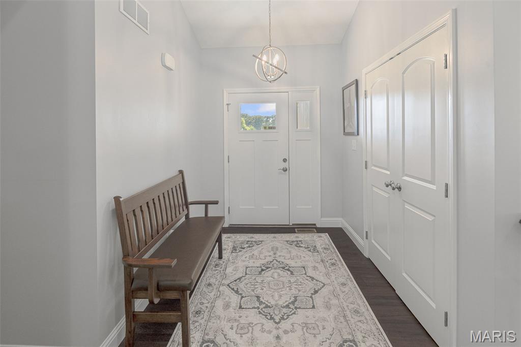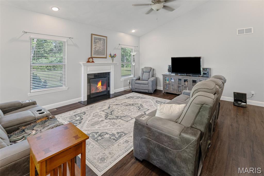 BACKYARD OASIS! This beautiful 3-bedroom, 2-bath ranch offers open-concept living in a highly desirable neighborhood. The living room features vaulted ceilings, LVP flooring, and a gas fireplace, flowing into the kitchen and dining area. The kitchen is equipped with a large island, quartz countertops, soft-close cabinetry, stainless steel appliances(2023), farmhouse apron sink, and pantry. The primary suite includes a walk-in closet, custom blinds, and an ensuite bath with dual vanities, a soaking tub, and a separate shower. Two additional bedrooms, a full hall bath, and a first-floor laundry complete the main level. Washer and dryer stay. The unfinished basement with 9-foot pour includes an open floor plan with a full egress window, full bathroom rough-in, and abundant storage or finishing potential. Outside, the private backyard features professional landscaping, evening shade, lots of wooded coverage away from the home, & high elevation for the Tanglewood neighborhood. Neighborhood amenities include walking trails, ponds, playground, gazebo, and community events. Conveniently located with easy access to I-64, shopping, dining, and Scott AFB. Municipally compliant and move-in ready, schedule your private showing today!