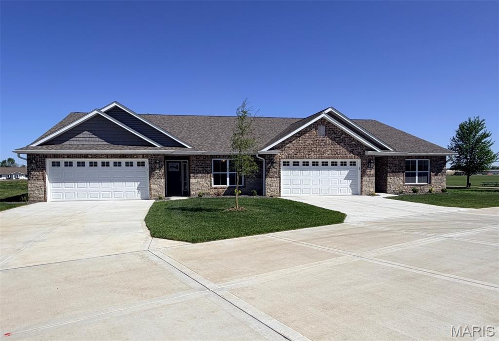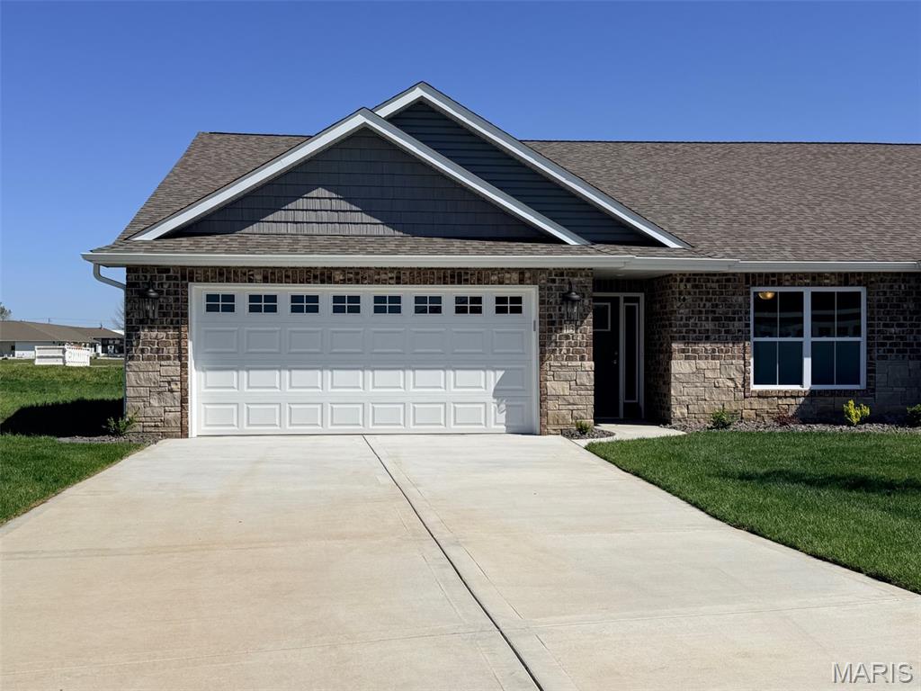 NOW READY FOR MOVE-IN! Welcome to 13 Sonata Lane in Troy, IL, an upscale new construction villa in the highly desirable Serenade Villas community. This beautifully crafted home offers exceptional curb appeal with timeless brick and stone exterior detailing, setting the tone for the quality and thoughtful design found throughout. Step inside to a bright, open layout featuring a spacious living room with a built-in electric fireplace and stylish shiplap surround. The kitchen is designed for both everyday living and entertaining, showcasing a large center island, upgraded cabinetry, and granite countertops, all flowing into the dining area under a soaring vaulted ceiling that creates an airy, welcoming feel. The primary suite is a relaxing retreat with a private bath featuring dual vanities, a tiled shower, and a generous walk-in closet. A second bedroom provides comfortable space for guests, while the bonus room offers outstanding flexibility - ideal for a home office, craft room, hobby space, or additional sitting area. Enjoy the outdoors from your covered patio, perfect for relaxing with morning coffee or evening downtime. Additional highlights include no-step living throughout, luxury vinyl plank and ceramic tile flooring, and a 2-car garage with extra storage. Conveniently located near shopping, dining, parks, a stocked pond, walking trails, and quick interstate access, this home delivers the perfect blend of comfort, convenience, and modern low-maintenance living in Troy.