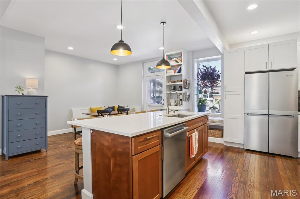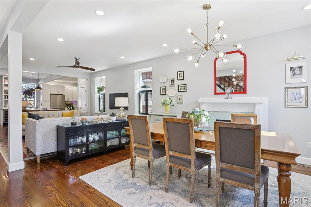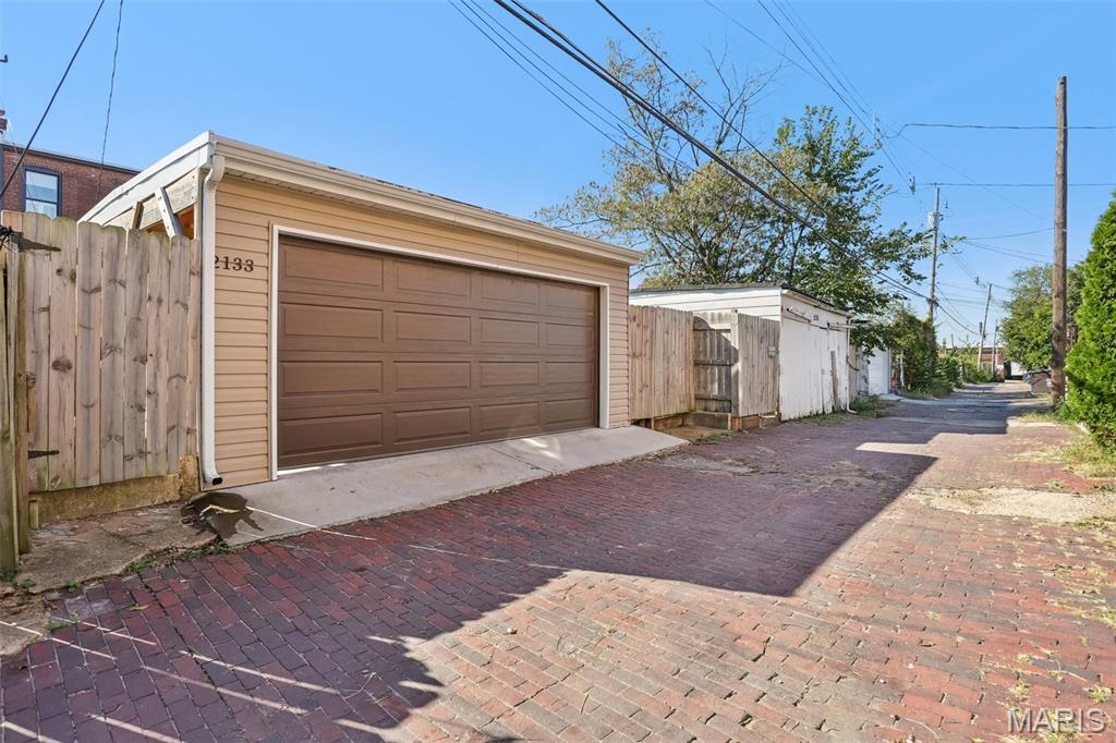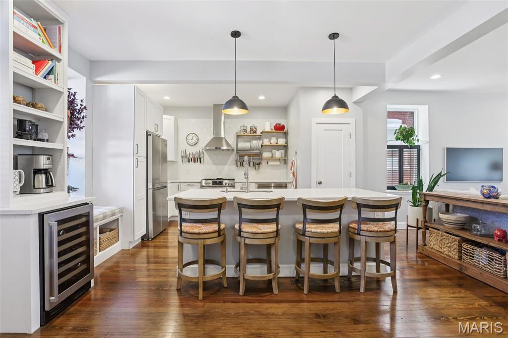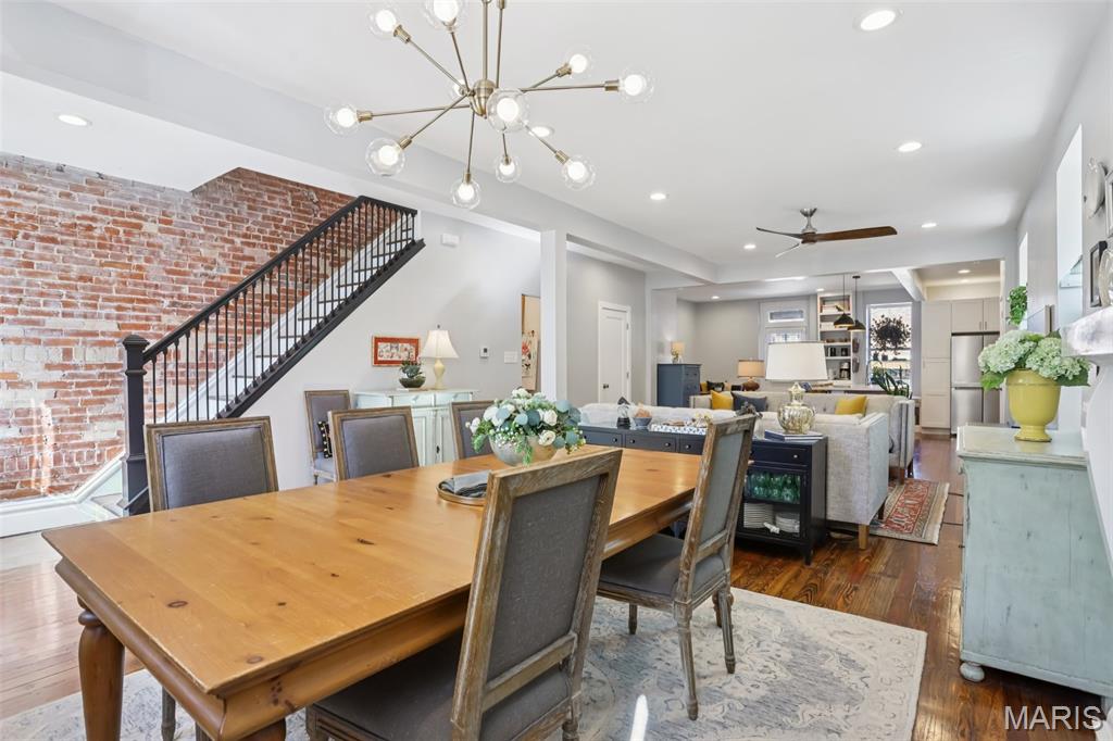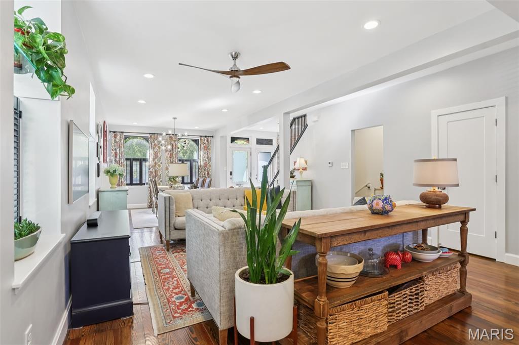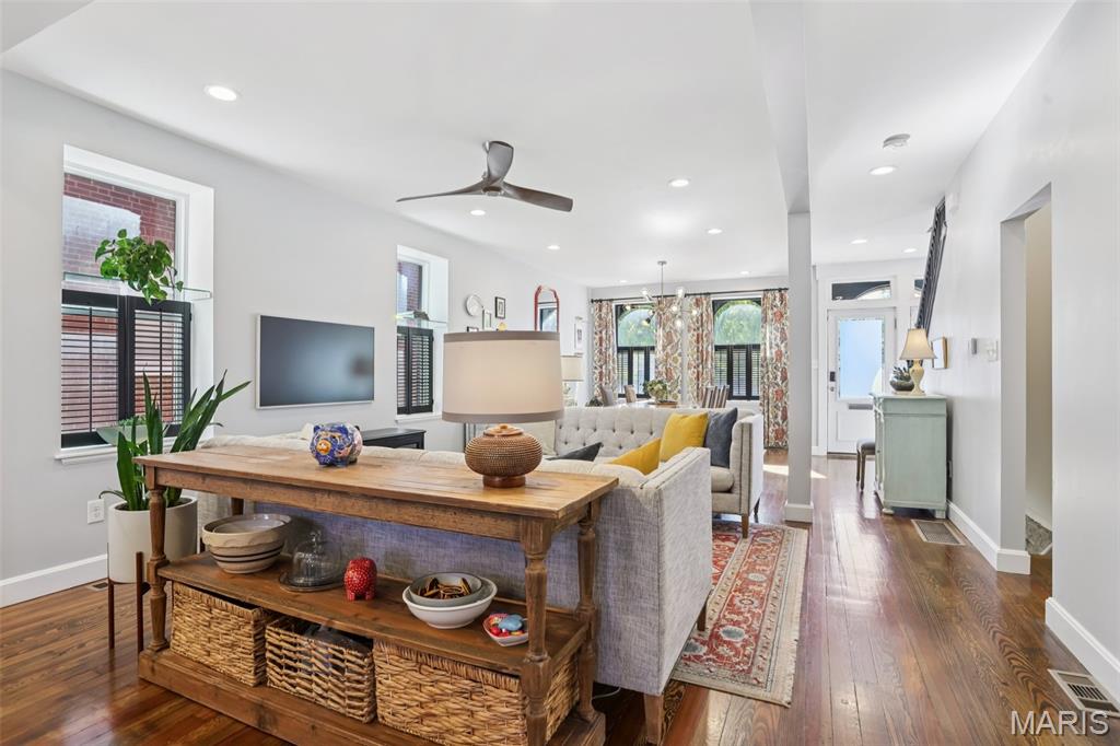 Get ready to be impressed. This beautiful fully renovated(2021) 2 family conversion has all you need for contemporary city living. Step through the front door and immediately notice the open floor plan with a dining area with fireplace, family room, half bathroom and eat in kitchen. Original hardwood floors, 9 ft ceiling, 68" tall windows with plantation shutters and recessed lighting span the main floor and second floors. The dining area has a sputnik chandelier and decorative fireplace with original tile and mantle.The kitchen has 42" cabinets with pull outs, quartz counters, hexagon tile backsplash, floating shelves, built-in shelves, SS appliances, professional style ventilation hood, 8'x3.5' center island with breakfast bar, beverage fridge, coffee nook, removeable banquette with custom cushions and a 5x3 walk-in pantry. Don't miss the half bathroom with floating vanity, quartz top and penny tile before making your way up the stairway with exposed brick wall to the second floor consisting of three bedrooms, a hall bathroom and laundry closet(washer and dryer included). The two secondary bedrooms both have decorative fireplaces. The sellers use one room as a study, the other for guests. The updated hall bathroom has a shower/soaking tub combo with penny tile surround, shower niche, tiled floor, newer fixtures, newer vanity quartz top and wood panels. The primary suite has a walk-in California closet, custom built in wardrobe with pull-outs, private 10'x8' balcony and updated full bathroom with a floating double vanity, quartz top, subway tiled shower with glass door and tile floor. The lower level has a large finished rec/family room with craft area, a workshop, utility room and conveniently walks up to the back patio. A dual sump pump system ensures you will have a dry lower level. Outside a 10'x8' deck with kitchen access overlooks the level and fenced in back yard. A two space carport with alley access allows for off street parking. The 2021 roof will give you years of protection from the elements. The home has passed the St. Louis City occupancy inspection as well. All this in one package is a fantastic value you don't want to miss. Refer to the features/updates list in the supplements for more noteworthy aspects of the property.