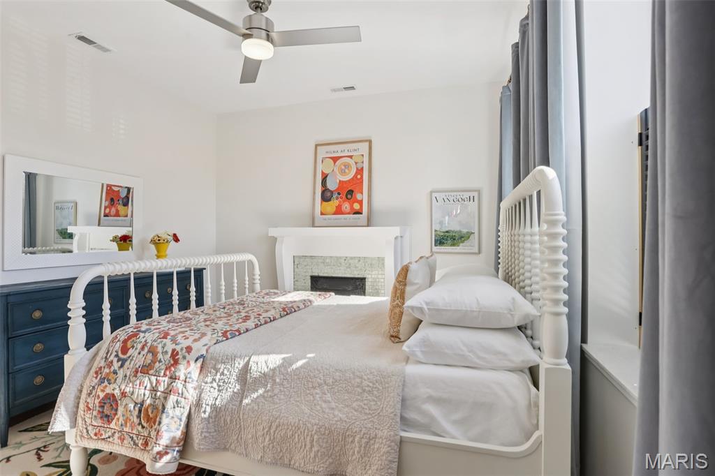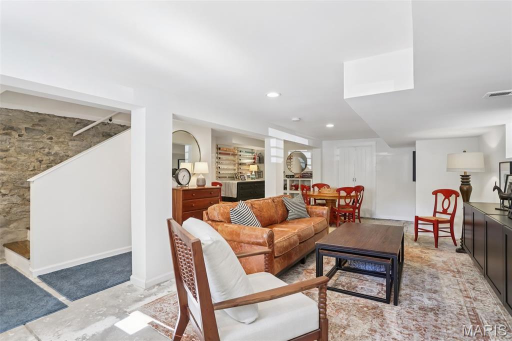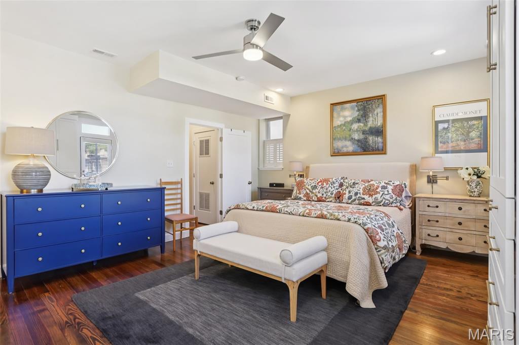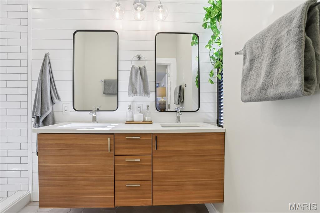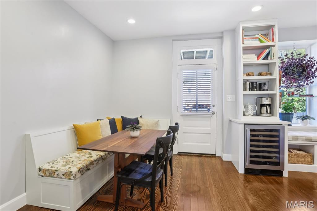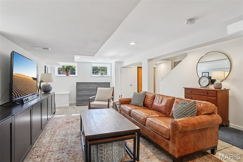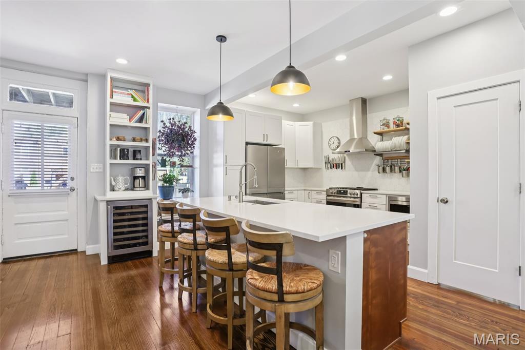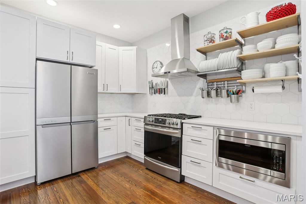 Get ready to be impressed. This beautiful fully renovated(2021) 2 family conversion has all you need for contemporary city living. Step through the front door and immediately notice the open floor plan with a dining area with fireplace, family room, half bathroom and eat in kitchen. Original hardwood floors, 9 ft ceiling, 68" tall windows with plantation shutters and recessed lighting span the main floor and second floors. The dining area has a sputnik chandelier and decorative fireplace with original tile and mantle.The kitchen has 42" cabinets with pull outs, quartz counters, hexagon tile backsplash, floating shelves, built-in shelves, SS appliances, professional style ventilation hood, 8'x3.5' center island with breakfast bar, beverage fridge, coffee nook, removeable banquette with custom cushions and a 5x3 walk-in pantry. Don't miss the half bathroom with floating vanity, quartz top and penny tile before making your way up the stairway with exposed brick wall to the second floor consisting of three bedrooms, a hall bathroom and laundry closet(washer and dryer included). The two secondary bedrooms both have decorative fireplaces. The sellers use one room as a study, the other for guests. The updated hall bathroom has a shower/soaking tub combo with penny tile surround, shower niche, tiled floor, newer fixtures, newer vanity quartz top and wood panels. The primary suite has a walk-in California closet, custom built in wardrobe with pull-outs, private 10'x8' balcony and updated full bathroom with a floating double vanity, quartz top, subway tiled shower with glass door and tile floor. The lower level has a large finished rec/family room with craft area, a workshop, utility room and conveniently walks up to the back patio. A dual sump pump system ensures you will have a dry lower level. Outside a 10'x8' deck with kitchen access overlooks the level and fenced in back yard. A two space carport with alley access allows for off street parking. The 2021 roof will give you years of protection from the elements. The home has passed the St. Louis City occupancy inspection as well. All this in one package is a fantastic value you don't want to miss. Refer to the features/updates list in the supplements for more noteworthy aspects of the property.