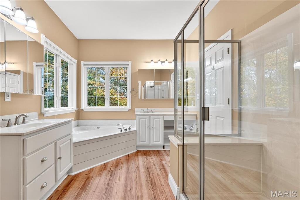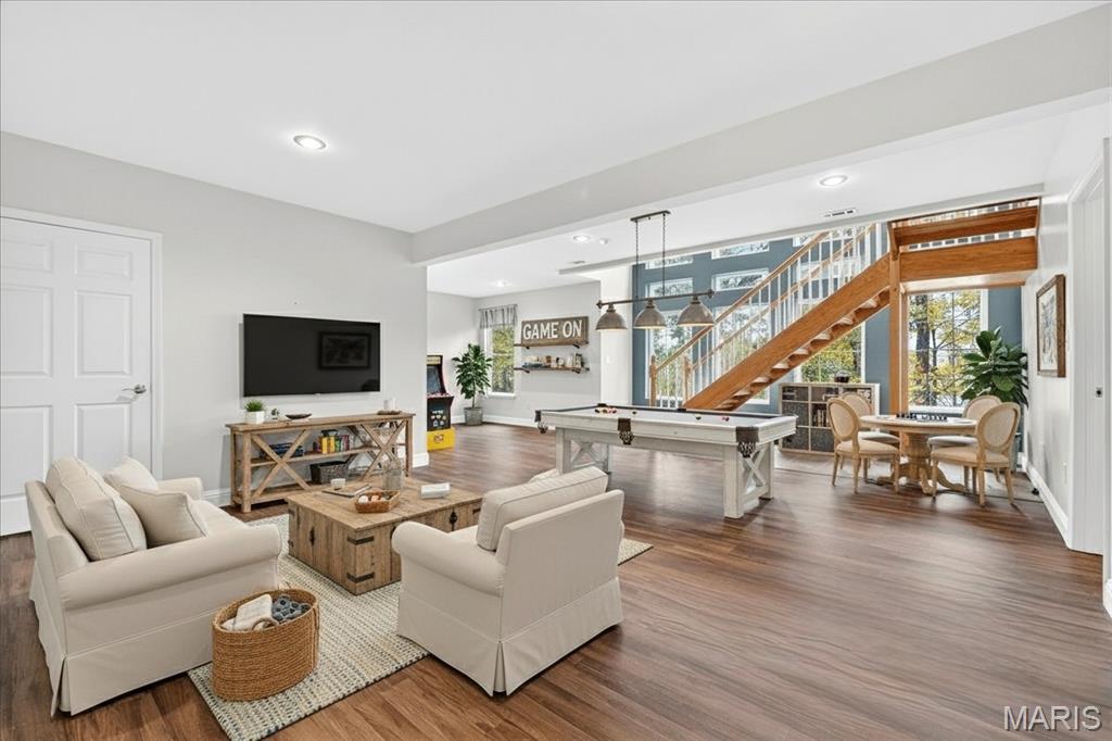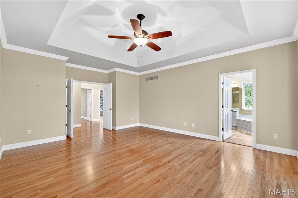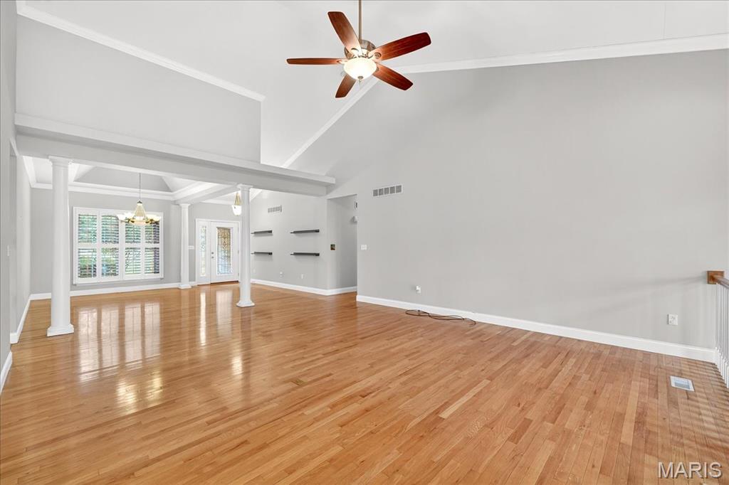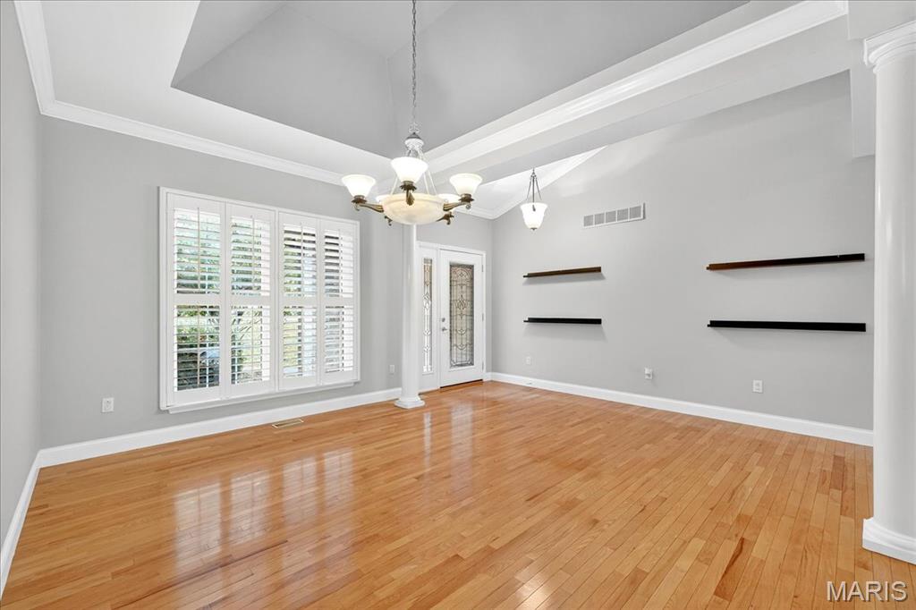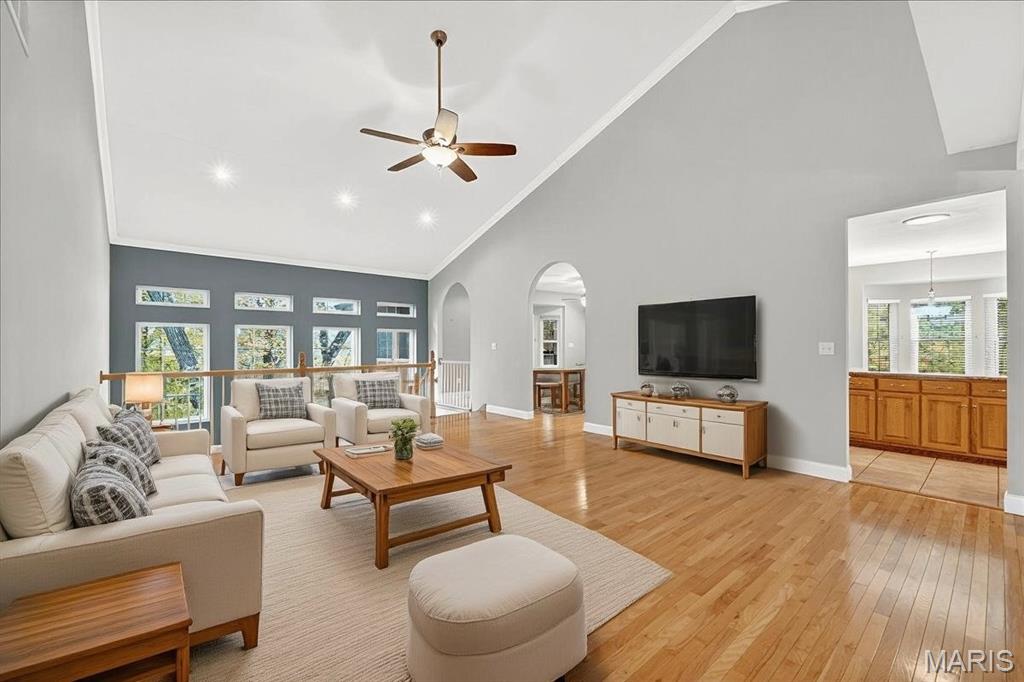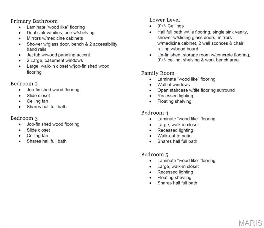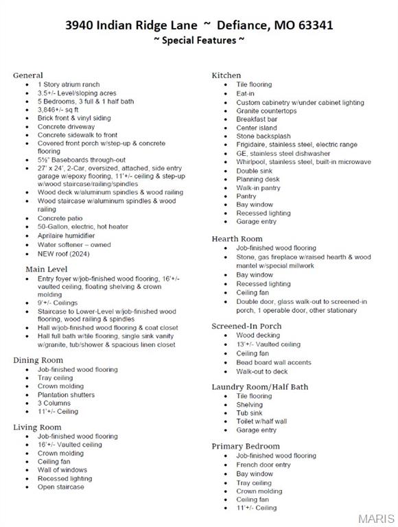 CUSTOM-BUILT ATRIUM RANCH home on 3+/- fabulous level/sloping acres in Defiance in the quite/desirable subdivision of Indian Ridge Farms! This 5 bedroom, 3.5 bath home with 3,846+/- sq ft of living space offers a 9’+/- ceilings through-out & 2-car oversized attached garage. Covered front porch greets you as you step inside the entry foyer. Dining room, accented with job-finished wood flooring, tray ceiling & plantation shutters adjoins living room with 16’+/- vaulted ceiling, recessed lighting, open staircase & wall of windows allowing plenty of natural light. Adjacent eat-in kitchen with custom cabinetry, granite, stainless steel appliances, center island, breakfast bar, bay window, tile flooring & 2 pantries. Hearth room features job-finished wood flooring, raised stone gas fireplace, recessed lighting & bay window w/walk-out to screened-in porch. Primary suite with tray ceiling, bay window, job-finished wood flooring, French door entry & bath boasting dual sink vanities, shower, jet tub & large walk-in closet. Two additional bedrooms flaunt job-finished wood flooring, slide closets & share a hallway bath. Laundry room/half bath completes the main level. Expansive, walk-out lower level with abundant storage space, family room w/laminate “wood like” flooring, 4th & 5th bedroom & full bath. Outside, you will enjoy a wood deck allowing expansive scenic views of the acreage. Within the Francis Howell School District. SCHEDULE YOUR SHOWING TODAY!