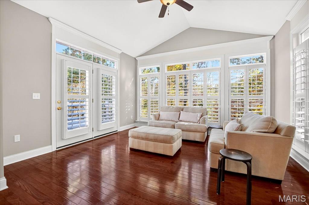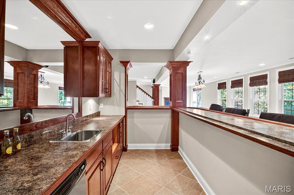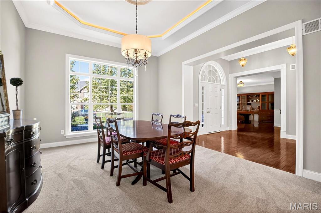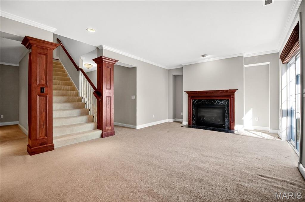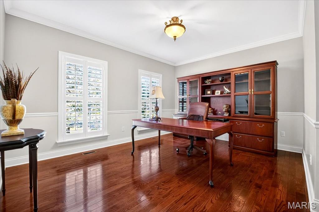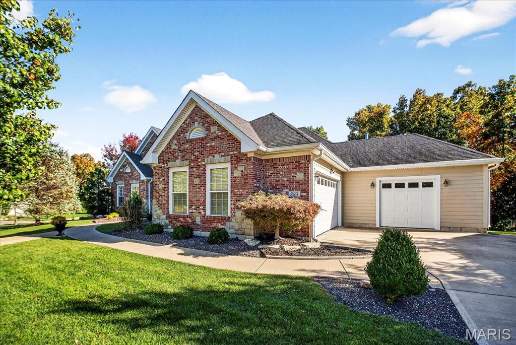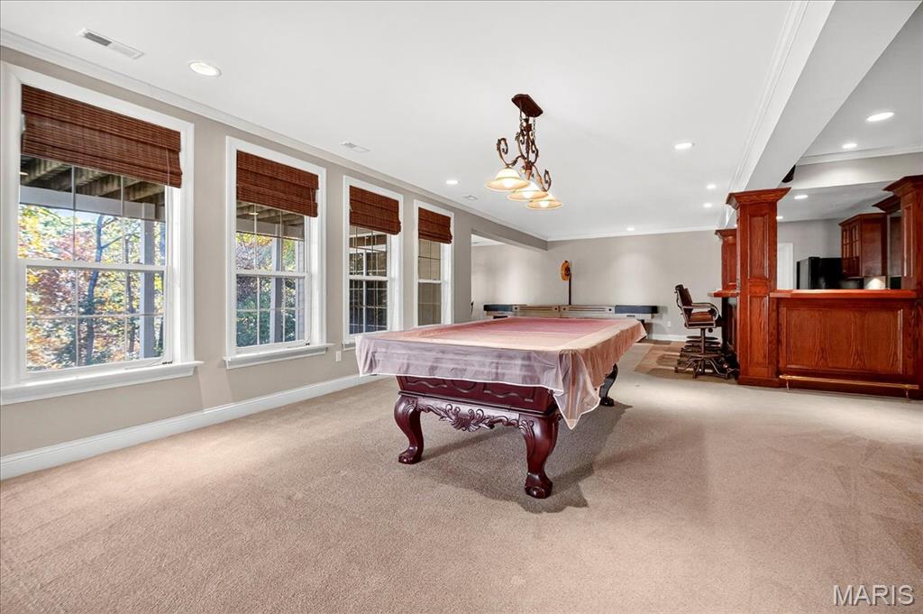 Esquisite Custom Built Hardesty home in the heart of Wildwood. This stunning ranch-style residence is a true showcase of craftsmanship and quality that only Hardesty Homes can deliver. Featuring an elegant brick-and-stone exterior with cement-hardboard siding, this 3-bedroom, 4.5-bath home blends timeless design with luxurious comfort. Step inside to discover exquisite details at every turn—fabulous crown molding, fluted door trim, handcrafted window casings, a lighted tray ceiling, two gas fireplaces, and gleaming hardwood floors. Cozy family room with built-in bookshelves, hardwood floors, a gas fireplace, and a wall of windows overlooking a private, treed lot. The expansive kitchen, with a walk-in pantry, ample cabinet space, and built-in lit niches, is perfect for entertaining and flows beautifully into a sun-drenched sunroom. Plantation shutters throughout, custom closets, a Jack-and-Jill bathroom, and a thoughtfully designed floor plan provide both beauty and functionality. The fully finished lower level offers even more living space, featuring a handcrafted custom wood bar with gorgeous detail, a bar with sink, dishwasher, and refrigerator, an additional family room, a game room, a second gas fireplace, plenty of room to add additional bedrooms or personalize the space to fit your lifestyle. Oversized 3-car garage with transom windows, all nestled on a private lot in the heart of Wildwood, this home offers the perfect balance of privacy, sophistication, and charm—a truly exceptional property where elegance is an understatement. The 4th main floor bedroom is currently being used an an office , can easily be converted back into a main floor bedroom.