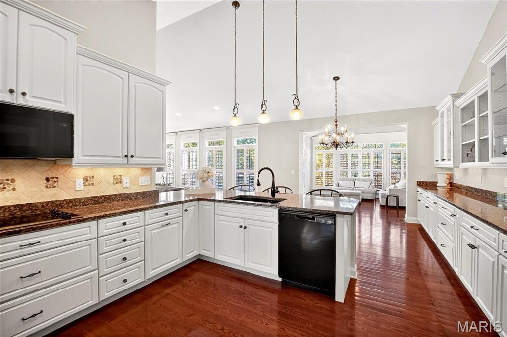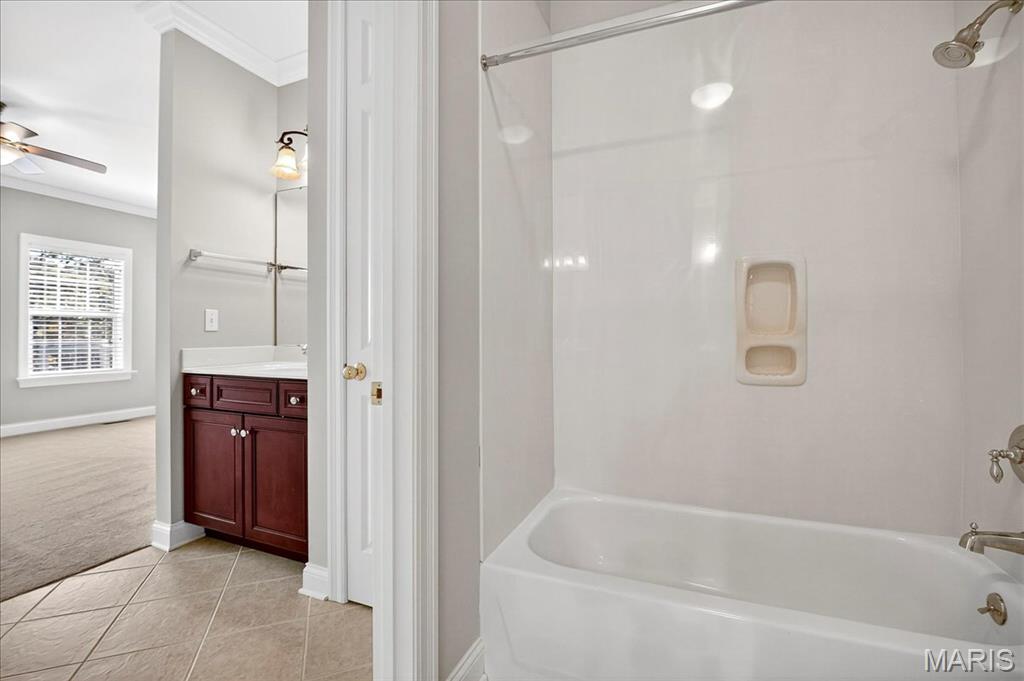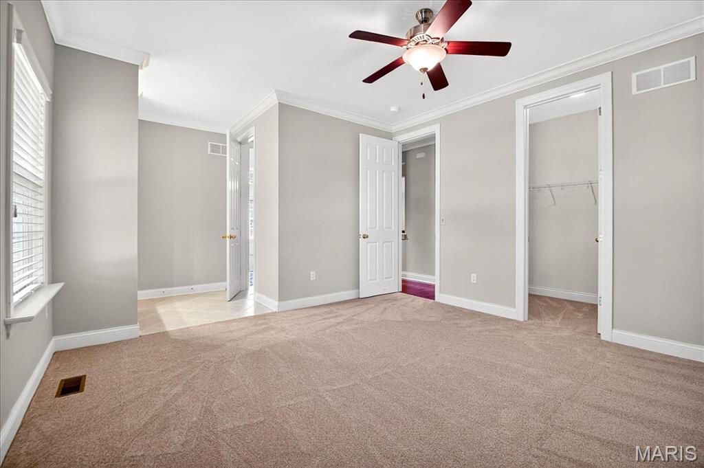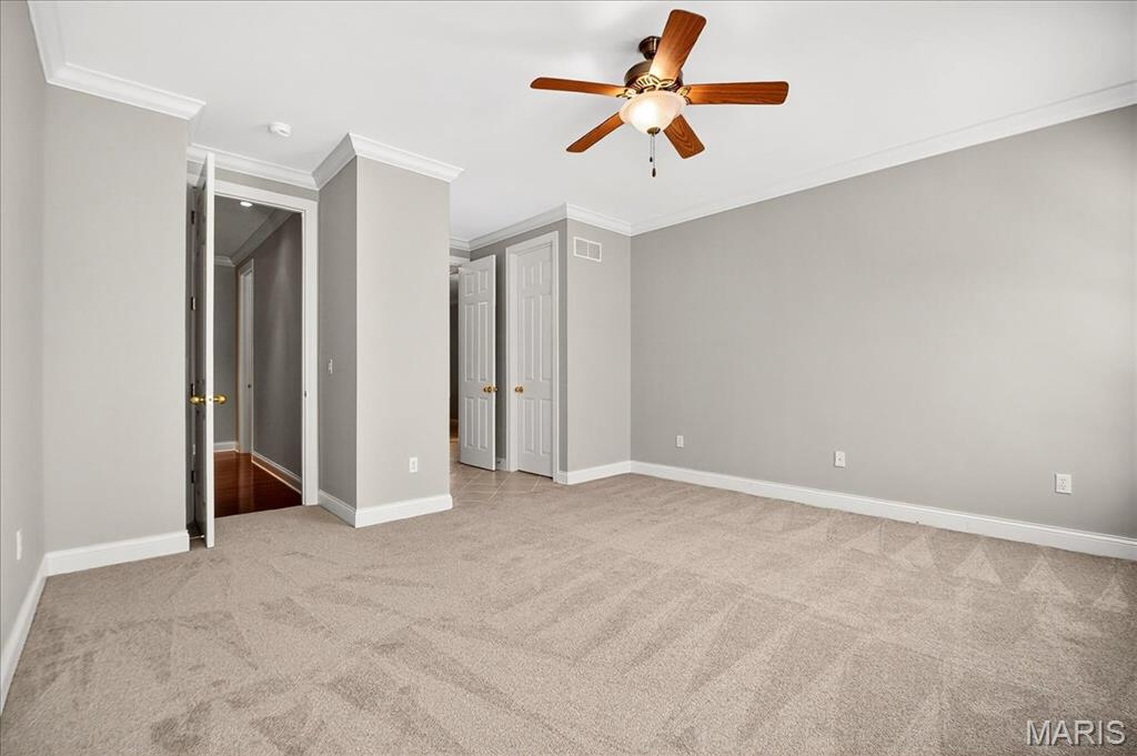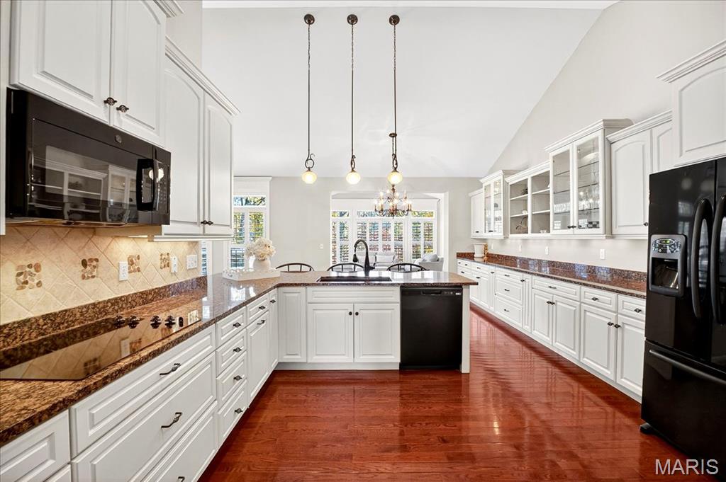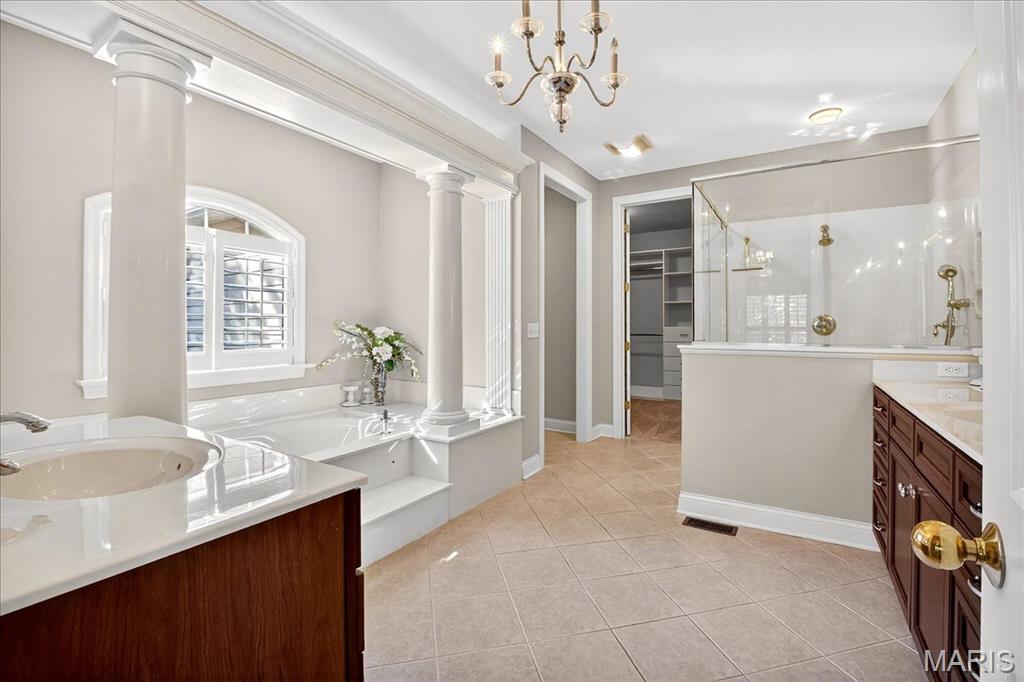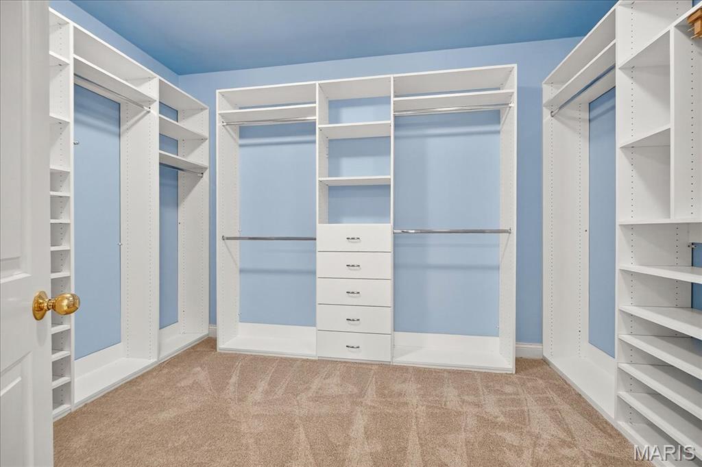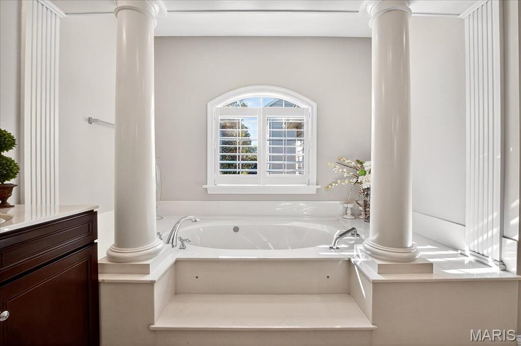 Esquisite Custom Built Hardesty home in the heart of Wildwood. This stunning ranch-style residence is a true showcase of craftsmanship and quality that only Hardesty Homes can deliver. Featuring an elegant brick-and-stone exterior with cement-hardboard siding, this 3-bedroom, 4.5-bath home blends timeless design with luxurious comfort. Step inside to discover exquisite details at every turn—fabulous crown molding, fluted door trim, handcrafted window casings, a lighted tray ceiling, two gas fireplaces, and gleaming hardwood floors. Cozy family room with built-in bookshelves, hardwood floors, a gas fireplace, and a wall of windows overlooking a private, treed lot. The expansive kitchen, with a walk-in pantry, ample cabinet space, and built-in lit niches, is perfect for entertaining and flows beautifully into a sun-drenched sunroom. Plantation shutters throughout, custom closets, a Jack-and-Jill bathroom, and a thoughtfully designed floor plan provide both beauty and functionality. The fully finished lower level offers even more living space, featuring a handcrafted custom wood bar with gorgeous detail, a bar with sink, dishwasher, and refrigerator, an additional family room, a game room, a second gas fireplace, plenty of room to add additional bedrooms or personalize the space to fit your lifestyle. Oversized 3-car garage with transom windows, all nestled on a private lot in the heart of Wildwood, this home offers the perfect balance of privacy, sophistication, and charm—a truly exceptional property where elegance is an understatement. The 4th main floor bedroom is currently being used an an office , can easily be converted back into a main floor bedroom.