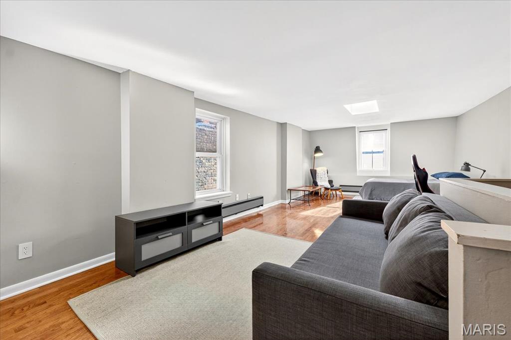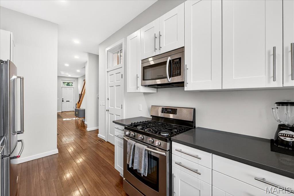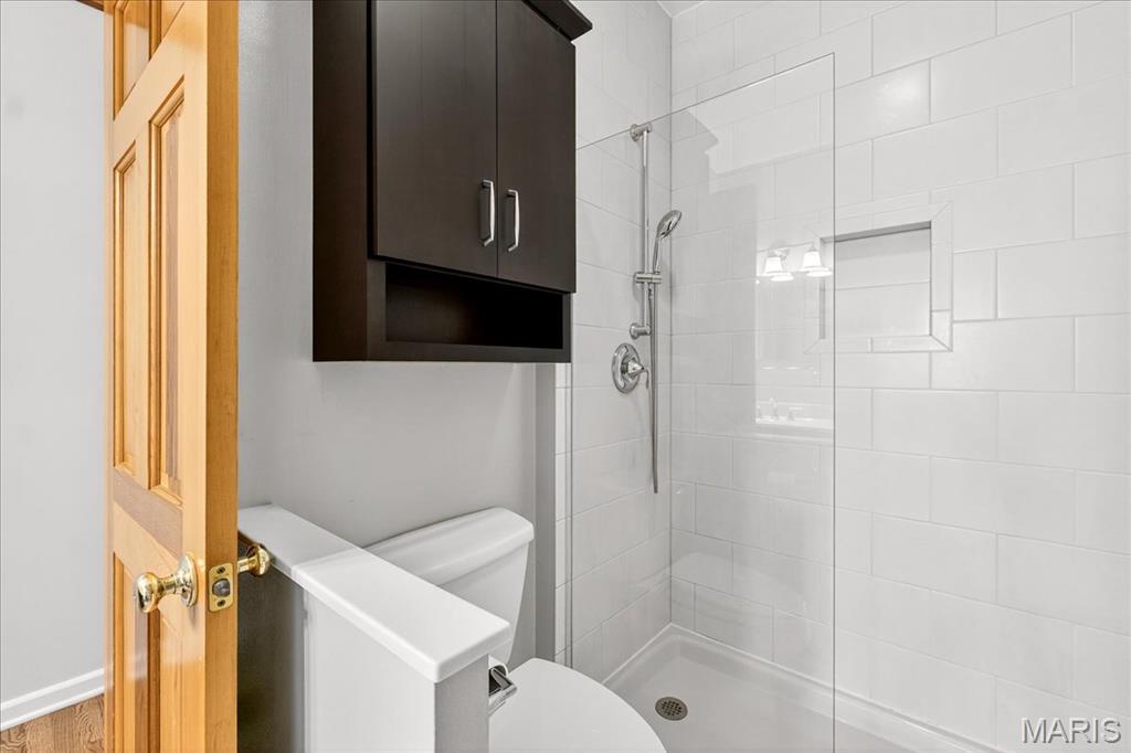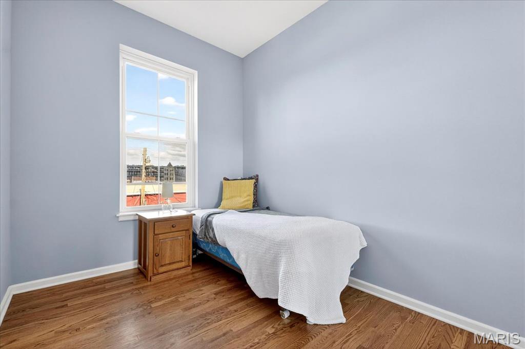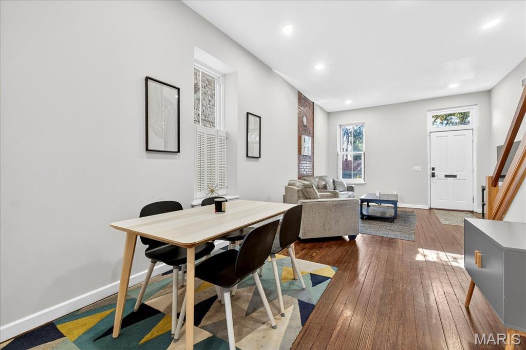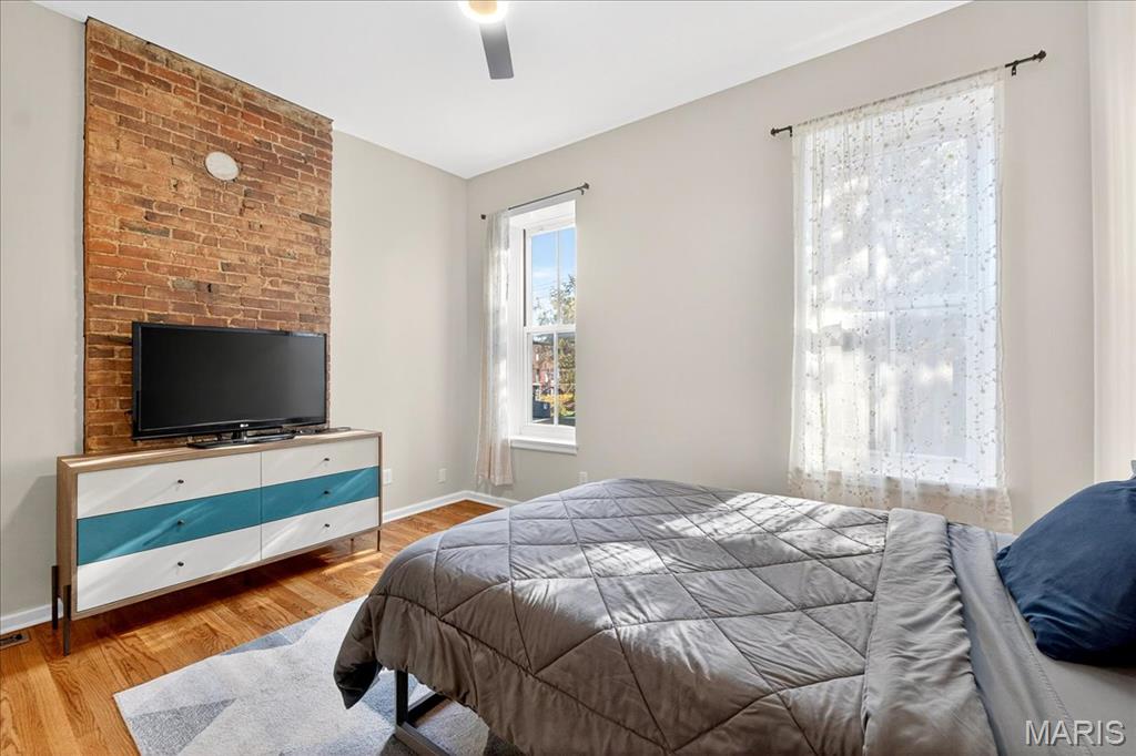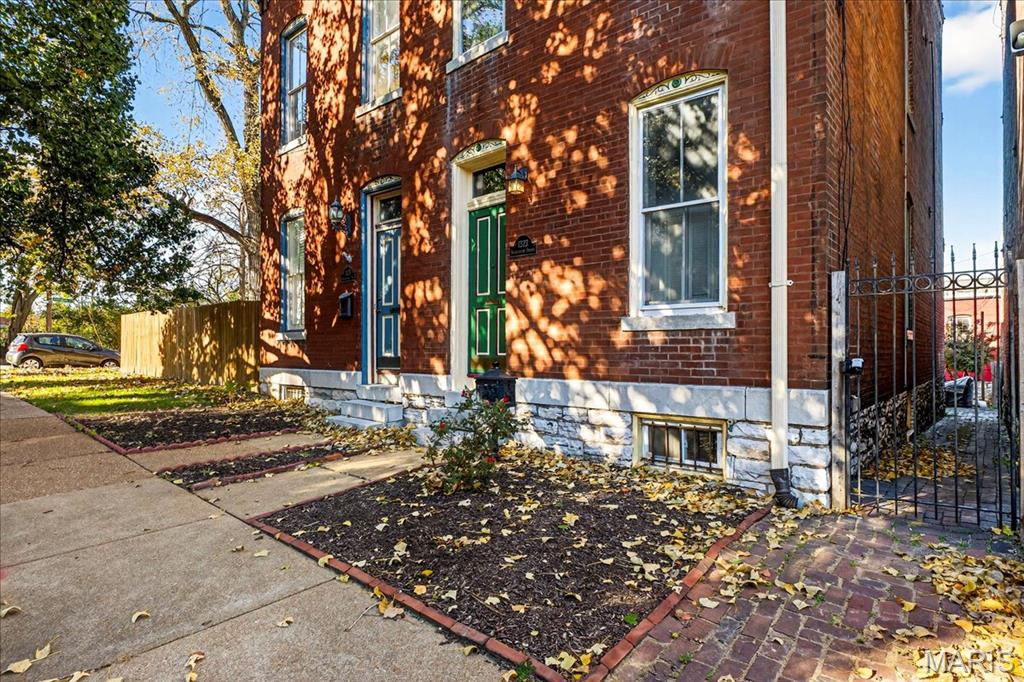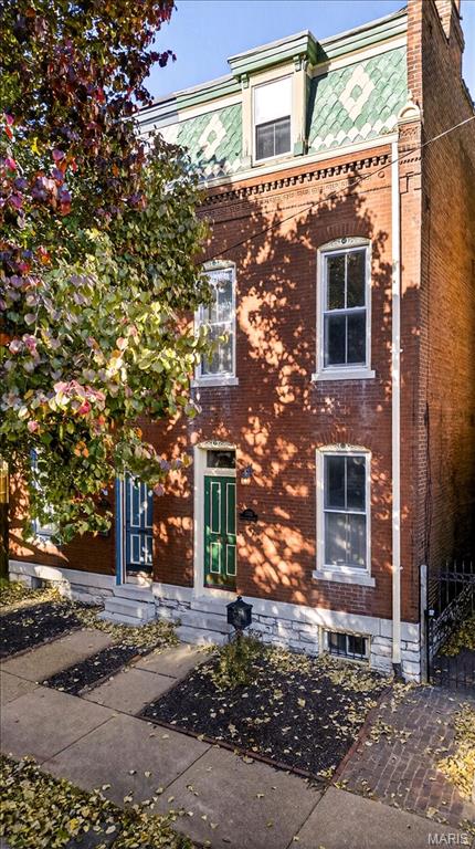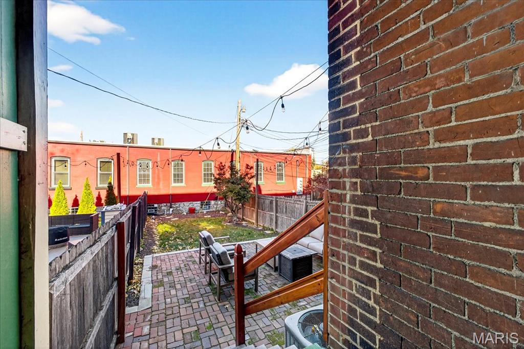 Welcome to this stunning Soulard gem! Built in 1917, this three-story home blends historic character with modern updates, offering an ideal primary residence or investment opportunity. From the moment you arrive, the classic curb appeal radiates the unmistakable Soulard charm. Step inside to soaring ceilings accented by recessed lighting, an exposed brick wall, and gleaming original hardwood floors. The spacious living room is filled with natural light and flows seamlessly into the dining area—perfect for entertaining. The main level also features a half bath and an upgraded kitchen complete with white cabinetry, solid-surface countertops, stainless steel appliances, and direct access to the fully fenced backyard. Upstairs, the second floor offers two bedrooms and a full bath. The first bedroom boasts a generous closet and private access to the bathroom, making it an excellent option for a primary suite. The second bedroom opens to a charming balcony overlooking the backyard. The full bath includes a beautifully tiled walk-in shower and dual access from the hallway and bedroom. The third floor is a showstopper—a versatile space that can serve as a large primary suite or a spacious recreation area. It features a walk-in closet, a large bathroom, and breathtaking views of the St. Louis Arch. Outside, the fenced backyard is designed for relaxation and entertaining, with a large brick patio and green space for gatherings or quiet evenings. This is a great opportunity provides Soulard history with modern comforts. WELCOME HOME!