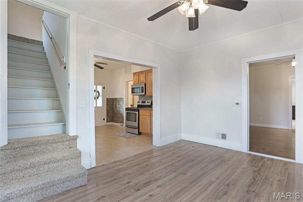 Welcome to this tastefully updated 4 bedroom 2 bathroom farmhouse on 1.8 +/- acres just outside the city limits of Ste. Genevieve. This home offers peaceful country views, a partially fenced yard, and multiple outbuildings including a two car detached garage with carport, storage shed, and a chicken coop with run, perfect for spring chickens. Inside, you'll find many recent updates. The main floor features a fully remodeled primary bedroom with hardwood floors and an updated bathroom with new fixtures. The kitchen includes custom cabinetry that accents the new floors well and opens up to a cozy sitting room that overlooks the property. The other bedroom on the main floor could serve as a great space for a family space or possible office as its right off the second bathroom and offers ample space. Upstairs offers two more bedrooms, a bonus room, and possible flex space for storage or maybe a hobby room. Major improvements include new windows, new siding, new water heater, new septic pump, and a 4 year old HVAC system. This charming farmhouse is move in ready and provides the perfect blend of updates, space, and entry to country living just minutes for town.