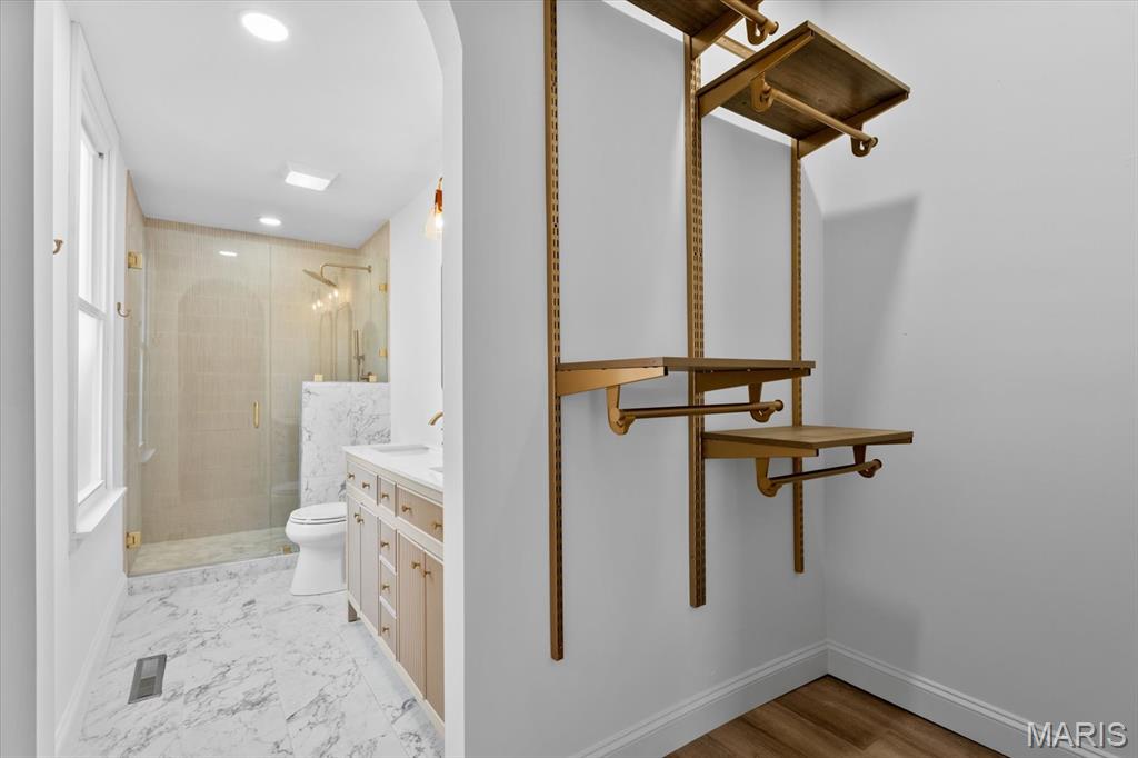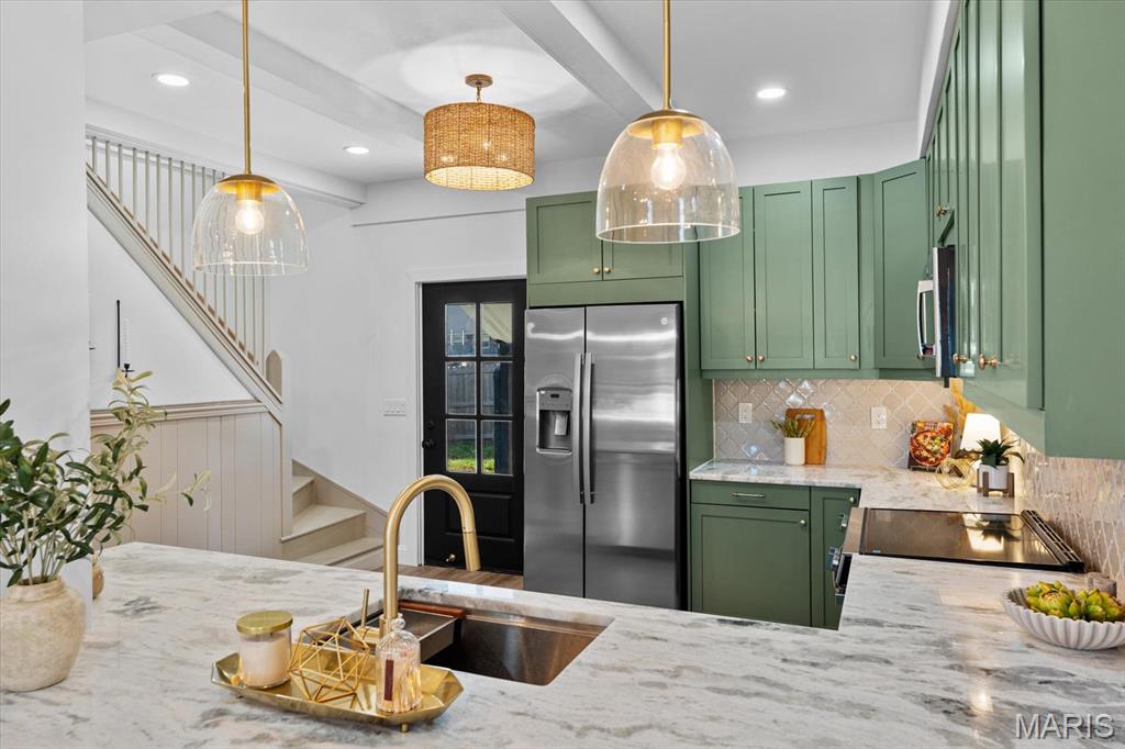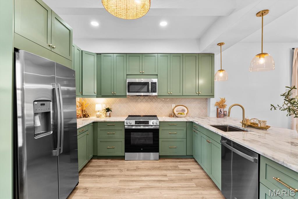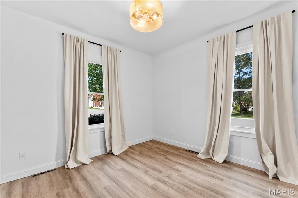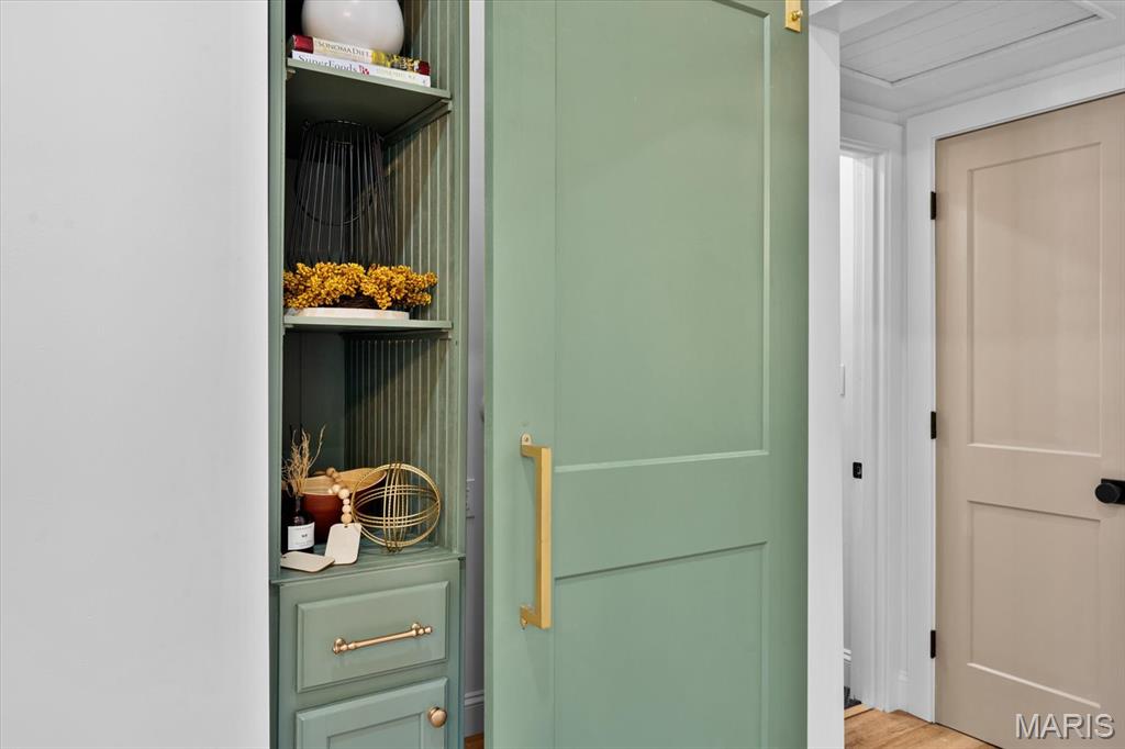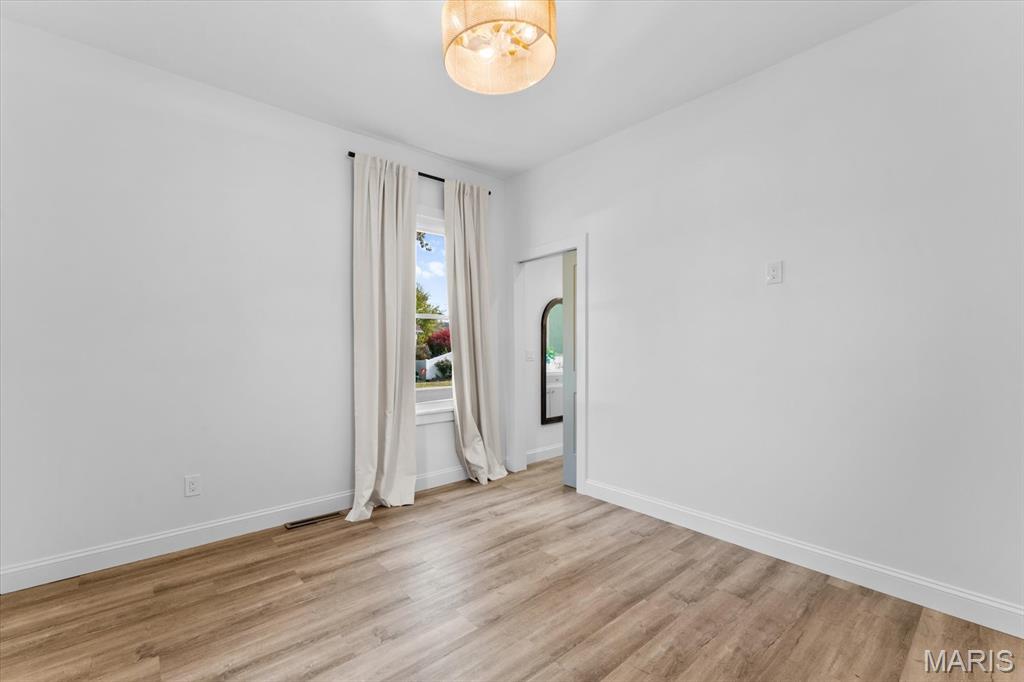 This stunning residence has undergone a full-scale, luxury renovation with no detail overlooked. The main level features new flooring and fresh paint throughout the light-filled living room, seamlessly connecting to an elegant, fully upgraded kitchen. The kitchen showcases on-trend custom-painted cabinetry, stainless steel appliances, a chic tile backsplash, brass hardware and fixtures, and modern lighting. A stylish barn-style sliding door leads to the main-floor laundry for added convenience. The main level primary suite offers a true retreat, complete with a custom pass-through closet and a beautifully appointed ensuite bath featuring a glass-enclosed walk-in shower and dual vanity sinks. A fully remodeled guest bath is also located on the main level for added comfort. Upstairs, you'll find two well-appointed guest bedrooms, perfect for family or visitors. Outside, a covered patio provides an ideal space for entertaining and overlooks the fenced backyard with storage shed. This home blends historic charm with modern luxury—an exceptional opportunity to live in one of O’Fallon’s most desirable locations.