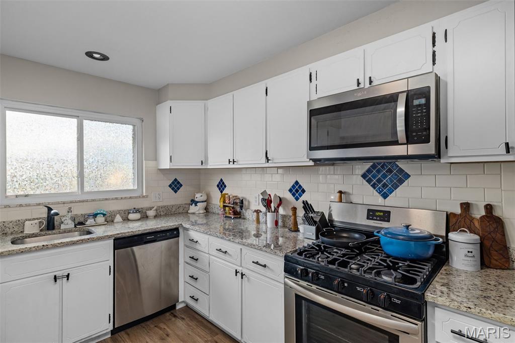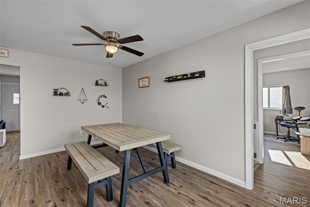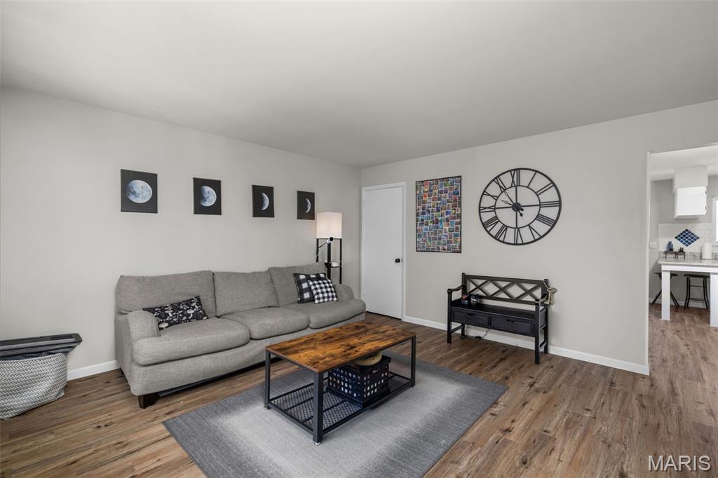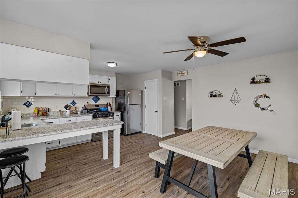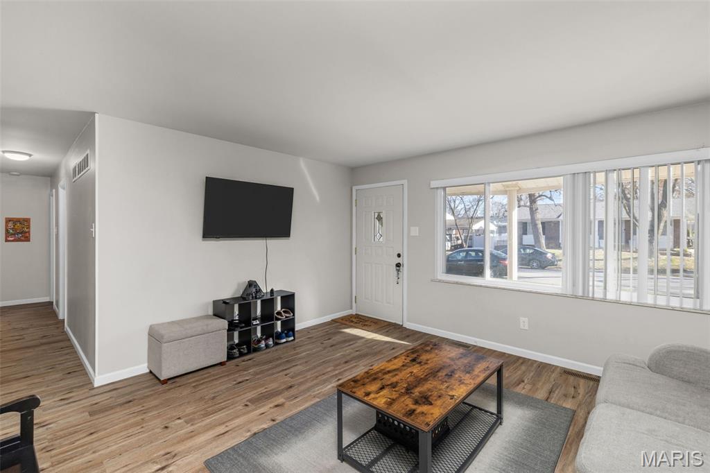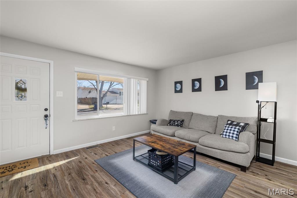 Look no further than this updated ranch in St. Peters! A brick front and large covered porch welcome you inside to the bright living room. You'll love the wide-plank flooring that runs throughout the home. The open layout of the kitchen an dining room is perfect for gathering with friends and family, complete with granite counters, breakfast bar, white cabinets, stainless steel appliances, and tile backsplash. The primary bedroom has dual closets and an en suite half bathroom. Two more spacious bedrooms and a full bath with tile floors, large vanity, and a step-in tile-surround shower complete the main level. The finished basement nearly doubles your living space, with an L-shaped family room featuring built-in bookshelves, plus unfinished space for storage. Enjoy grilling on the covered patio, overlooking the fenced backyard. You'll be in a great location, just moments from all of the shopping and restaurants along Mid Rivers Mall and Mexico Road, with quick access to I-70 and nearby schools and parks. This home is one you won't want to miss!