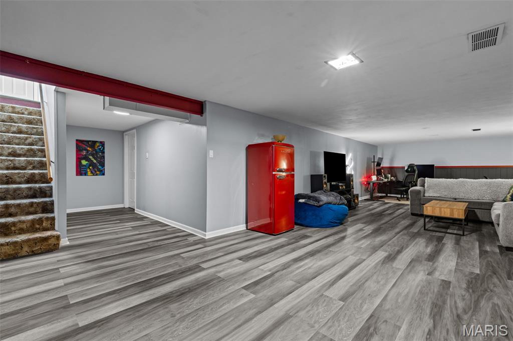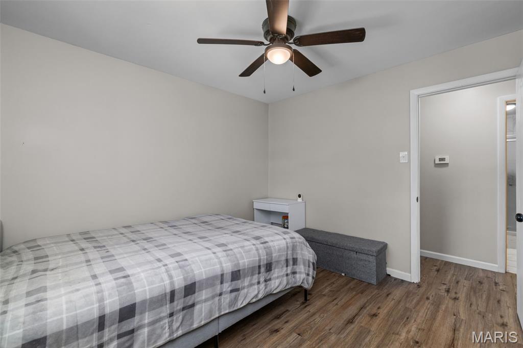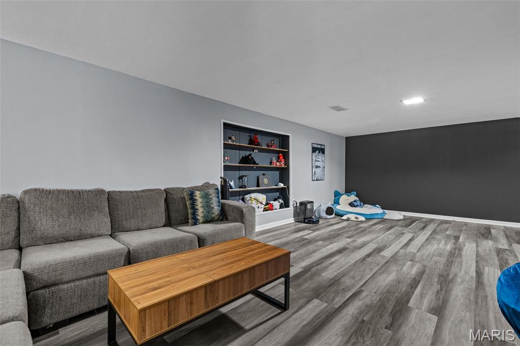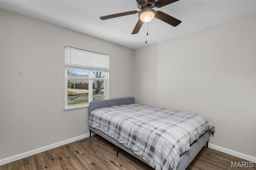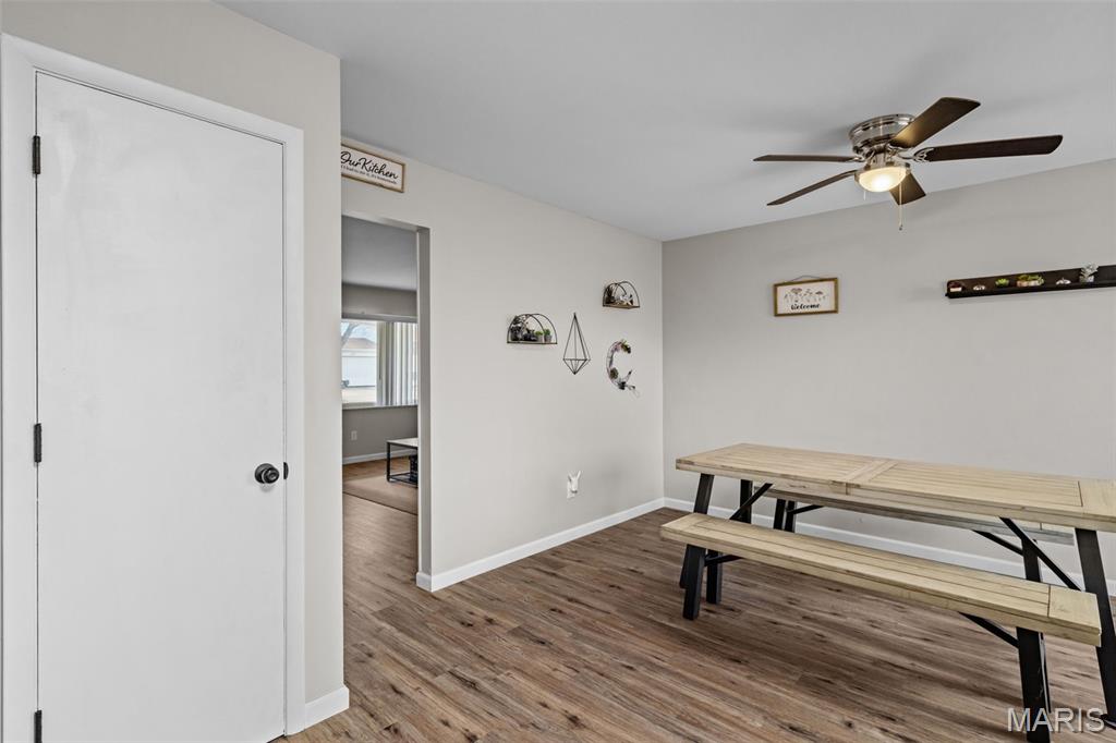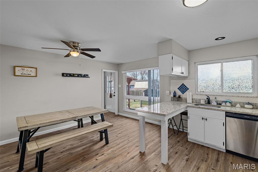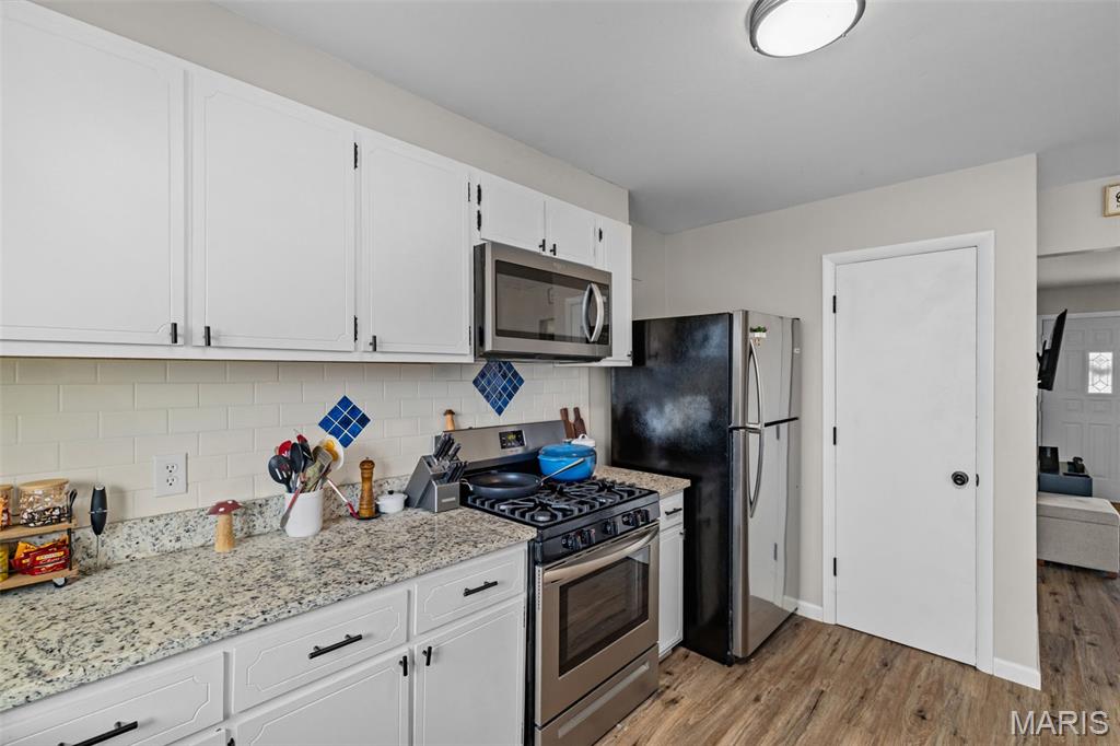 Look no further than this updated ranch in St. Peters! A brick front and large covered porch welcome you inside to the bright living room. You'll love the wide-plank flooring that runs throughout the home. The open layout of the kitchen an dining room is perfect for gathering with friends and family, complete with granite counters, breakfast bar, white cabinets, stainless steel appliances, and tile backsplash. The primary bedroom has dual closets and an en suite half bathroom. Two more spacious bedrooms and a full bath with tile floors, large vanity, and a step-in tile-surround shower complete the main level. The finished basement nearly doubles your living space, with an L-shaped family room featuring built-in bookshelves, plus unfinished space for storage. Enjoy grilling on the covered patio, overlooking the fenced backyard. You'll be in a great location, just moments from all of the shopping and restaurants along Mid Rivers Mall and Mexico Road, with quick access to I-70 and nearby schools and parks. This home is one you won't want to miss!