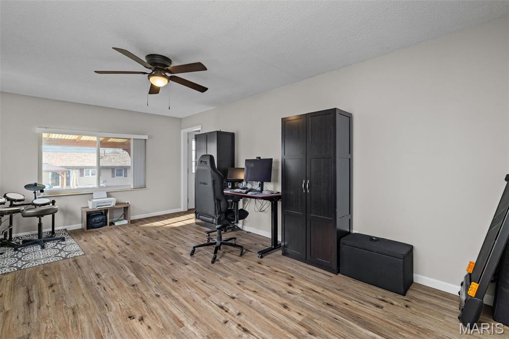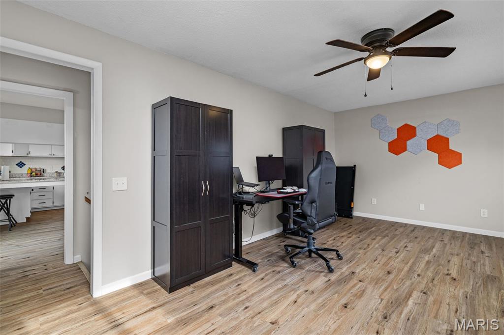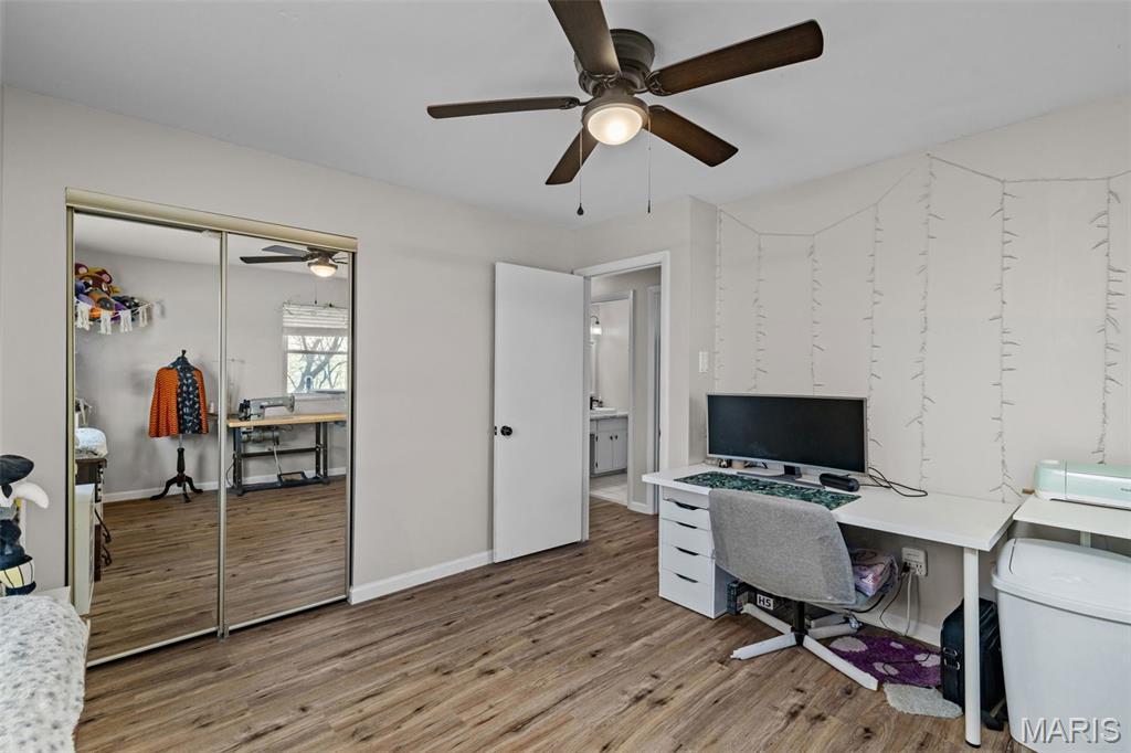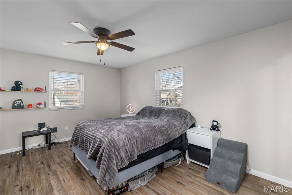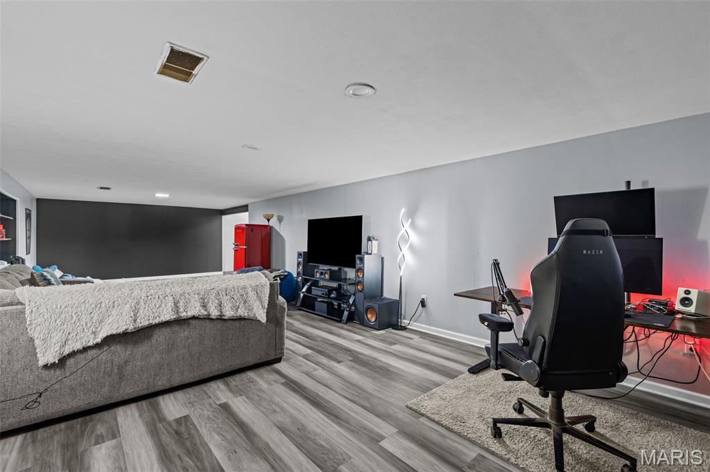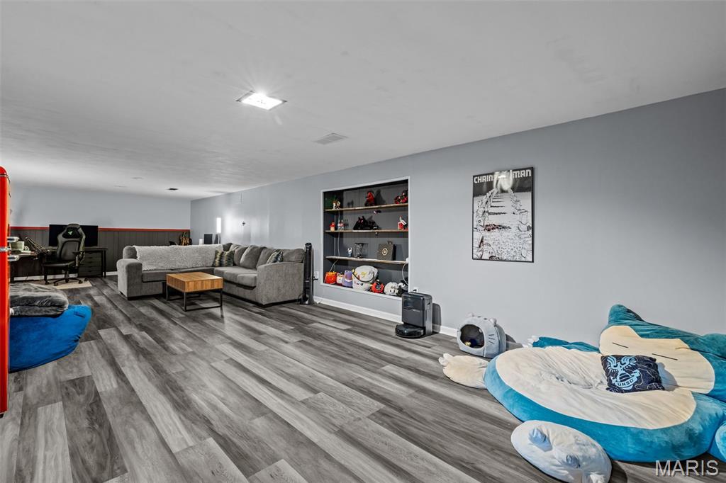 Look no further than this updated ranch in St. Peters! A brick front and large covered porch welcome you inside to the bright living room. You'll love the wide-plank flooring that runs throughout the home. The open layout of the kitchen an dining room is perfect for gathering with friends and family, complete with granite counters, breakfast bar, white cabinets, stainless steel appliances, and tile backsplash. The primary bedroom has dual closets and an en suite half bathroom. Two more spacious bedrooms and a full bath with tile floors, large vanity, and a step-in tile-surround shower complete the main level. The finished basement nearly doubles your living space, with an L-shaped family room featuring built-in bookshelves, plus unfinished space for storage. Enjoy grilling on the covered patio, overlooking the fenced backyard. You'll be in a great location, just moments from all of the shopping and restaurants along Mid Rivers Mall and Mexico Road, with quick access to I-70 and nearby schools and parks. This home is one you won't want to miss!