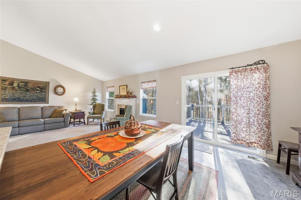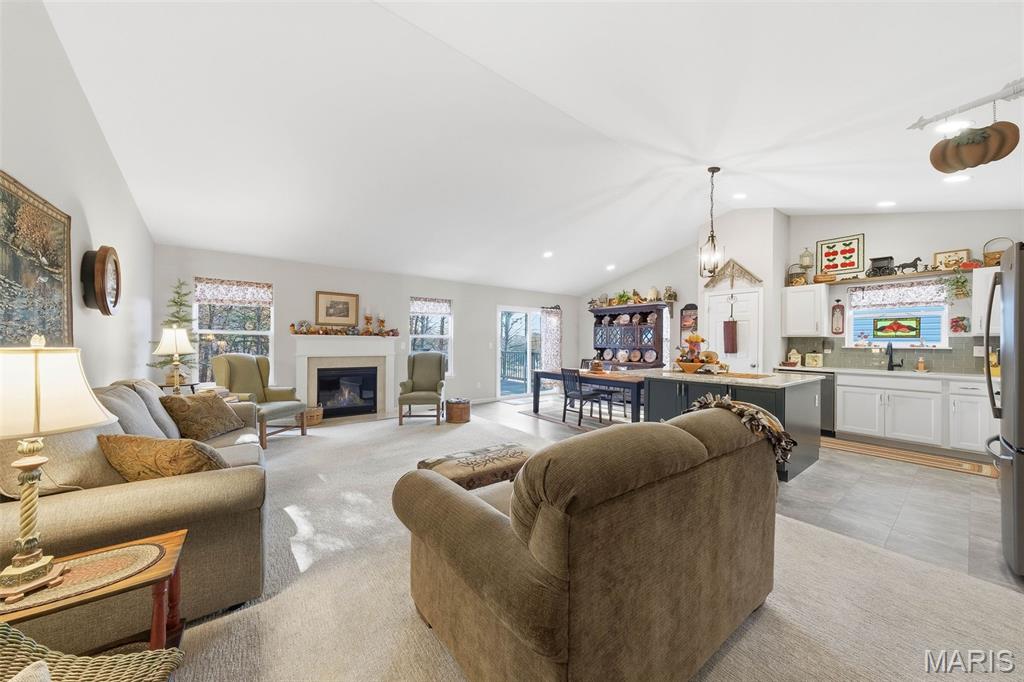 Welcome to 5634 Sun Bear Drive — where modern comfort meets small-town charm! This beautiful home in the sought-after Bear Ridge subdivision offers 1,844 square feet of thoughtfully designed living space, ideal for both everyday living and entertaining. The open-concept layout features a vaulted ceiling in the great room, filling the space with natural light and creating an inviting atmosphere around the cozy fireplace. The kitchen is a true centerpiece, showcasing sleek cabinetry, quartz countertops, a large island, and a seamless flow into the dining and living areas — perfect for gathering with family and friends. The expansive primary suite is a retreat of its own, offering generous space for a sitting area or home office, along with a private bath and walk-in closet. Two additional bedrooms and a full hall bath complete the main level. The walkout basement provides room for future expansion or storage, while the composite deck overlooks a beautiful, unique backyard view of mature trees and open sky. Enjoy the peaceful surroundings and neighborhood walking trails, all within easy reach of schools, parks, and local amenities.