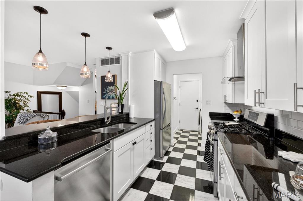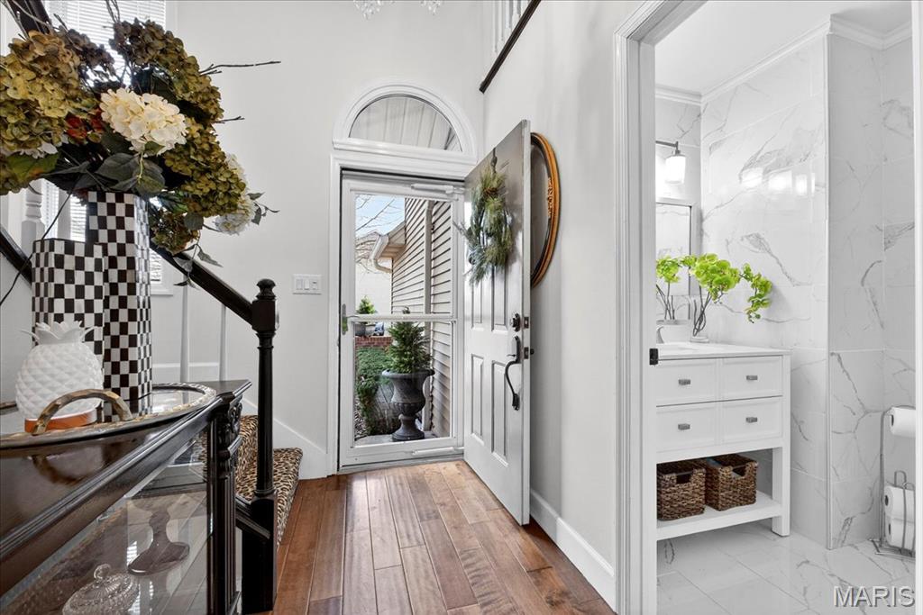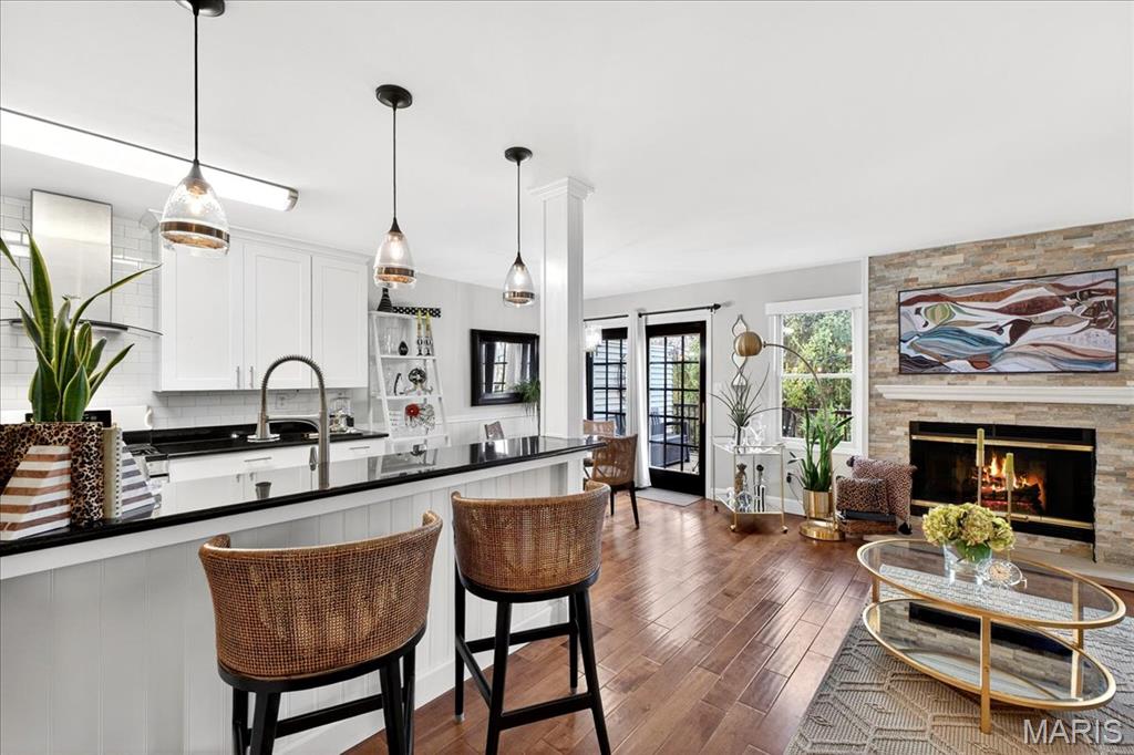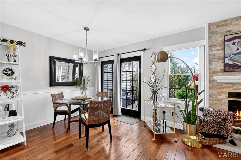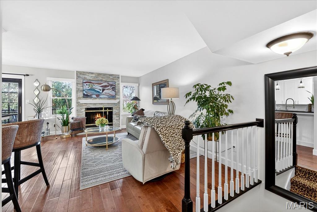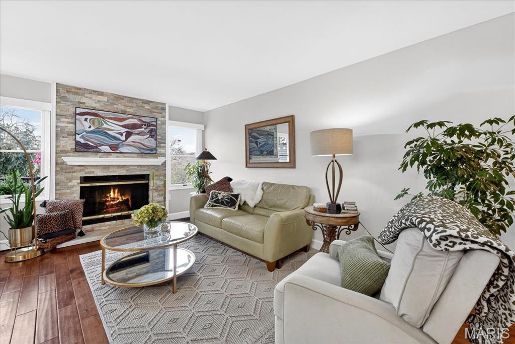 OPEN SUNDAY 1-3! Experience comfort and style in this beautifully updated townhome with a dramatic two-story entry, white 42 in. shaker kitchen cabinets, many with pull out drawers, granite countertops, stainless steel appliances, and hardwood floors throughout most of the main living areas. The living room features a stack stone gas fireplace, while the main floor also includes a convenient updated half bath and access to a newly replaced, low-maintenance deck overlooking private wooded views. Upstairs, the oversized primary suite impresses with vaulted ceilings, double closets with custom inserts, and a luxurious updated ensuite featuring a large walk-in shower and generous vanity area. A second bedroom and full bathroom complete the upper level. The finished lower-level rec room offers flexible space for entertaining or relaxation. Perfectly located just minutes from shopping, dining, parks, and the Chesterfield Amphitheater, this home also offers incredible community amenities, including a sparkling pool, landscaping, new roof and snow maintenance, and meticulously maintained common grounds. Move in and enjoy low-maintenance, effortless living in one of Chesterfield’s most sought-after communities!