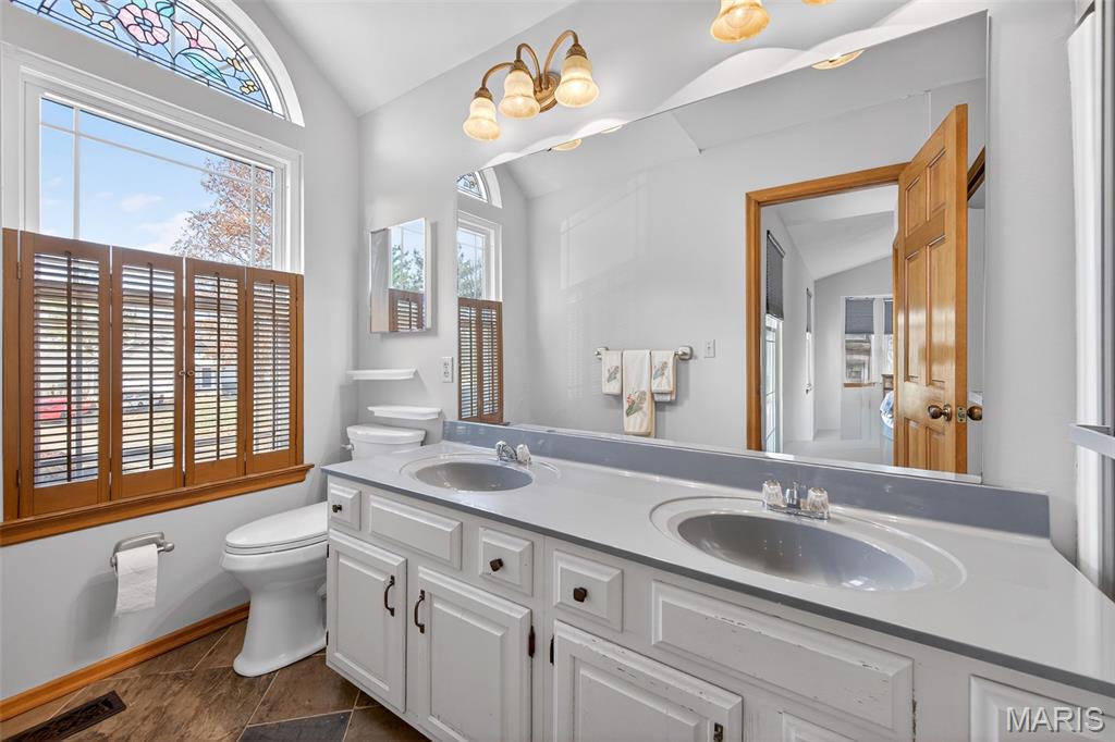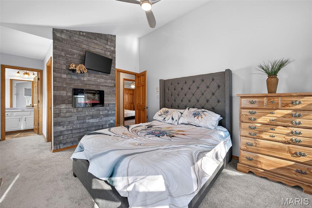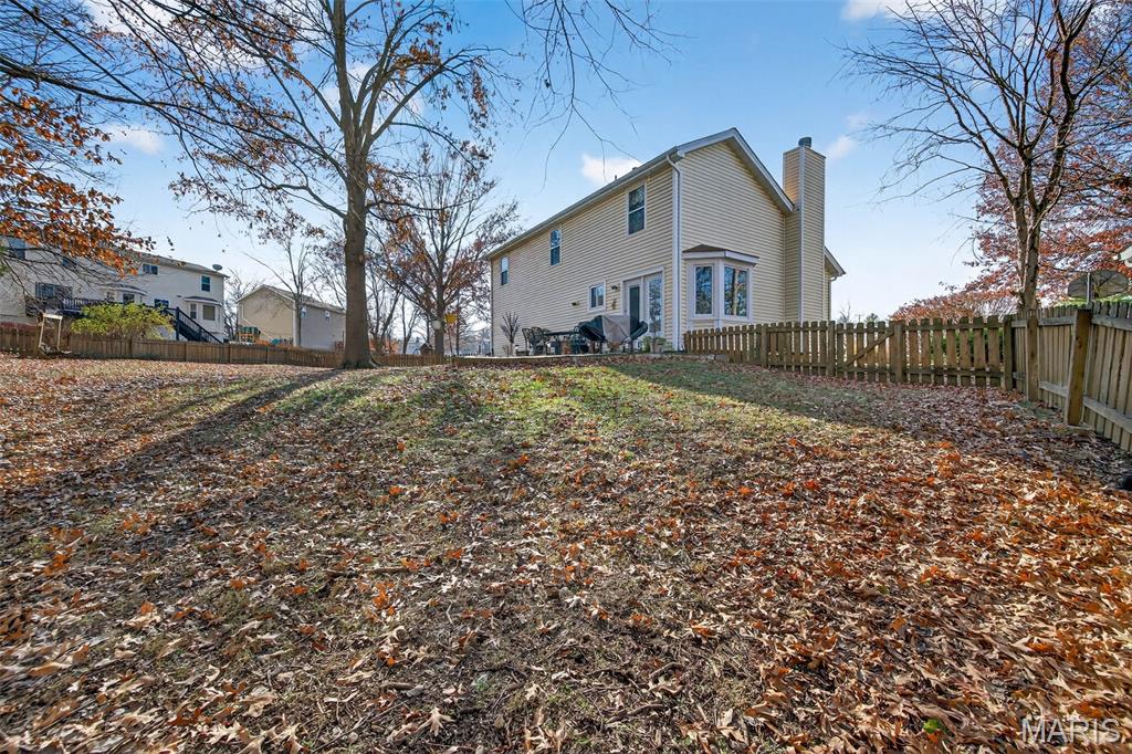 Prime location, Hwy 40/Hwy 94! Great Two story home, located on a cul de sac, with brick and vinyl exterior and large fenced in backyard with patio. Beautiful entry door, leads to the great room that is vaulted and has wood burning fireplace and lovely wood flooring. The breakfast room also has wood flooring and a bay window. The kitchen features a breakfast bar, granite counters, wood cabinets with knobs + pulls, stainless steel appliance and door to the laundry. There are 3 bedrooms upstairs and a loft, all with newer carpeting. The primary suite is vaulted with a bay window for added space and has a decorative electric fireplace. The primary bathroom has 2 sinks and a shower, plus a cute 1/2 round stain glass window. The lower level has a finished family room and plenty of storage. There is a pond a couple of doors down, great spot to relax and enjoy the view.
