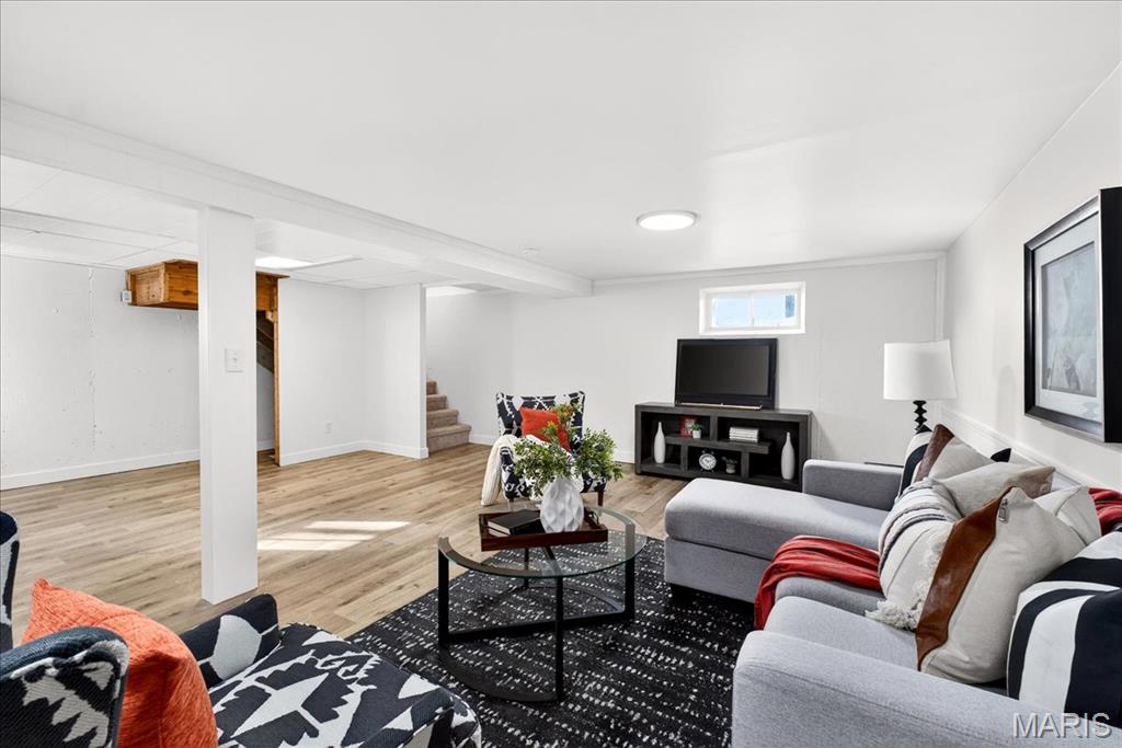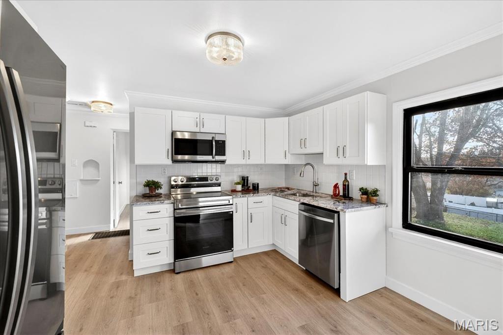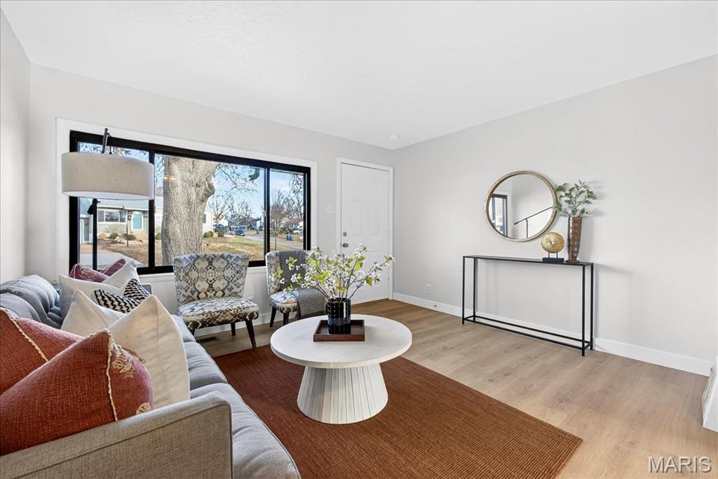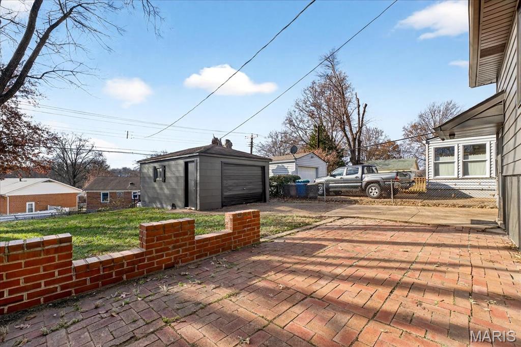 Beautifully updated and move-in ready, this charming St. Louis ranch offers a perfect blend of modern style and comfortable living. Step inside to an inviting open layout featuring new flooring, fresh paint, and abundant natural light throughout. The fully renovated kitchen includes white shaker cabinets, granite solid-surface countertops, tile backsplash, stainless-steel appliances, and a bright dining area that flows into the spacious living room. The main level offers three nicely sized bedrooms and a refreshed full bath with classic tile and updated finishes. The partially finished lower level adds incredible extra living space—ideal for a family room, home office, playroom, or guest area—plus a bonus room, new carpeting, and ample storage. Outside, enjoy a large patio perfect for outdoor entertaining, a fenced yard with room to play, and a detached garage for secure parking or workshop needs. Additional highlights include updated lighting, main systems in great condition, and a long driveway for convenient off-street parking. Located in a quiet neighborhood close to parks, schools, shops, and major highways, this home delivers modern updates, thoughtful improvements, and exceptional value. Nothing left to do but move in and enjoy!