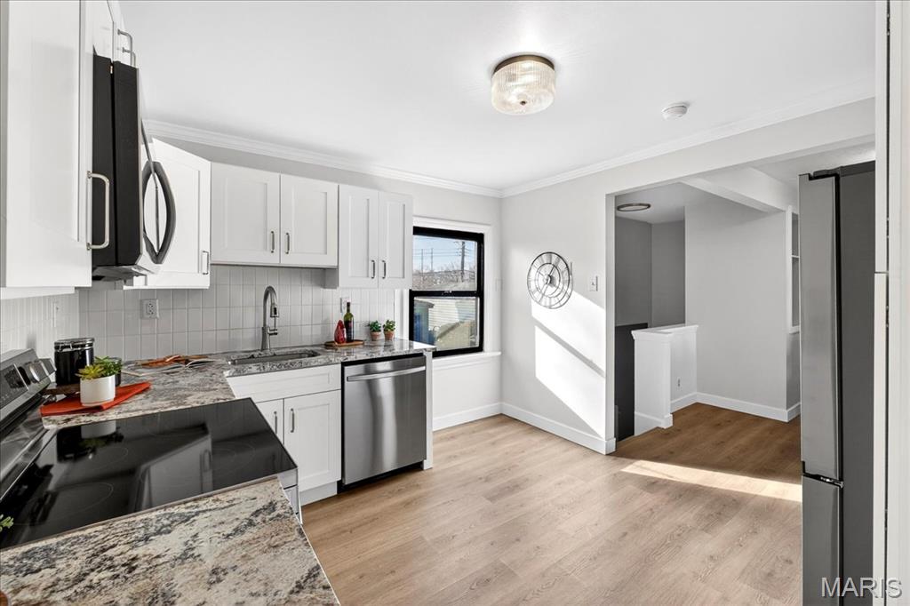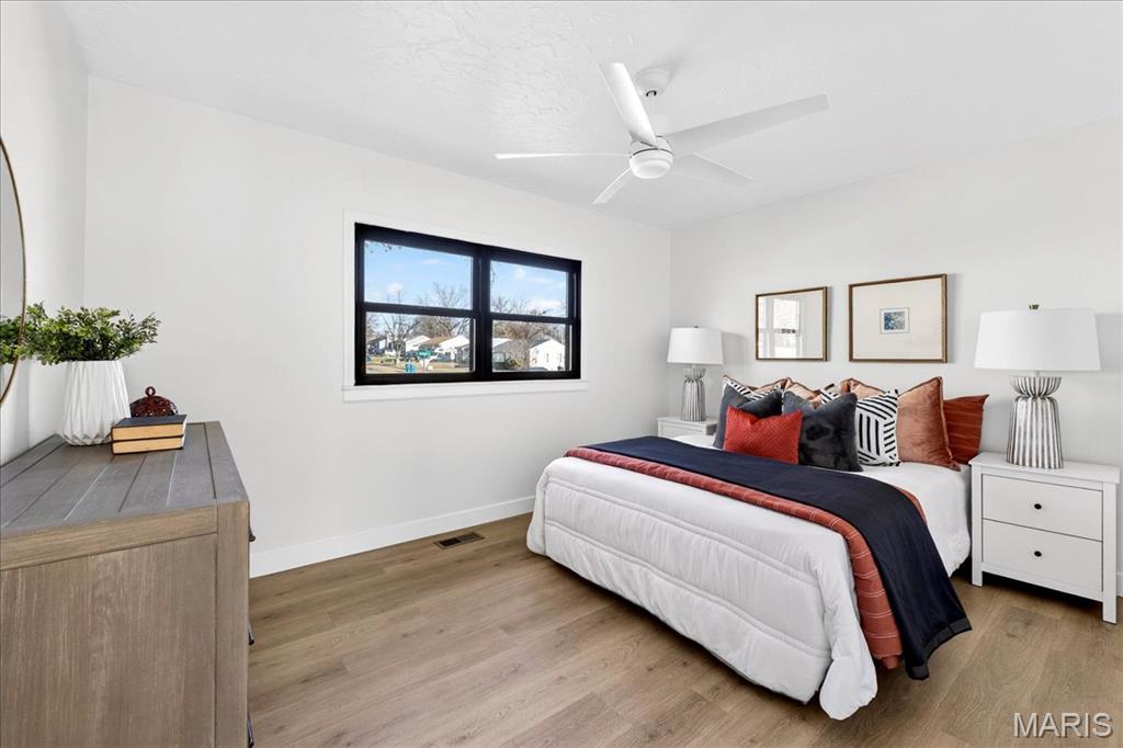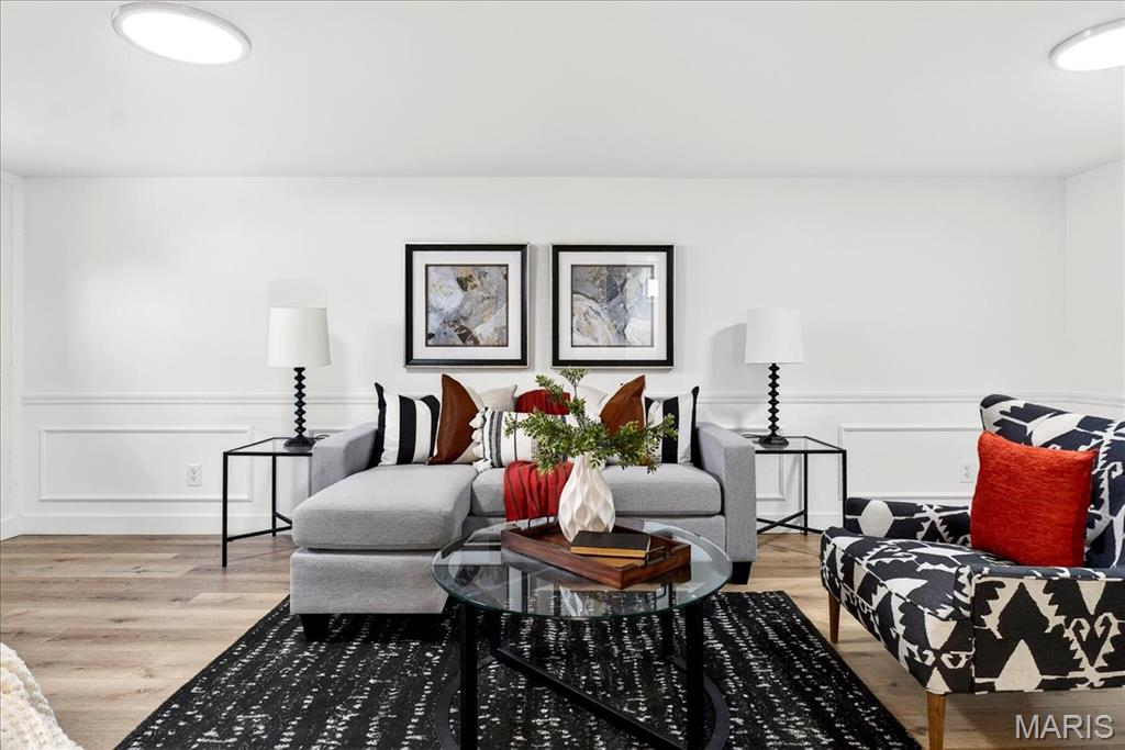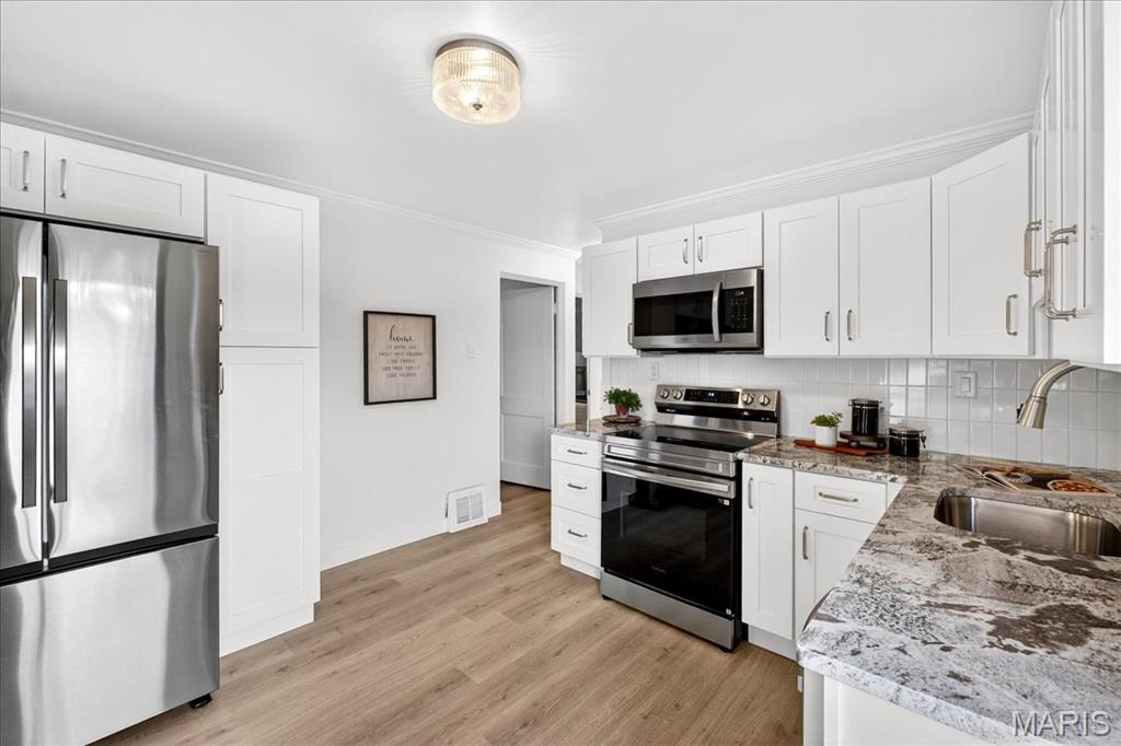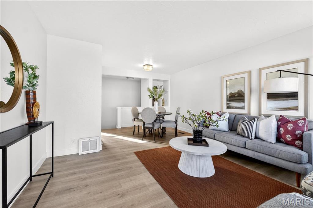 Beautifully updated and move-in ready, this charming St. Louis ranch offers a perfect blend of modern style and comfortable living. Step inside to an inviting open layout featuring new flooring, fresh paint, and abundant natural light throughout. The fully renovated kitchen includes white shaker cabinets, granite solid-surface countertops, tile backsplash, stainless-steel appliances, and a bright dining area that flows into the spacious living room. The main level offers three nicely sized bedrooms and a refreshed full bath with classic tile and updated finishes. The partially finished lower level adds incredible extra living space—ideal for a family room, home office, playroom, or guest area—plus a bonus room, new carpeting, and ample storage. Outside, enjoy a large patio perfect for outdoor entertaining, a fenced yard with room to play, and a detached garage for secure parking or workshop needs. Additional highlights include updated lighting, main systems in great condition, and a long driveway for convenient off-street parking. Located in a quiet neighborhood close to parks, schools, shops, and major highways, this home delivers modern updates, thoughtful improvements, and exceptional value. Nothing left to do but move in and enjoy!