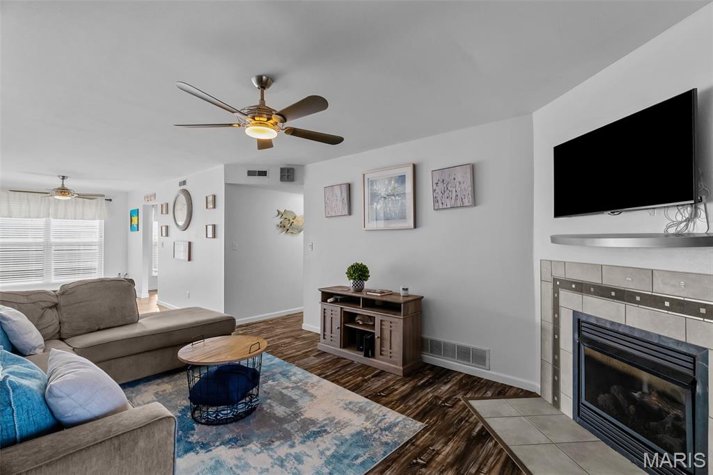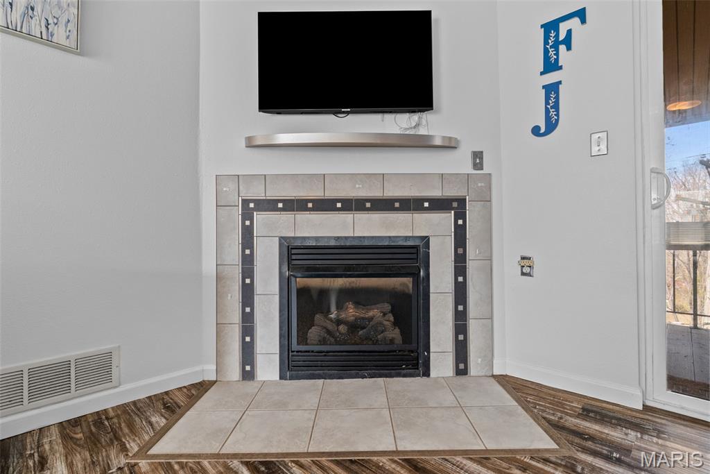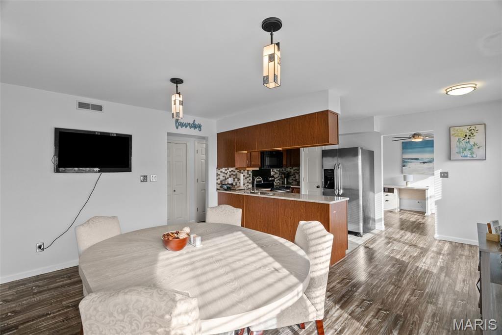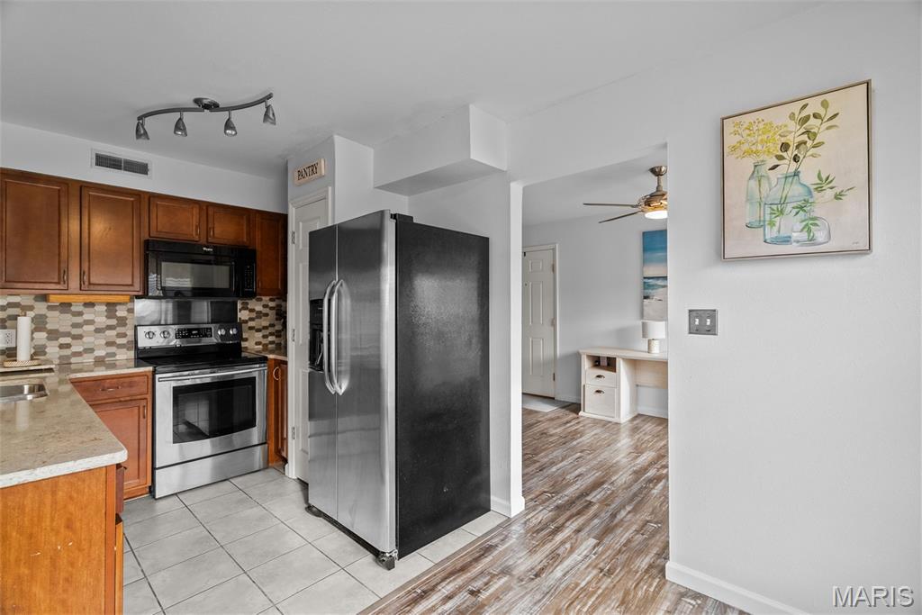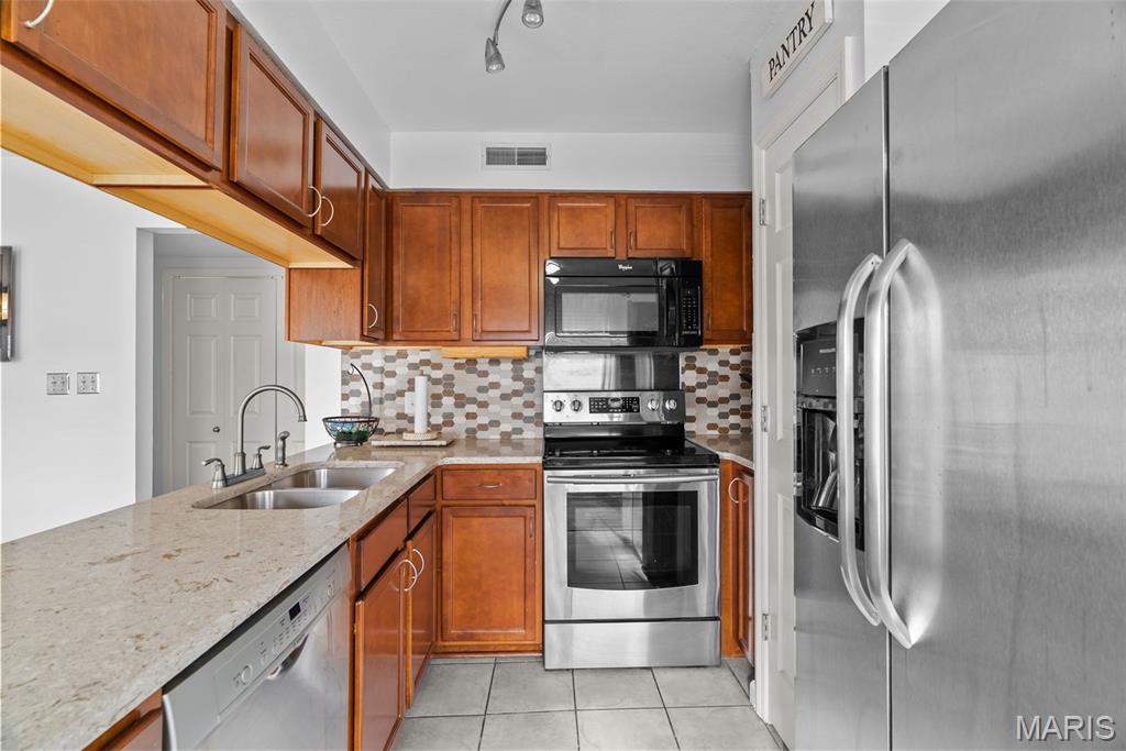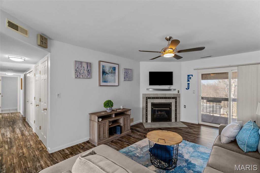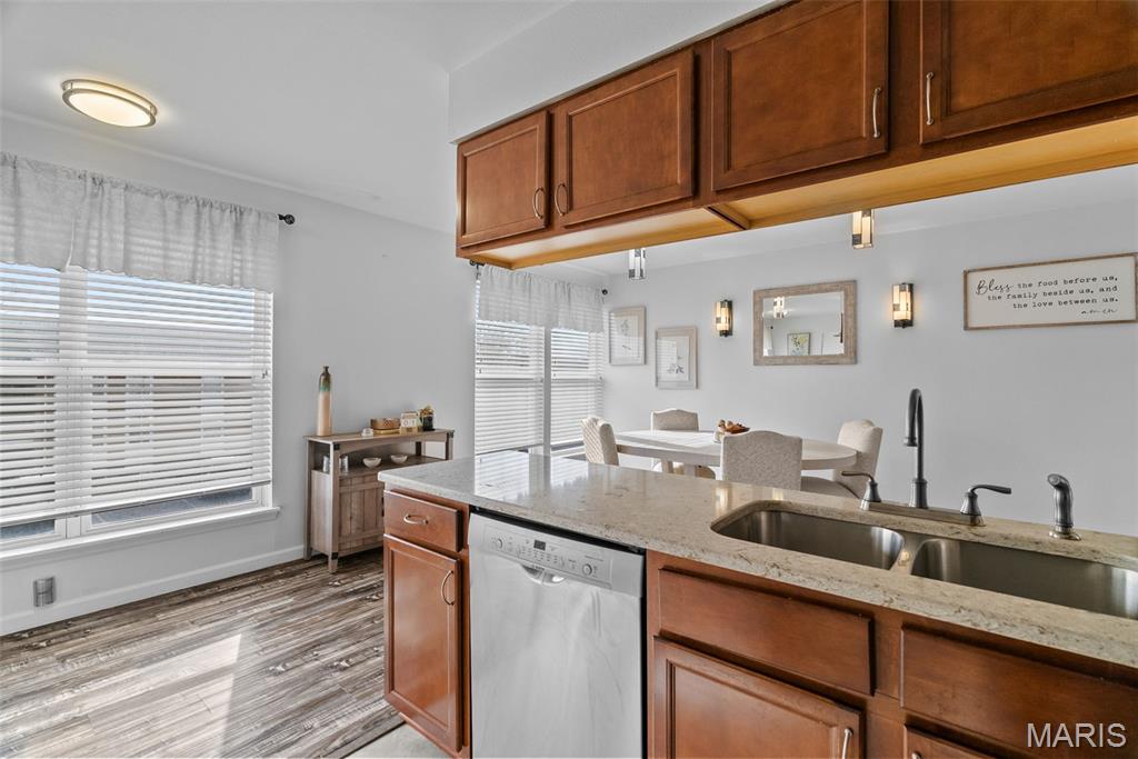 Welcome to this beautifully updated top-level unit in Kirkwood's Greenbriar Condominiums! You'll love the bright living room with a charming exposed brick wall, cozy corner gas fireplace with tile surround, and sliding glass doors leading to the covered deck. The light-filled, open kitchen and dining room is perfect for hosting gatherings! Thoughtfully designed updates include granite counters, stainless steel appliances, tile flooring and backsplash. The dining room is accented by stained-glass lighting and wall sconces. The primary bedroom has a walk-in closet and convenient in-unit laundry hook-ups, and an en suite bath. Both the primary and secondary bathrooms have been updated with granite-top vanities, stylish lighting, and feature tile-surround tubs. A second bedroom completes the space. Enjoy community amenities: the pool overlooking the pond and fountain, clubhouse/exercise facilities, tennis/basketball court, and walking trails, as well as the peace of mind knowing that landscaping, snow removal, water, sewer, trash, and an assigned basement storage unit are covered in the condo fees. You'll be just moments from highways, schools, parks, and all of the shopping and restaurants that Kirkwood has to offer! Don't miss out!