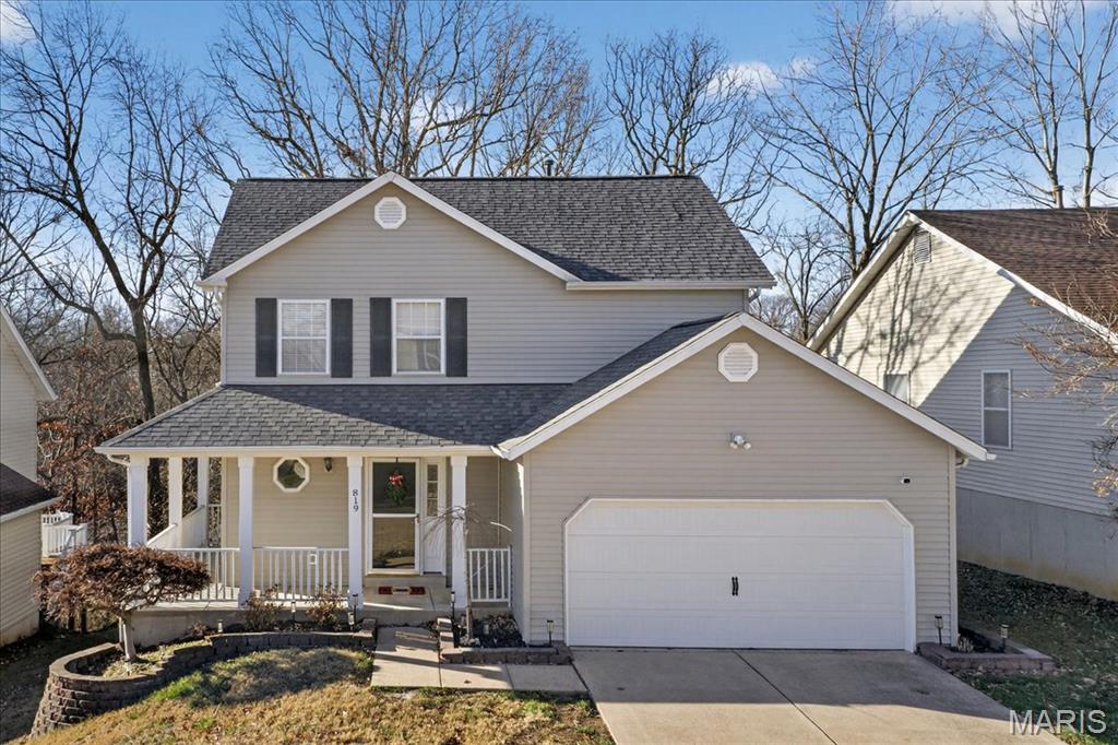 Tucked away on a quiet cul-de-sac, this outstanding two-story luxury home offers a rare blend of privacy, elegance, and everyday comfort. A wraparound front porch and exceptional curb appeal invite you in, while serene wooded views create a peaceful, treehouse-like setting. Step inside to a wonderful open floor plan featuring beautiful flooring, refined color palettes, and stunning light fixtures throughout. The spacious kitchen is designed to impress with granite countertops, stainless steel appliances, and generous workspace—perfect for both entertaining and daily living. The home offers three bedrooms, including a large primary suite with abundant closet space and granite vanity tops. Enjoy three full levels of living space, including a high-quality finished lower level ideal for relaxing, hosting, or working from home. Outside, a private deck overlooks tranquil woods, providing a secluded retreat surrounded by nature. Recent updates include a new roof, vinyl siding, fresh landscaping, and a new garage door, complementing the attached two-car garage. Conveniently located near highways, shopping, parks, and trails, this home delivers luxury, privacy, and accessibility—an exceptional place to call home.