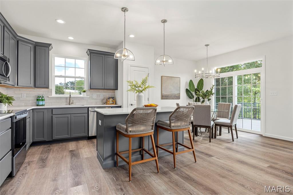 Easy living meets elevated style in this beautiful, move-in-ready villa. home to this stunning 3-bedroom, 2-bath ranch-style villa offering a spacious, open floor plan and a 9’ walk-out basement. Inside, you’ll find 9’ ceilings throughout, a bright great room, an inviting breakfast area, and large windows that flood the home with natural light. The kitchen features a large granite island, 42” soft-close cabinetry, and ample storage—perfect for everyday living and entertaining. The spacious primary suite is a true retreat with an impressive walk-in closet, linen closet, and a luxurious bath featuring a tall double vanity, marble surround shower with a built-in seat, and elegant finishes. Convenient main-floor laundry adds to the home’s thoughtful design. The walk-out basement opens to a large concrete patio, ideal for relaxing or hosting guests. Tucked away on a cul-de-sac, this beautiful villa offers truly easy living with lawn care and snow removal included through the HOA. Don’t miss the opportunity to own a move-in-ready home without the new construction timeline!