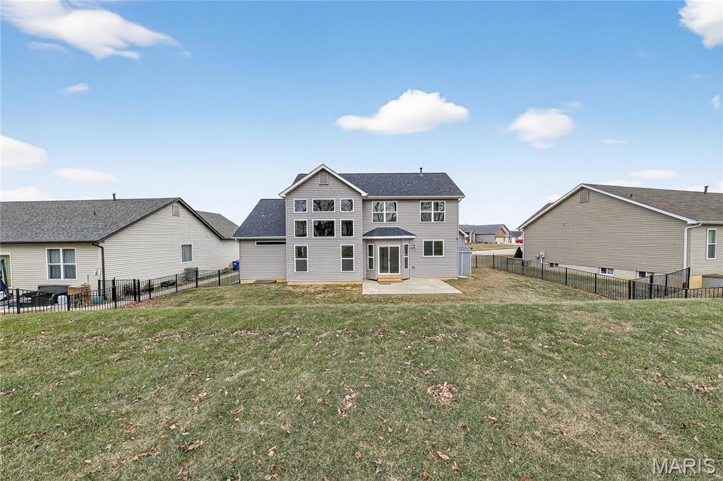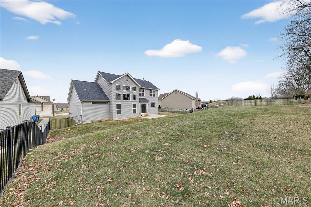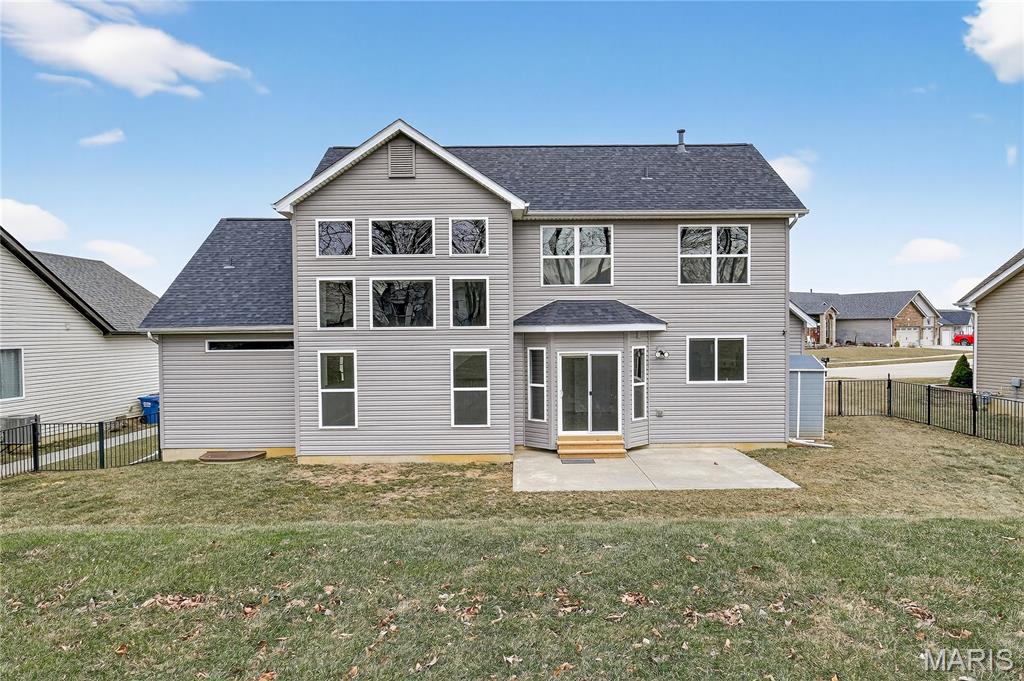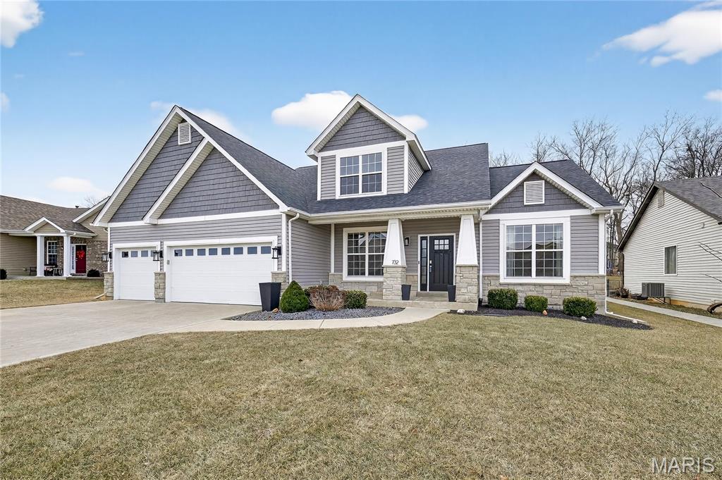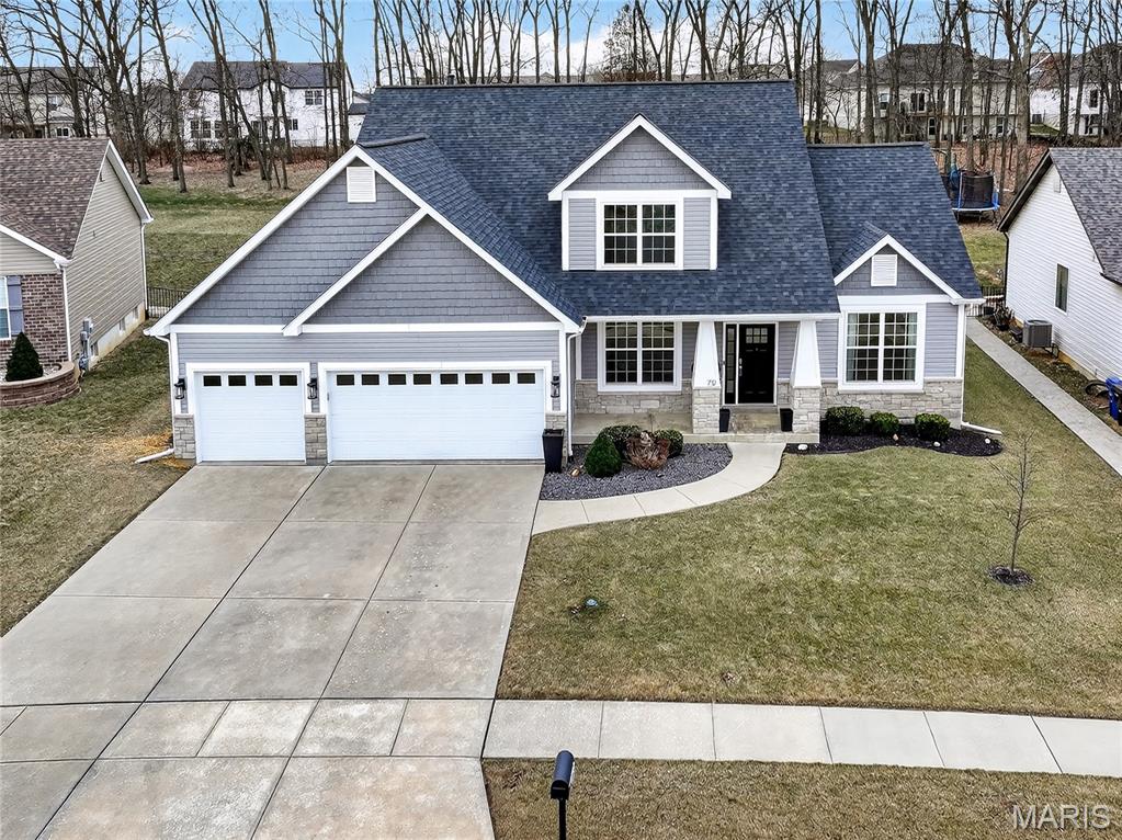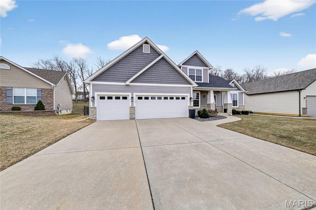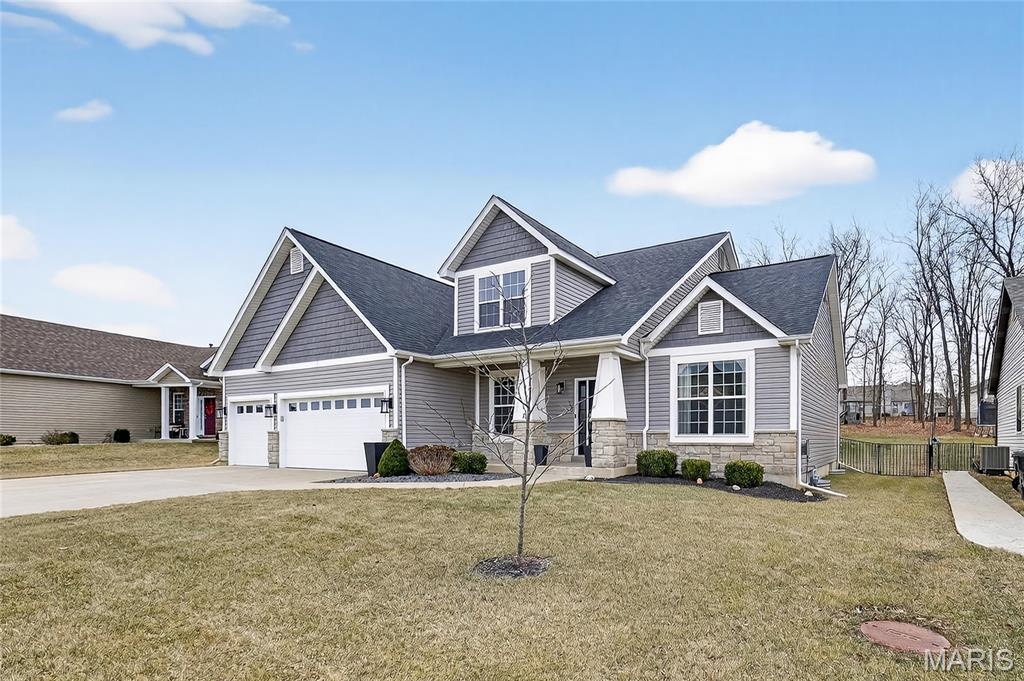 Simply stunning, 1.5 story home is sure to impress! Inviting foyer welcomes you home w/wood floors extending throughout the bright & open floor plan, ideal for entertaining w/a formal dining room. The great room hosts a gorgeous 2-sty wall of windows, bringing in plenty of natural light, while a stunning electric fireplace feature surrounded by newer windows seamlessly flows into the breakfast room & kitchen. 42" staggered cabinetry w/molding, stainless steel appliances, glass tile backsplash & sprawling quartz counters complete the immaculate kitchen. Entry from garage provides built-in storage as you enter the home. Main floor master offers a lavish retreat, the coffered master suite boasts a large walk-in shower, double sink vanity & walk-in closet! 3 guest bedrooms & full bath are located upstairs. Enjoy the large patio in the half acre fenced in yard. The basement is a blank slate for you to create more living space with a rough-in for a bathroom and an egress window to work with. This home also has newer siding, windows, and roof; located close to HWYS & shops, don't miss this gorgeous home!
