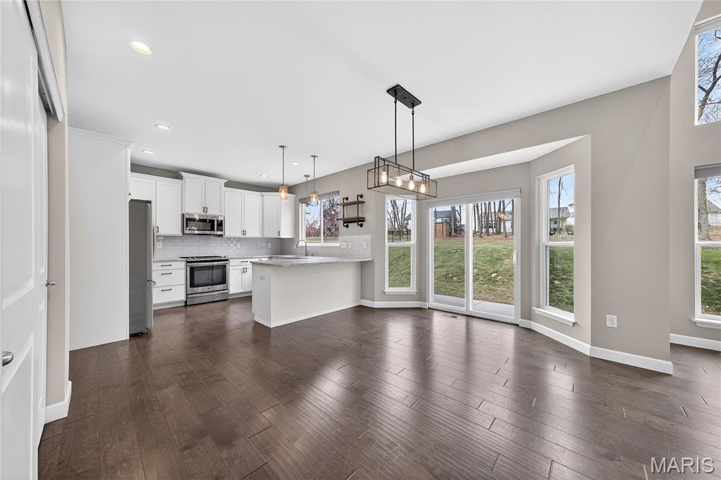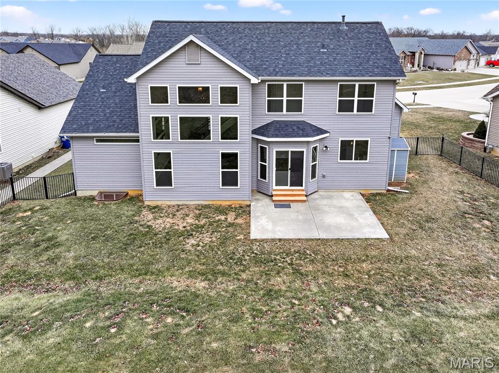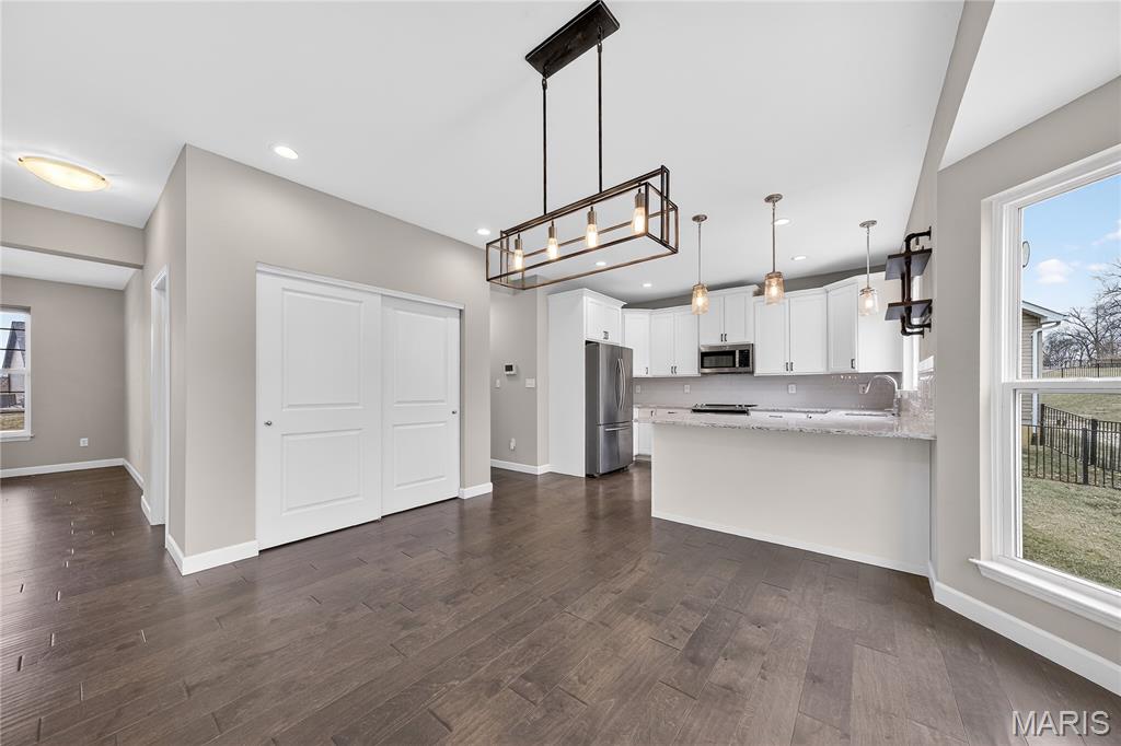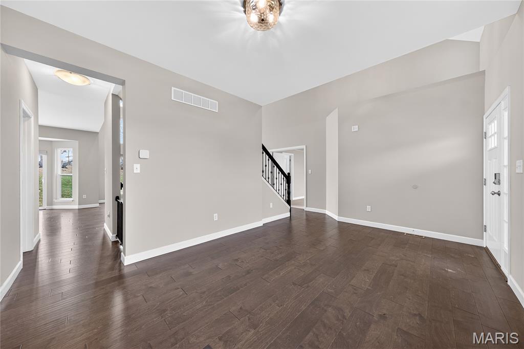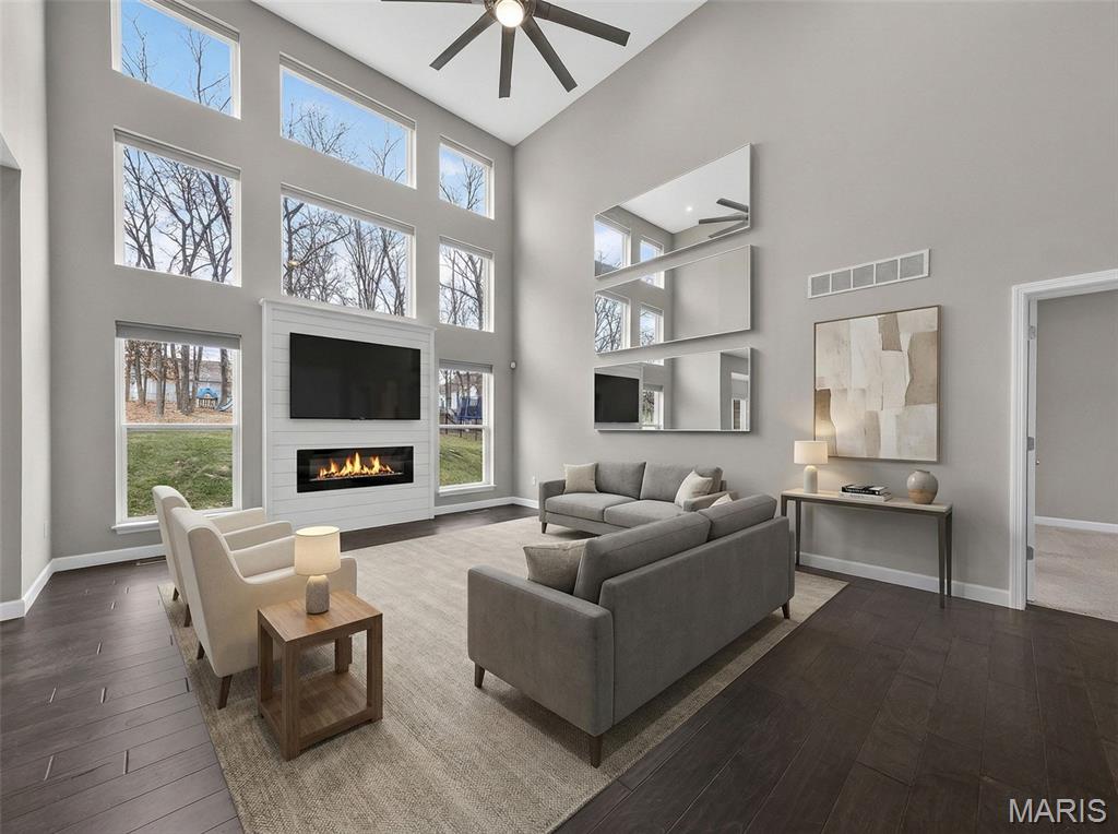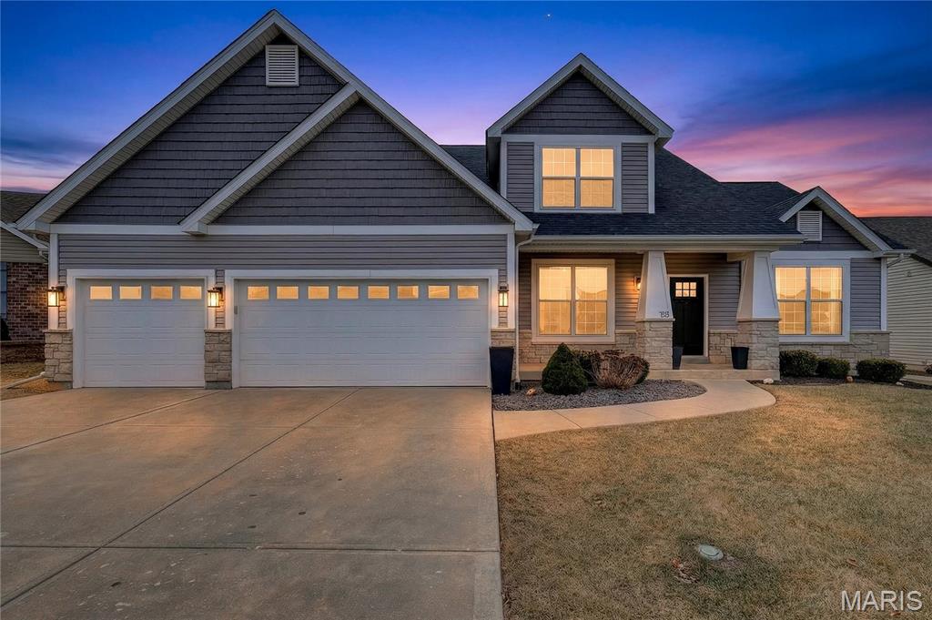 Simply stunning, 1.5 story home is sure to impress! Inviting foyer welcomes you home w/wood floors extending throughout the bright & open floor plan, ideal for entertaining w/a formal dining room. The great room hosts a gorgeous 2-sty wall of windows, bringing in plenty of natural light, while a stunning electric fireplace feature surrounded by newer windows seamlessly flows into the breakfast room & kitchen. 42" staggered cabinetry w/molding, stainless steel appliances, glass tile backsplash & sprawling quartz counters complete the immaculate kitchen. Entry from garage provides built-in storage as you enter the home. Main floor master offers a lavish retreat, the coffered master suite boasts a large walk-in shower, double sink vanity & walk-in closet! 3 guest bedrooms & full bath are located upstairs. Enjoy the large patio in the half acre fenced in yard. The basement is a blank slate for you to create more living space with a rough-in for a bathroom and an egress window to work with. This home also has newer siding, windows, and roof; located close to HWYS & shops, don't miss this gorgeous home!