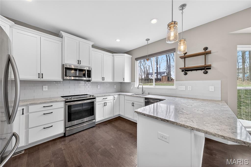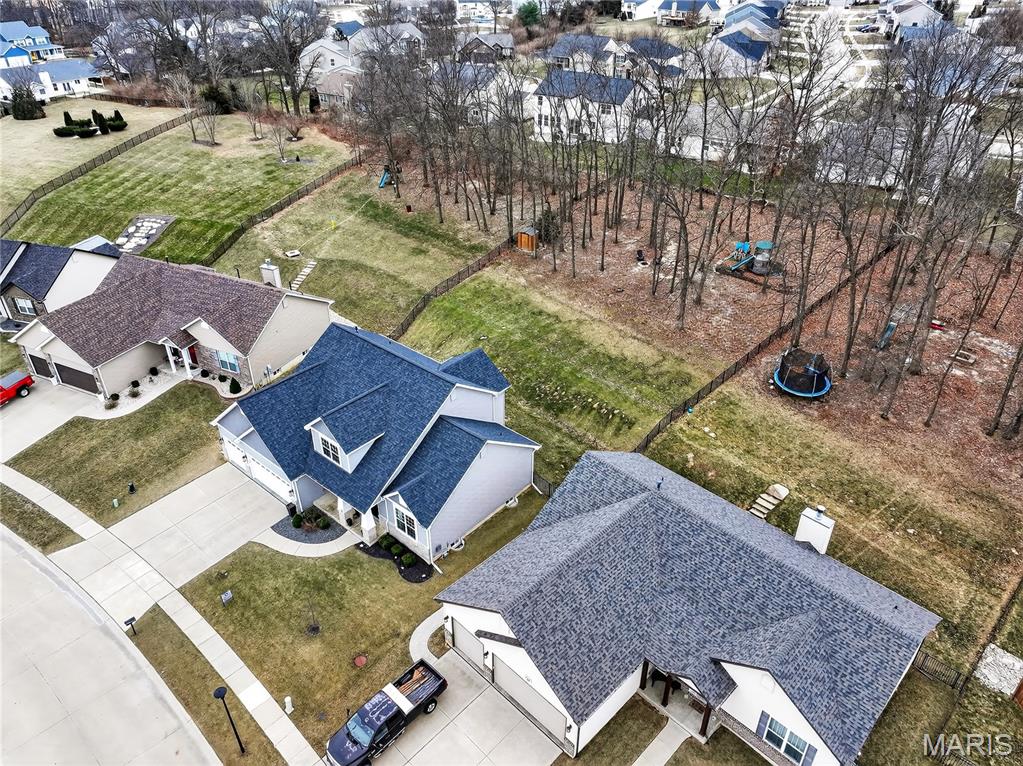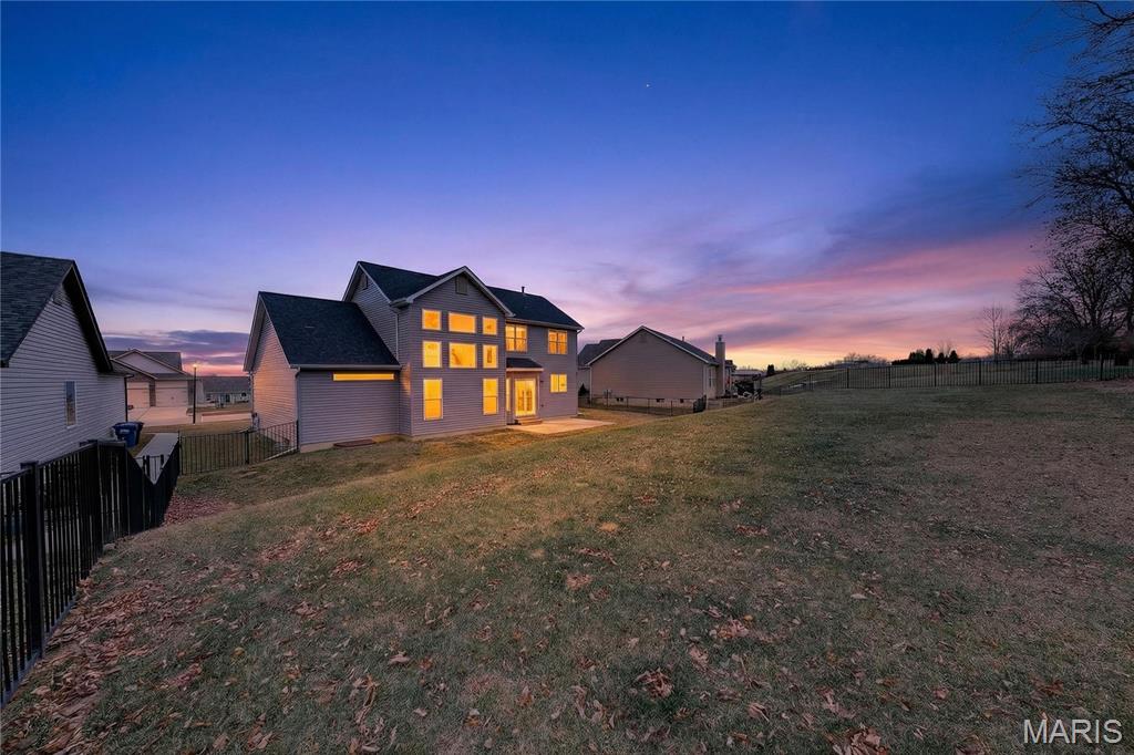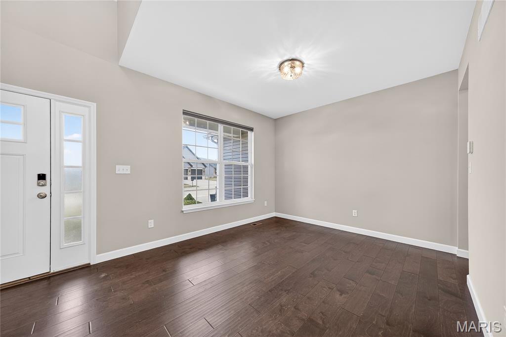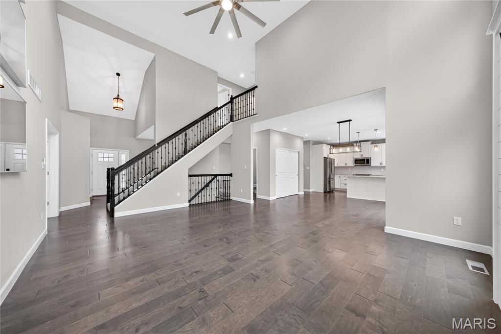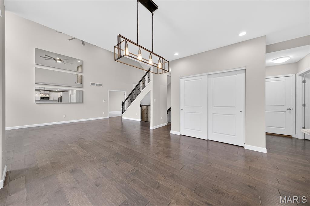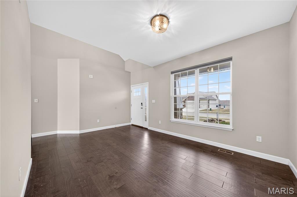 Simply stunning, 1.5 story home is sure to impress! Inviting foyer welcomes you home w/wood floors extending throughout the bright & open floor plan, ideal for entertaining w/a formal dining room. The great room hosts a gorgeous 2-sty wall of windows, bringing in plenty of natural light, while a stunning electric fireplace feature surrounded by newer windows seamlessly flows into the breakfast room & kitchen. 42" staggered cabinetry w/molding, stainless steel appliances, glass tile backsplash & sprawling quartz counters complete the immaculate kitchen. Entry from garage provides built-in storage as you enter the home. Main floor master offers a lavish retreat, the coffered master suite boasts a large walk-in shower, double sink vanity & walk-in closet! 3 guest bedrooms & full bath are located upstairs. Enjoy the large patio in the half acre fenced in yard. The basement is a blank slate for you to create more living space with a rough-in for a bathroom and an egress window to work with. This home also has newer siding, windows, and roof; located close to HWYS & shops, don't miss this gorgeous home!