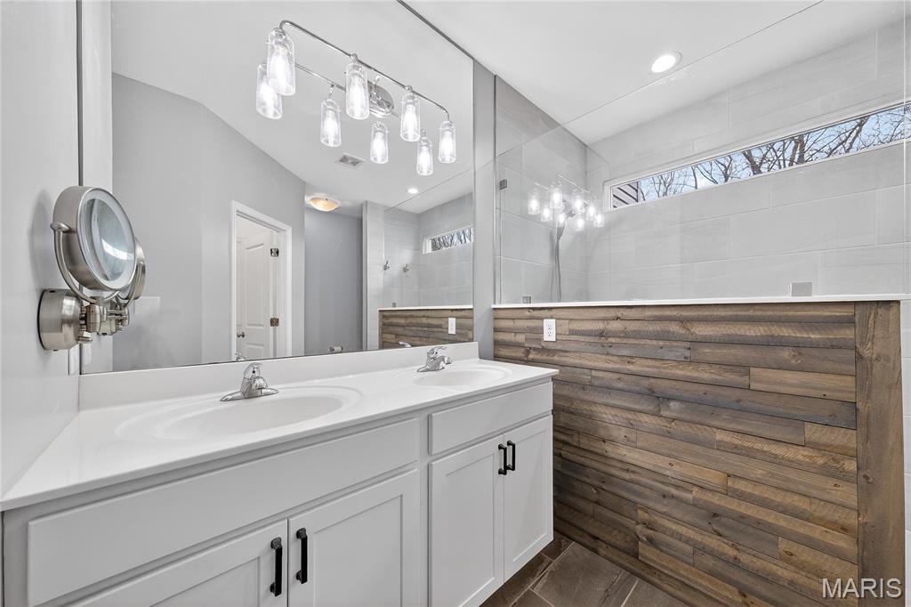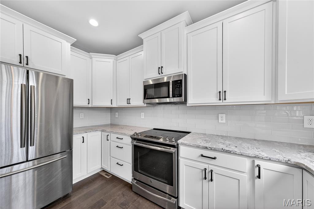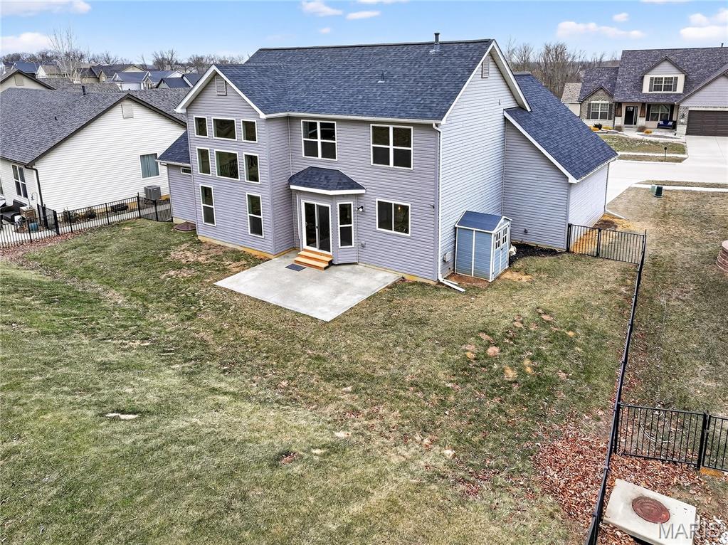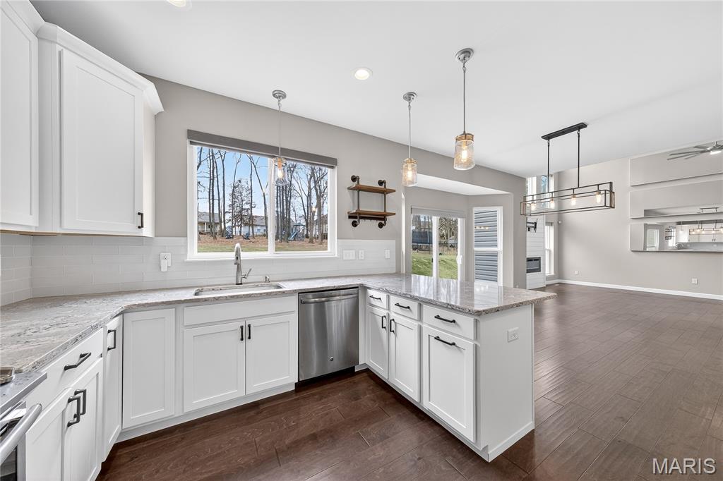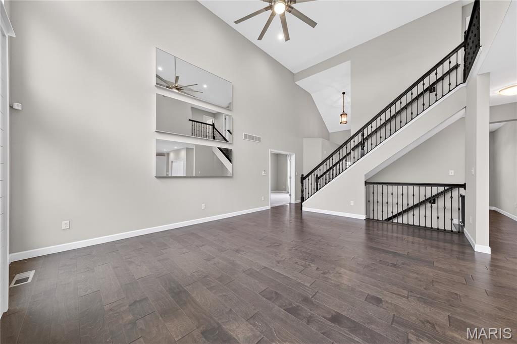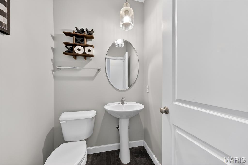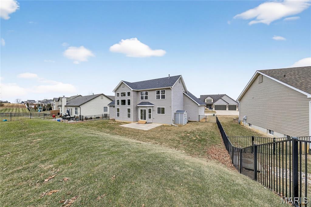 Simply stunning, 1.5 story home is sure to impress! Inviting foyer welcomes you home w/wood floors extending throughout the bright & open floor plan, ideal for entertaining w/a formal dining room. The great room hosts a gorgeous 2-sty wall of windows, bringing in plenty of natural light, while a stunning electric fireplace feature surrounded by newer windows seamlessly flows into the breakfast room & kitchen. 42" staggered cabinetry w/molding, stainless steel appliances, glass tile backsplash & sprawling quartz counters complete the immaculate kitchen. Entry from garage provides built-in storage as you enter the home. Main floor master offers a lavish retreat, the coffered master suite boasts a large walk-in shower, double sink vanity & walk-in closet! 3 guest bedrooms & full bath are located upstairs. Enjoy the large patio in the half acre fenced in yard. The basement is a blank slate for you to create more living space with a rough-in for a bathroom and an egress window to work with. This home also has newer siding, windows, and roof; located close to HWYS & shops, don't miss this gorgeous home!
