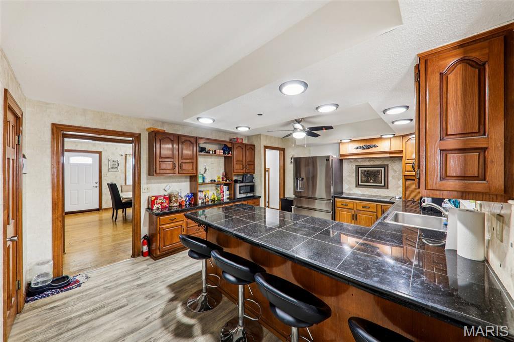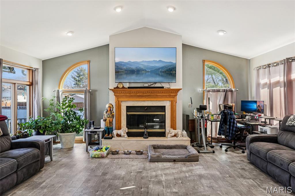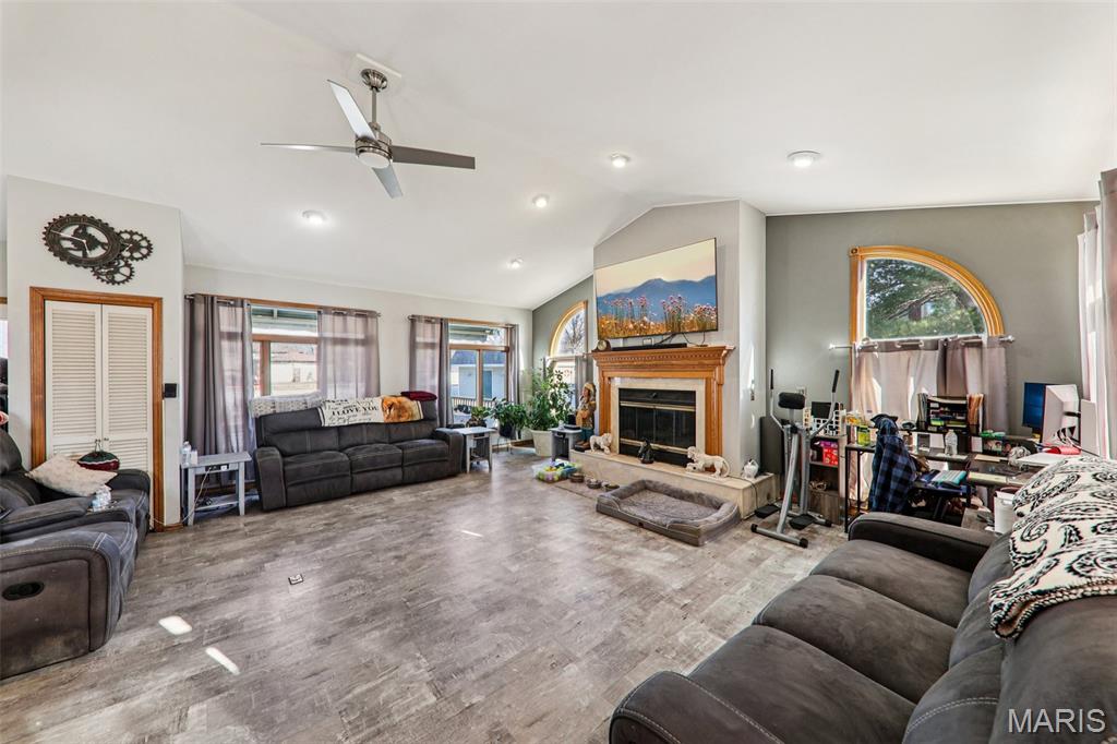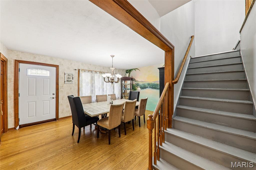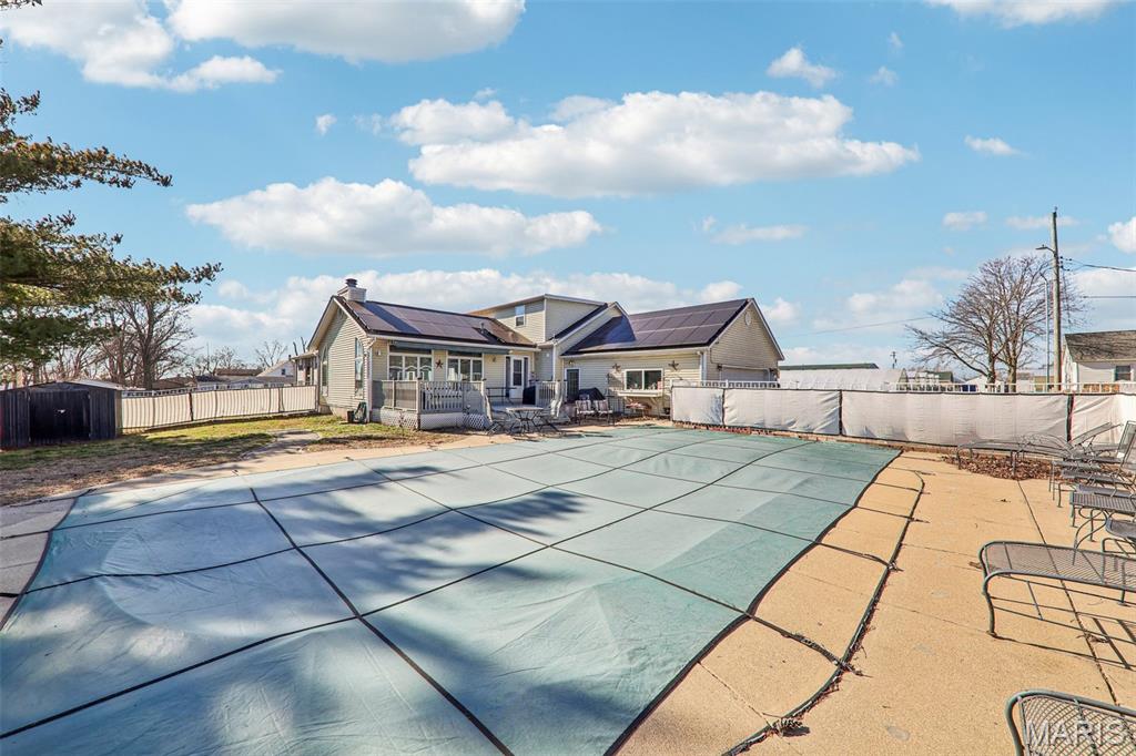 Experience comfort, style, and standout features in this stunning New Baden home! The front door opens into a welcoming formal dining room, setting an elegant tone for the rest of the home. From there, the spacious kitchen offers a refrigerator, oven, and dishwasher that will stay with the home, excellent cabinet and counter space, and a smooth flow into the show stopping living room. Vaulted ceilings, a striking fireplace focal point, the living room also includes a bar area! The main floor offers 2 bedrooms and a full bathroom. Head upstairs to find a huge bedroom and a remodeled full bathroom. While the partially finished basement delivers a bonus area and an office, or whatever you want it to be! Washer and Dryer will stay! Step outside and prepare to be wowed: You will find a fenced-in backyard with a large deck overlooking the sparkling in-ground sports pool, creating a true outdoor retreat perfect for relaxation, entertaining, and warm-weather enjoyment. The pool area also offers a pool house that has a bathroom and a storage area! The pool has a new liner and pump! The 2-car attached garage adds convenience. The home also offers solar panels!