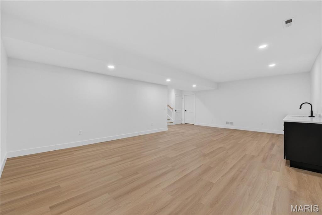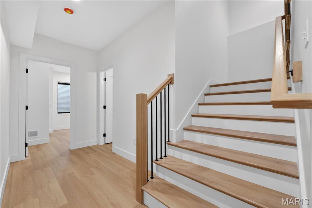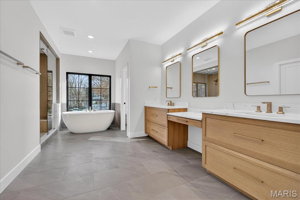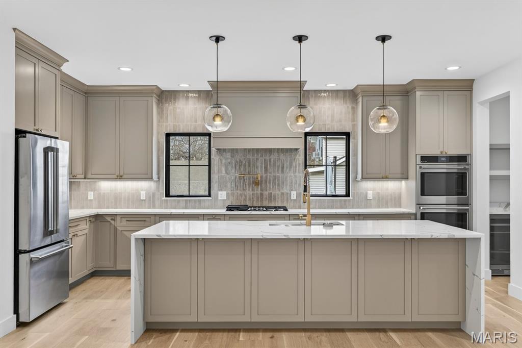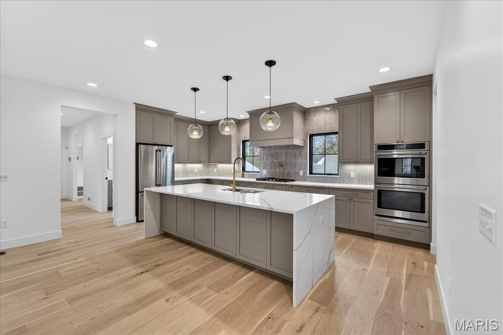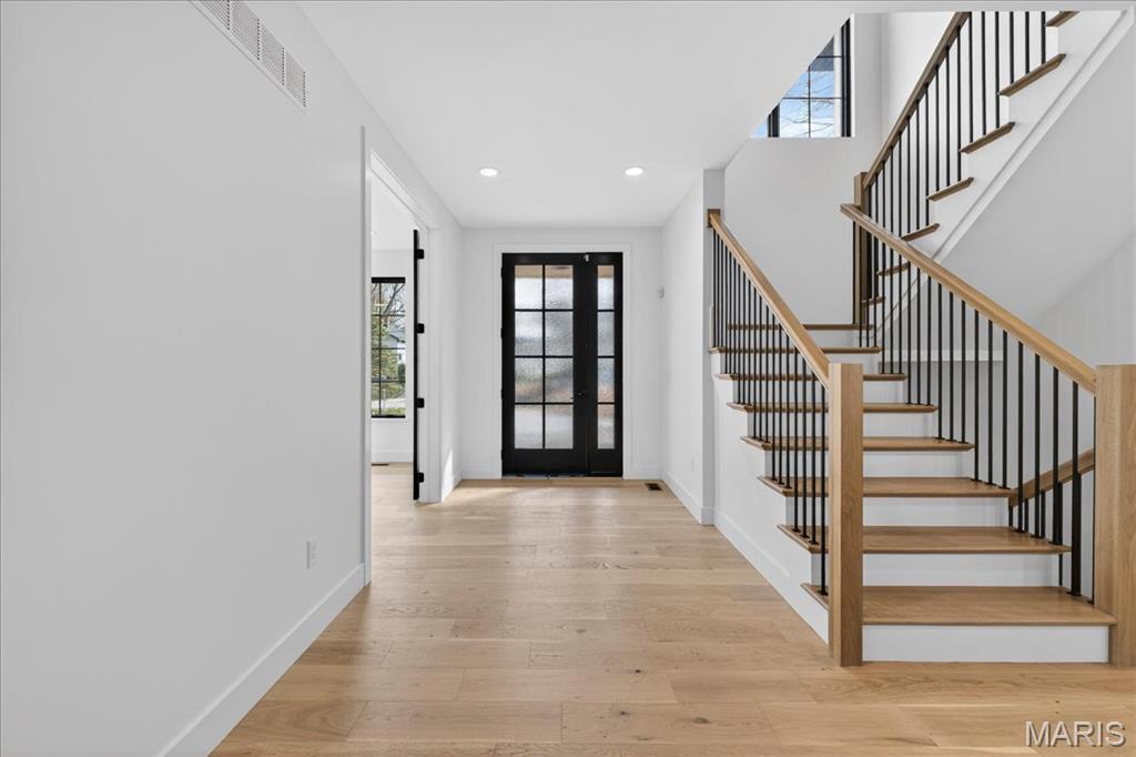 Rare luxury new construction in Webster Groves offering exceptional design, high-end finishes, and nearly half an acre of deep backyard space — an opportunity seldom found in this established community. The main level showcases beautiful white oak hardwood flooring throughout, a dedicated office, and a spacious open-concept layout designed for modern living. The gourmet kitchen features exquisite custom cabinetry, quartz countertops, large waterfall island, and seamless flow into the living area, creating an ideal setting for entertaining. A main-floor bedroom + accessible full bath provides flexibility for guests or multigenerational living, along with a main-floor laundry + mudroom — one of two thoughtfully placed laundry areas in the home. Upstairs, you’ll find four generously sized bedrooms including a luxurious primary suite. Equipped with a soaking tub, a spacious spa like shower with a bench and double rain heads, custom white oak vanities with a makeup area between, and a custom walk-in closet. As for the other bedrooms, two bedrooms share a Jack-and-Jill bathroom, while another offers its own private ensuite — all featuring custom closet shelving for exceptional organization. A spacious second-floor luxury laundry room adds everyday ease and efficiency. The finished lower level provides an expansive open rec room complete with a wet bar and beverage cooler, ideal for entertaining or additional living space. A bedroom and full bath offer excellent guest accommodations, while two oversized storage rooms provide incredible flexibility for a home gym, hobby space, or future expansion. Outside, the property offers a large covered patio, private attached two-car garage, large additional parking pad, and a rare deep backyard providing exceptional outdoor space not often found in newer construction. Located within the highly sought-after Webster Groves School District and walkable to Avery Elementary, parks, local dining, coffee shops, and retail, this home presents a truly rare opportunity to enjoy luxury new construction in Webster Groves.