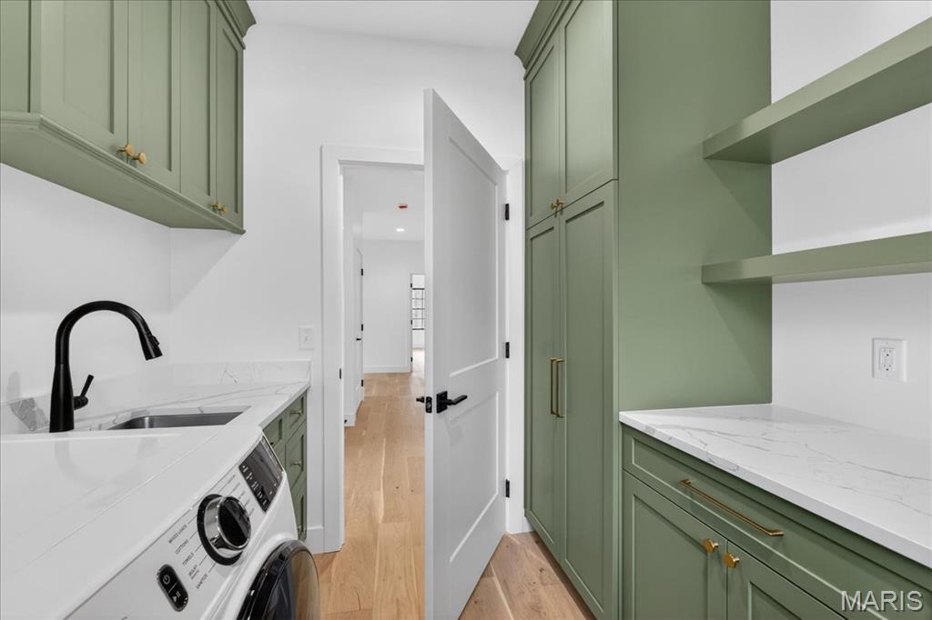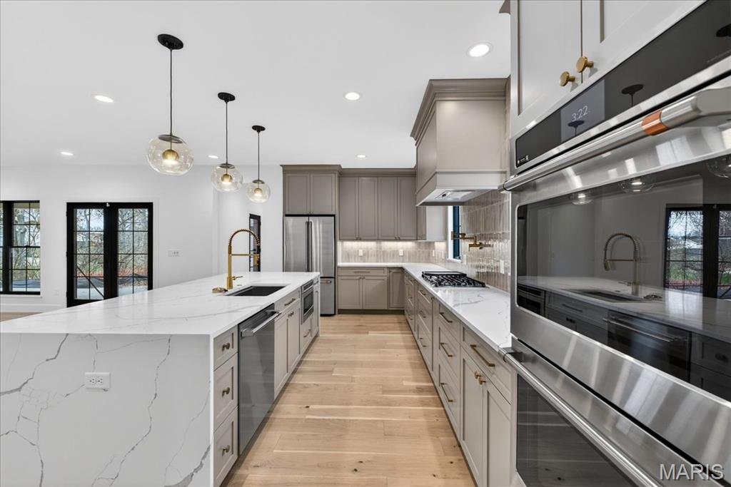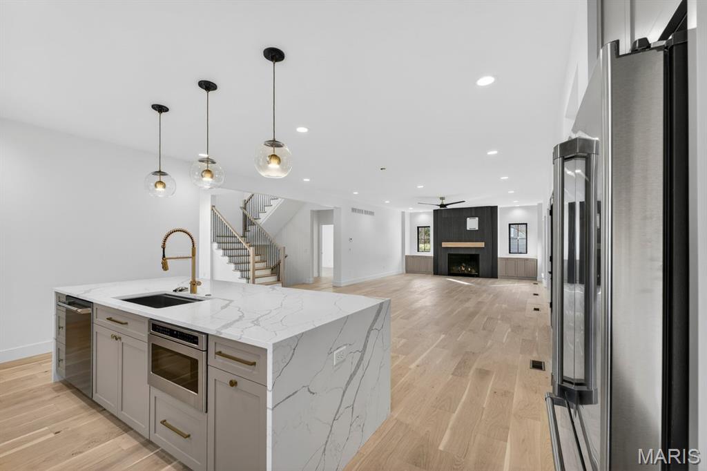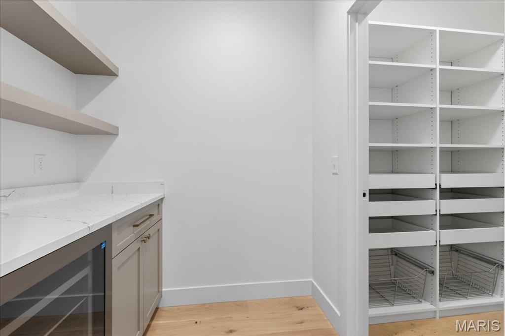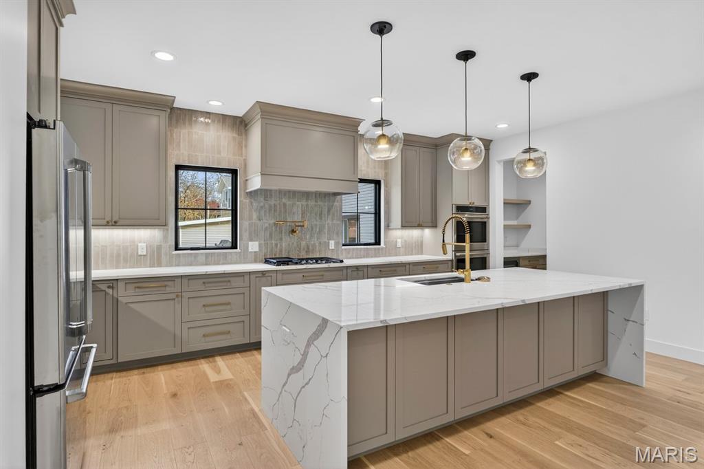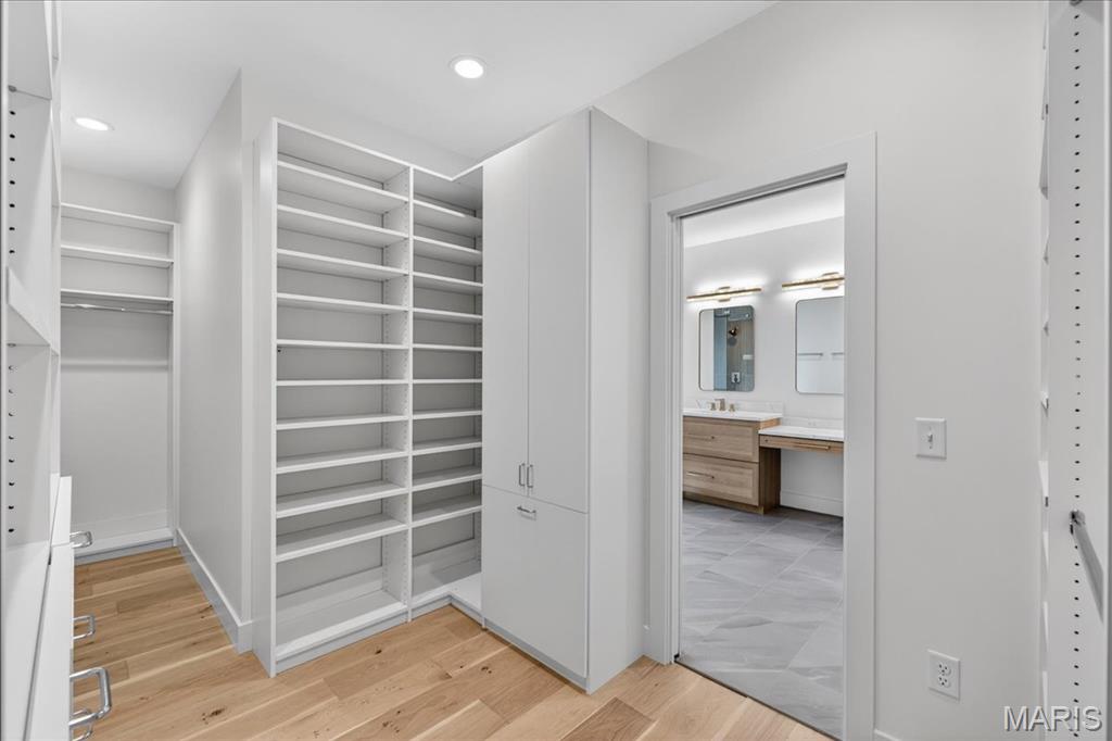 Rare luxury new construction in Webster Groves offering exceptional design, high-end finishes, and nearly half an acre of deep backyard space — an opportunity seldom found in this established community. The main level showcases beautiful white oak hardwood flooring throughout, a dedicated office, and a spacious open-concept layout designed for modern living. The gourmet kitchen features exquisite custom cabinetry, quartz countertops, large waterfall island, and seamless flow into the living area, creating an ideal setting for entertaining. A main-floor bedroom + accessible full bath provides flexibility for guests or multigenerational living, along with a main-floor laundry + mudroom — one of two thoughtfully placed laundry areas in the home. Upstairs, you’ll find four generously sized bedrooms including a luxurious primary suite. Equipped with a soaking tub, a spacious spa like shower with a bench and double rain heads, custom white oak vanities with a makeup area between, and a custom walk-in closet. As for the other bedrooms, two bedrooms share a Jack-and-Jill bathroom, while another offers its own private ensuite — all featuring custom closet shelving for exceptional organization. A spacious second-floor luxury laundry room adds everyday ease and efficiency. The finished lower level provides an expansive open rec room complete with a wet bar and beverage cooler, ideal for entertaining or additional living space. A bedroom and full bath offer excellent guest accommodations, while two oversized storage rooms provide incredible flexibility for a home gym, hobby space, or future expansion. Outside, the property offers a large covered patio, private attached two-car garage, large additional parking pad, and a rare deep backyard providing exceptional outdoor space not often found in newer construction. Located within the highly sought-after Webster Groves School District and walkable to Avery Elementary, parks, local dining, coffee shops, and retail, this home presents a truly rare opportunity to enjoy luxury new construction in Webster Groves.