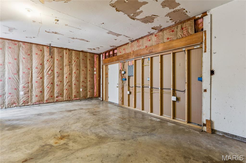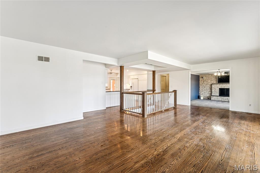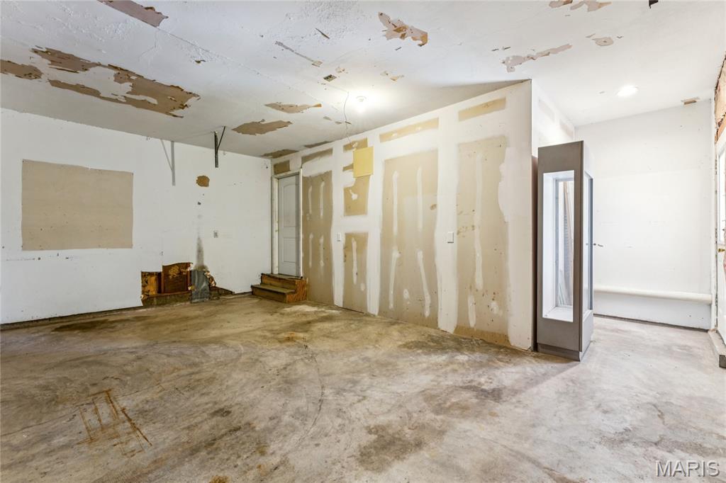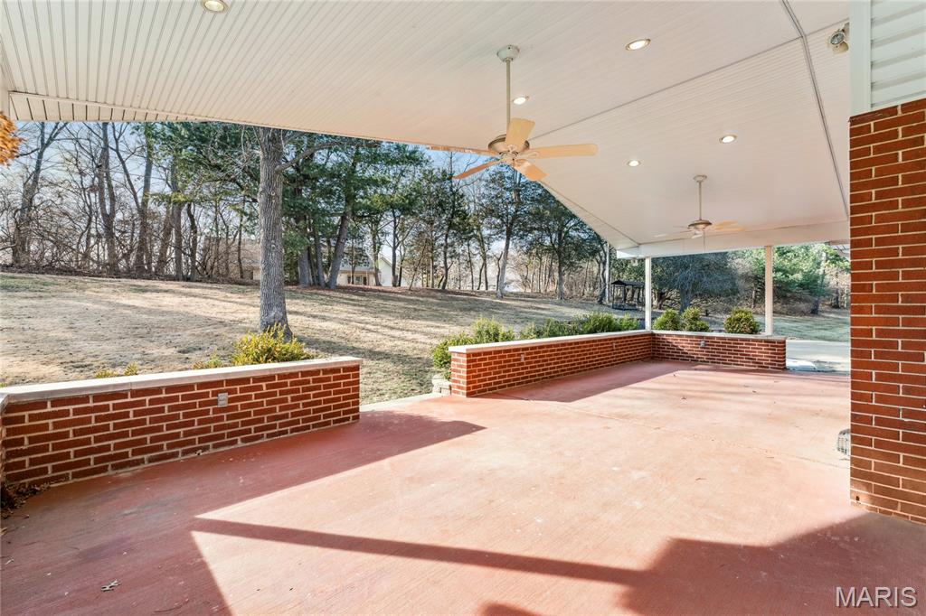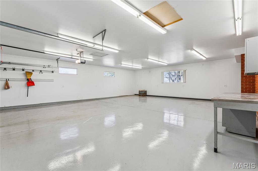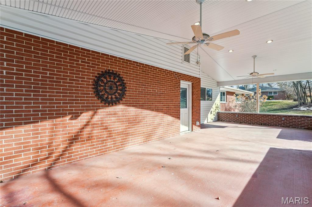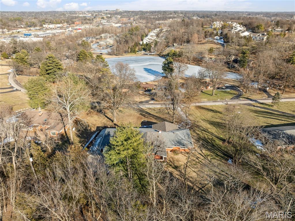 Tucked inside a quiet 23-home enclave with a private lake, this sprawling brick ranch sits on over an acre, offering space, privacy, and a setting that feels miles away - yet minutes to everything unincorpated Ballwin has to offer, including Parkway schools with PASSED St. Louis County occupancy. Set on an expansive lot with mature trees and a circular drive that wraps to the rear, the home has true presence from the street. A newer covered front porch, along with retaining walls and landscaping, adds charm from the street and creates a welcoming outdoor space. The elevated setting sits above the lakefront homes below, offering open sightlines toward the water. Inside, the main level opens around a central staircase, creating an easy flow between living & kitchen spaces – full of natural light from oversized windows. The eat-in kitchen features crisp white cabinetry, generous counter space, backyard views, direct access to the patio, while the adjacent living area centers around a wood-burning fireplace, wired for surround sound. Main floor laundry with storage and an extra fridge adds everyday convenience! Hardwood floors run through much of the home, adding warmth and character. 3 bedrooms (including a primary suite) are located on the main, along with 2 full baths. The lower level offers more flexibility & storage, ready for future finishing or flexible use. Outdoor living shines here. A covered rear patio comes equipped with a vaulted ceiling, lighting, & ceiling fan, creating a picturesque spot - perfect for relaxing or entertaining. The rear of the home, is so well finished it’s easy to mistake it for the front - something you really notice in person. The oversized garage addition is a TRUE standout! Bright, clean, & impressively large - featuring commercial-grade epoxy floors, 220V electrical service, and a whole-house fan - ideal for workshop use, hobbies, EV charging potential, with enhanced ventilation and cooling. There's also a bonus flex area with additional outdoor access, between the home and spacious garage - waiting for finishing touches. Homes in this pocket rarely come available. With mid-century charm, a spacious layout, generous lot size, & peaceful surroundings, this is a unique opportunity to personalize a property with great bones in a truly special setting!