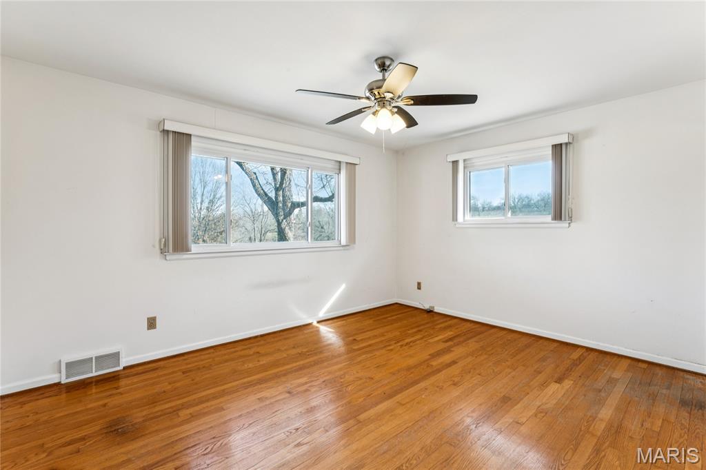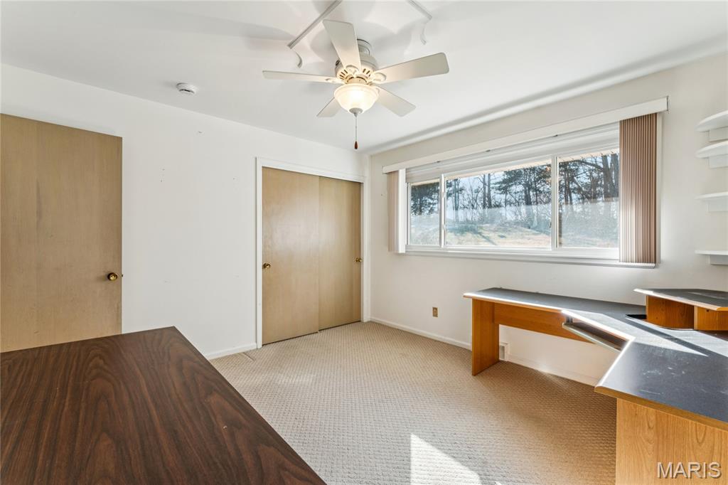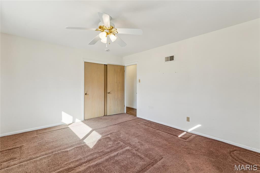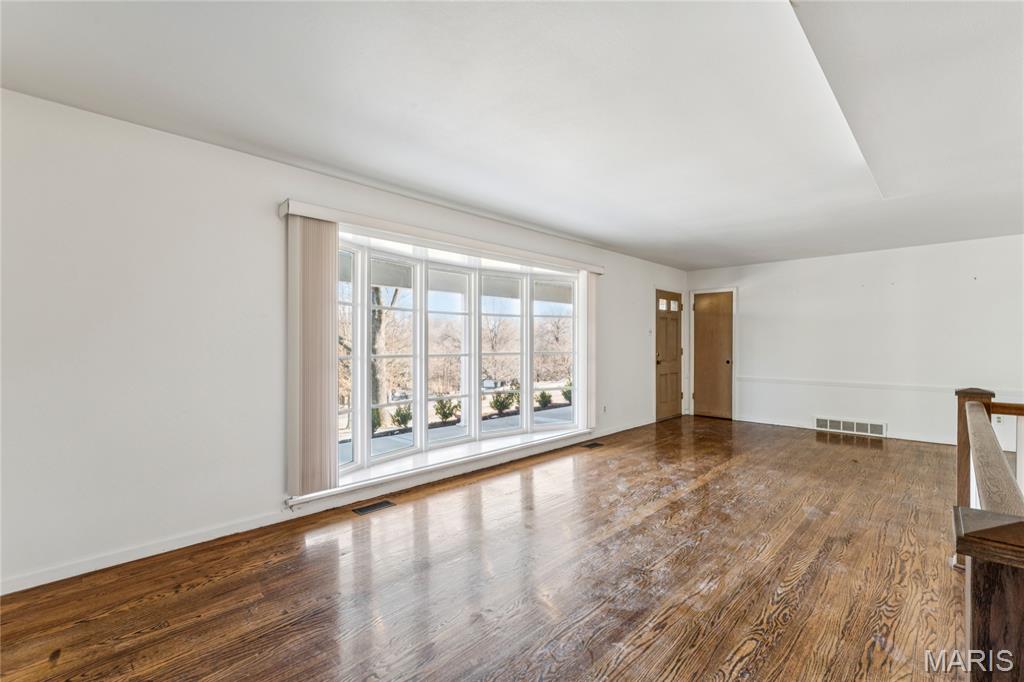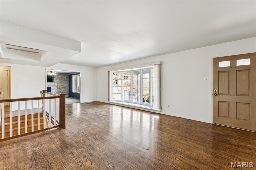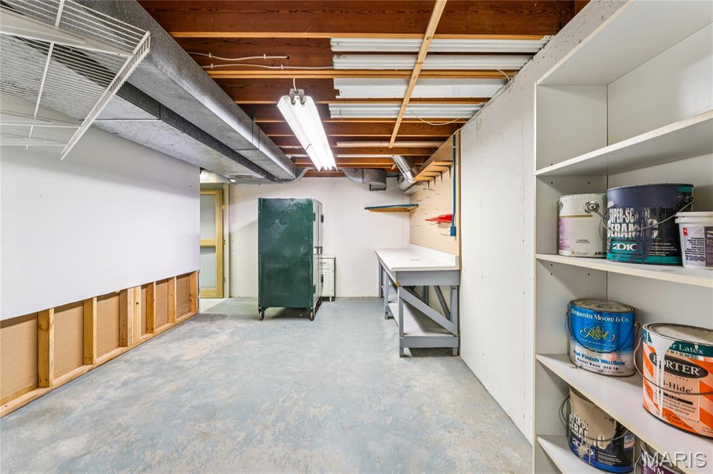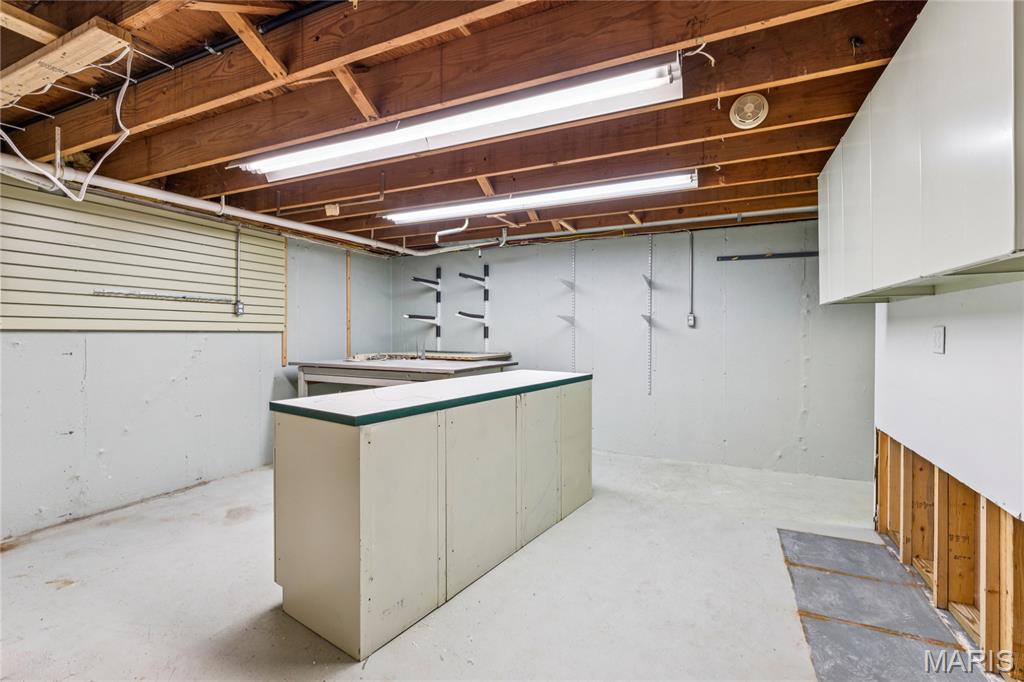 Tucked inside a quiet 23-home enclave with a private lake, this sprawling brick ranch sits on over an acre, offering space, privacy, and a setting that feels miles away - yet minutes to everything unincorpated Ballwin has to offer, including Parkway schools with PASSED St. Louis County occupancy. Set on an expansive lot with mature trees and a circular drive that wraps to the rear, the home has true presence from the street. A newer covered front porch, along with retaining walls and landscaping, adds charm from the street and creates a welcoming outdoor space. The elevated setting sits above the lakefront homes below, offering open sightlines toward the water. Inside, the main level opens around a central staircase, creating an easy flow between living & kitchen spaces – full of natural light from oversized windows. The eat-in kitchen features crisp white cabinetry, generous counter space, backyard views, direct access to the patio, while the adjacent living area centers around a wood-burning fireplace, wired for surround sound. Main floor laundry with storage and an extra fridge adds everyday convenience! Hardwood floors run through much of the home, adding warmth and character. 3 bedrooms (including a primary suite) are located on the main, along with 2 full baths. The lower level offers more flexibility & storage, ready for future finishing or flexible use. Outdoor living shines here. A covered rear patio comes equipped with a vaulted ceiling, lighting, & ceiling fan, creating a picturesque spot - perfect for relaxing or entertaining. The rear of the home, is so well finished it’s easy to mistake it for the front - something you really notice in person. The oversized garage addition is a TRUE standout! Bright, clean, & impressively large - featuring commercial-grade epoxy floors, 220V electrical service, and a whole-house fan - ideal for workshop use, hobbies, EV charging potential, with enhanced ventilation and cooling. There's also a bonus flex area with additional outdoor access, between the home and spacious garage - waiting for finishing touches. Homes in this pocket rarely come available. With mid-century charm, a spacious layout, generous lot size, & peaceful surroundings, this is a unique opportunity to personalize a property with great bones in a truly special setting!