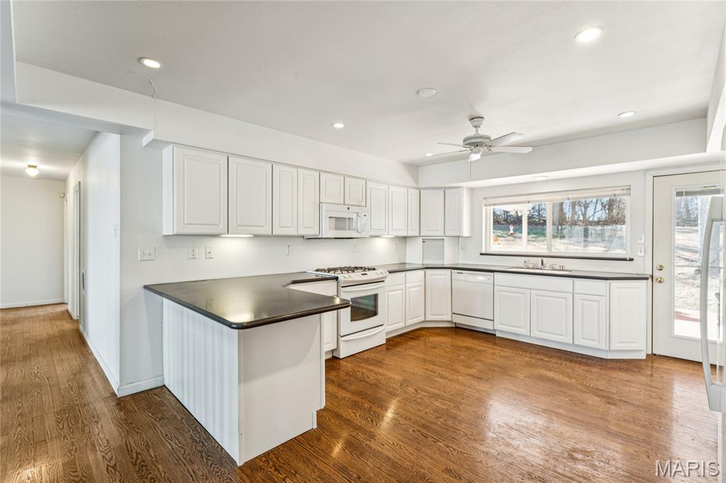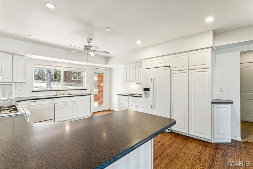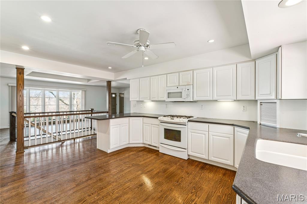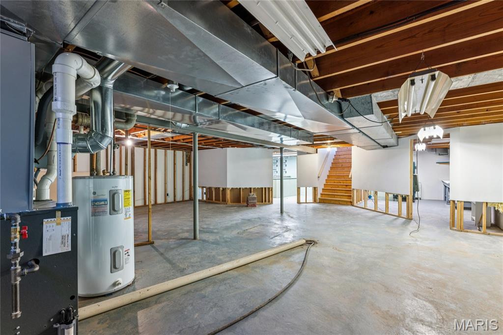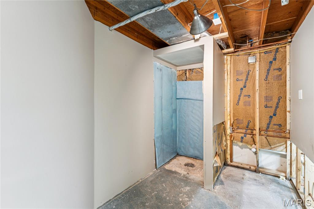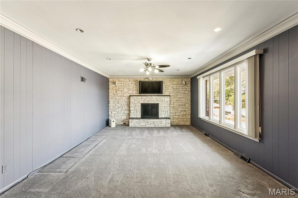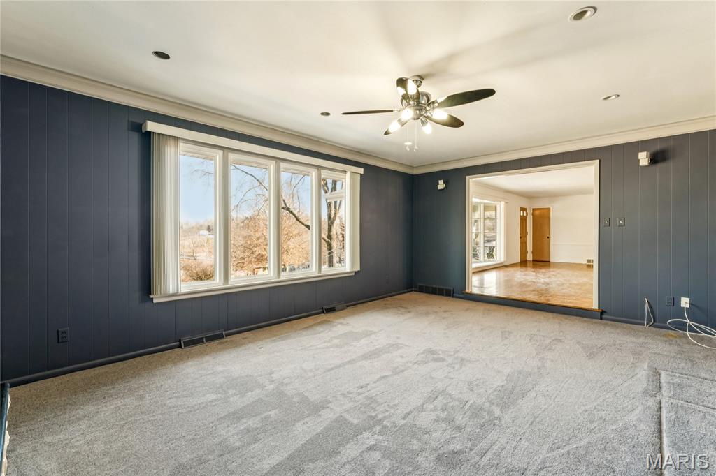 Tucked inside a quiet 23-home enclave with a private lake, this sprawling brick ranch sits on over an acre, offering space, privacy, and a setting that feels miles away - yet minutes to everything unincorpated Ballwin has to offer, including Parkway schools with PASSED St. Louis County occupancy. Set on an expansive lot with mature trees and a circular drive that wraps to the rear, the home has true presence from the street. A newer covered front porch, along with retaining walls and landscaping, adds charm from the street and creates a welcoming outdoor space. The elevated setting sits above the lakefront homes below, offering open sightlines toward the water. Inside, the main level opens around a central staircase, creating an easy flow between living & kitchen spaces – full of natural light from oversized windows. The eat-in kitchen features crisp white cabinetry, generous counter space, backyard views, direct access to the patio, while the adjacent living area centers around a wood-burning fireplace, wired for surround sound. Main floor laundry with storage and an extra fridge adds everyday convenience! Hardwood floors run through much of the home, adding warmth and character. 3 bedrooms (including a primary suite) are located on the main, along with 2 full baths. The lower level offers more flexibility & storage, ready for future finishing or flexible use. Outdoor living shines here. A covered rear patio comes equipped with a vaulted ceiling, lighting, & ceiling fan, creating a picturesque spot - perfect for relaxing or entertaining. The rear of the home, is so well finished it’s easy to mistake it for the front - something you really notice in person. The oversized garage addition is a TRUE standout! Bright, clean, & impressively large - featuring commercial-grade epoxy floors, 220V electrical service, and a whole-house fan - ideal for workshop use, hobbies, EV charging potential, with enhanced ventilation and cooling. There's also a bonus flex area with additional outdoor access, between the home and spacious garage - waiting for finishing touches. Homes in this pocket rarely come available. With mid-century charm, a spacious layout, generous lot size, & peaceful surroundings, this is a unique opportunity to personalize a property with great bones in a truly special setting!