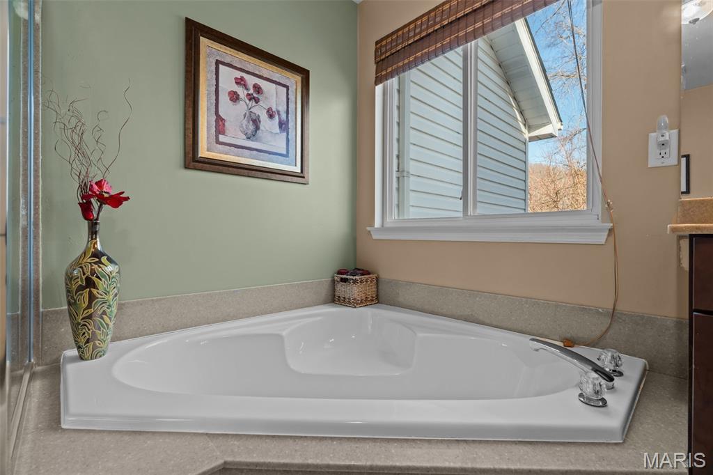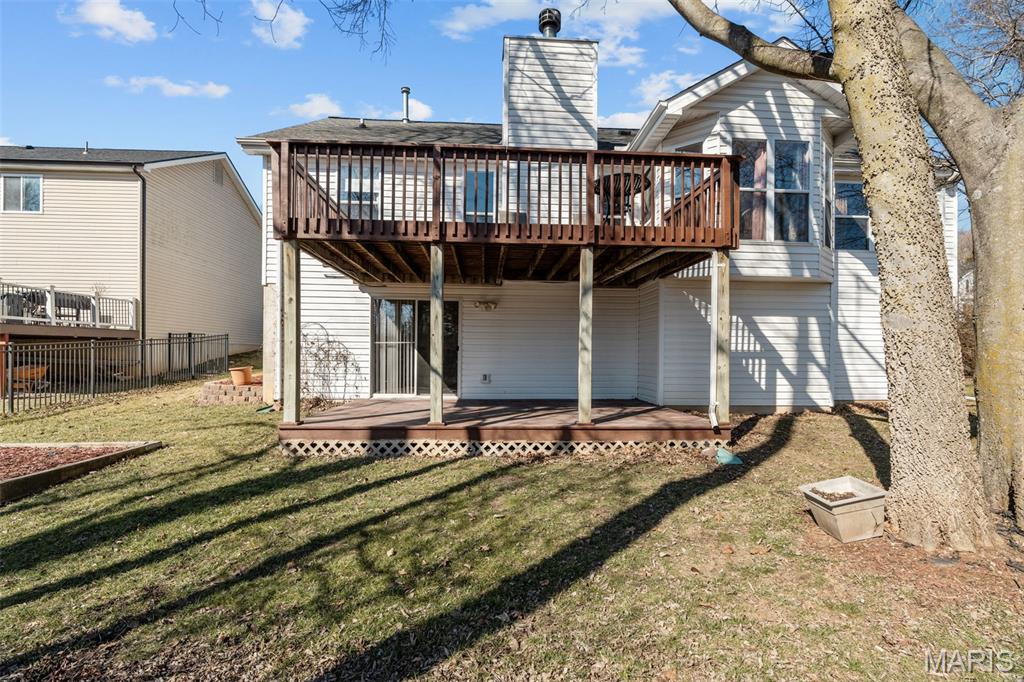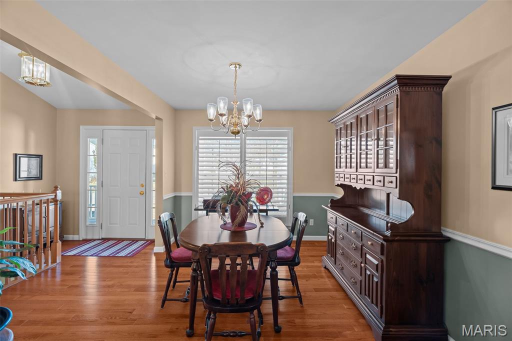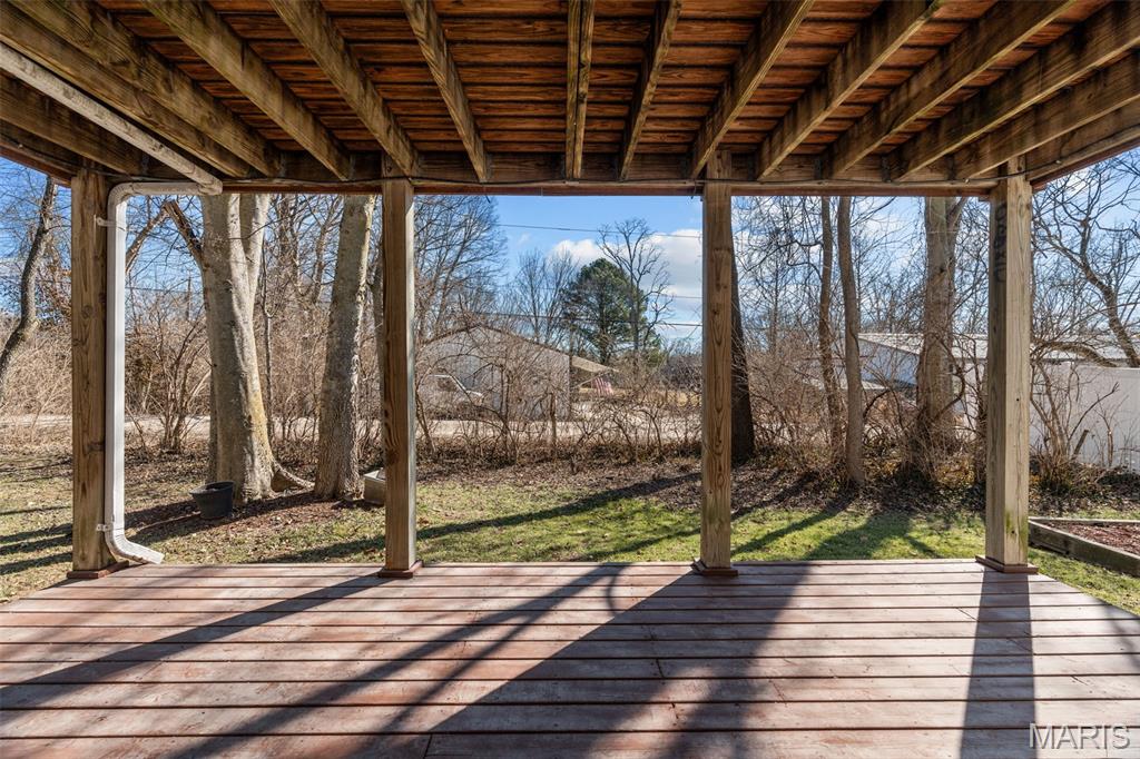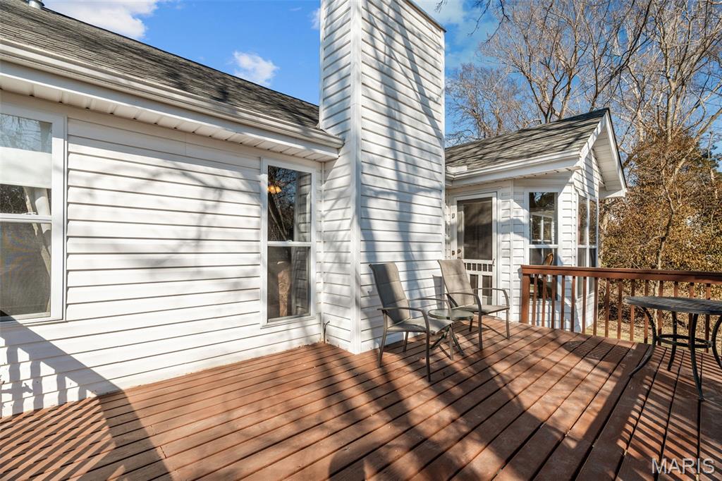 Look no further than this beautiful move-in ready ranch in Imperial! You'll love the curb appeal, with a three-car garage, professional landscaping, and a welcoming wraparound covered porch. The foyer opens to the vaulted main living space, with the dining room to the left featuring plantation shutters, a chair rail, and gleaming hardwood floors that continue into the living room. You'll love the natural light, with large windows flanking the cozy gas fireplace w/brick surround. The updated kitchen is the heart of the home, perfect for gathering with friends and family. You'll have a charming breakfast room with a bay window, plus ceramic tile floors, granite counters, stainless steel appliances, and thoughtfully designed 42" cabinets w/crown molding. Off the kitchen is the convenient laundry room with built-in storage. The primary bedroom has vaulted ceilings, a walk-in closet, and beautifully updated en-suite bath w/dual-sink vanity, corner tub, and step-in shower. Two more bedrooms and another full bath complete the space. The walk-out finished lower level adds a family room with a bar, a kitchenette, a rough-in for a half bath, and tons of unfinished storage space, including workshop areas and built-in shelving. Enjoy the spring weather on the two-tiered deck overlooking the level backyard. You'll be just steps from Seckman Schools, and moments from Mastodon State Park, I-55, and all of the shopping and restaurants in Imperial, Kimmswick, and Arnold. Don't miss out!