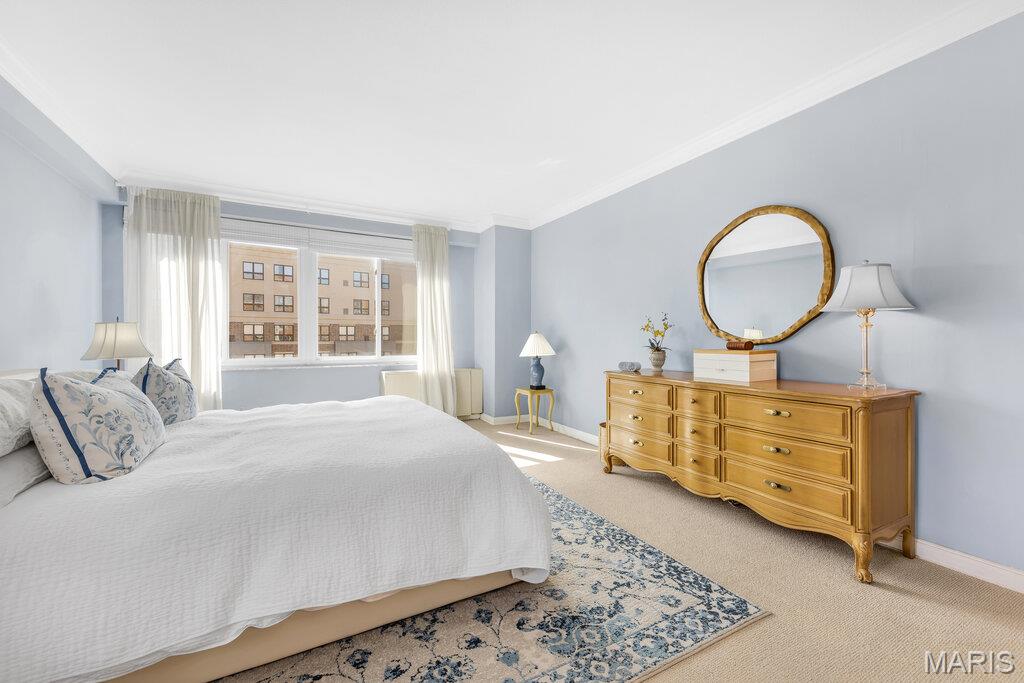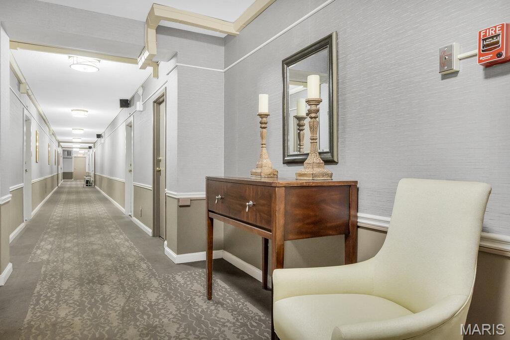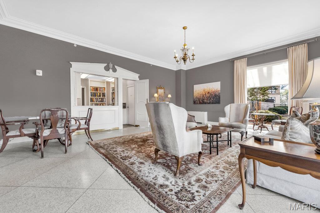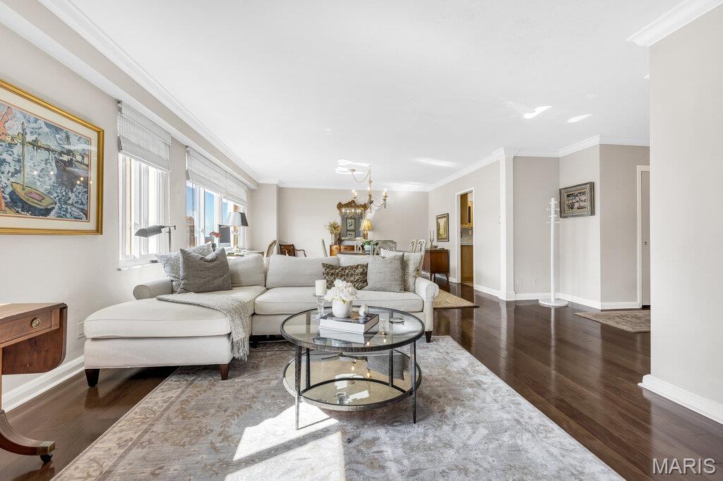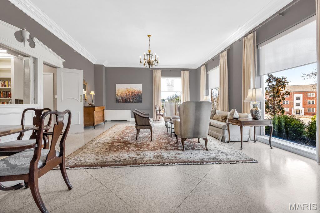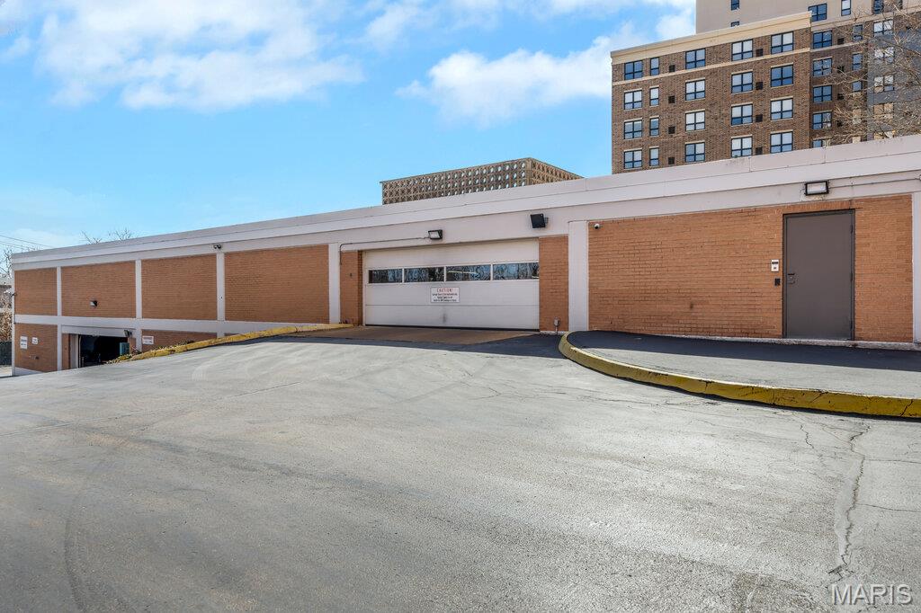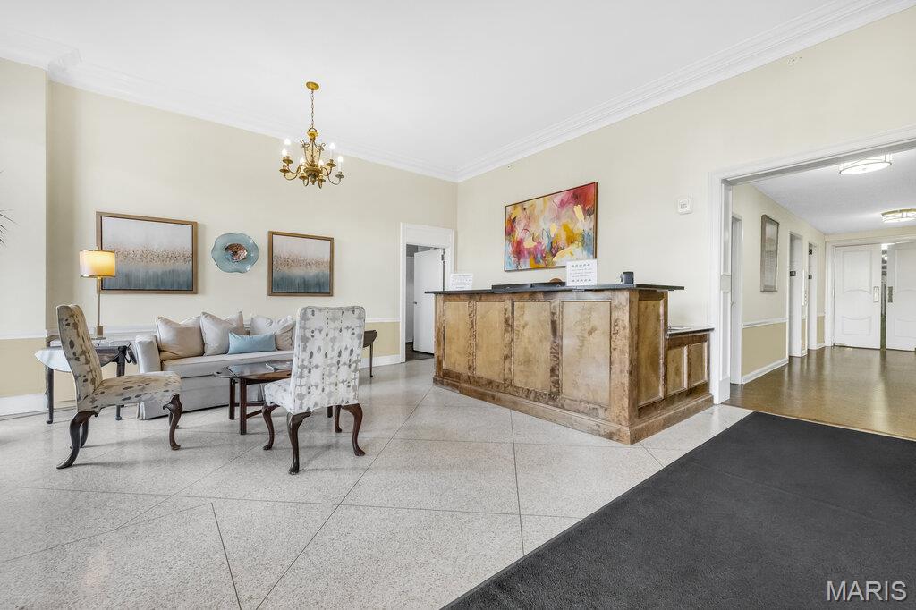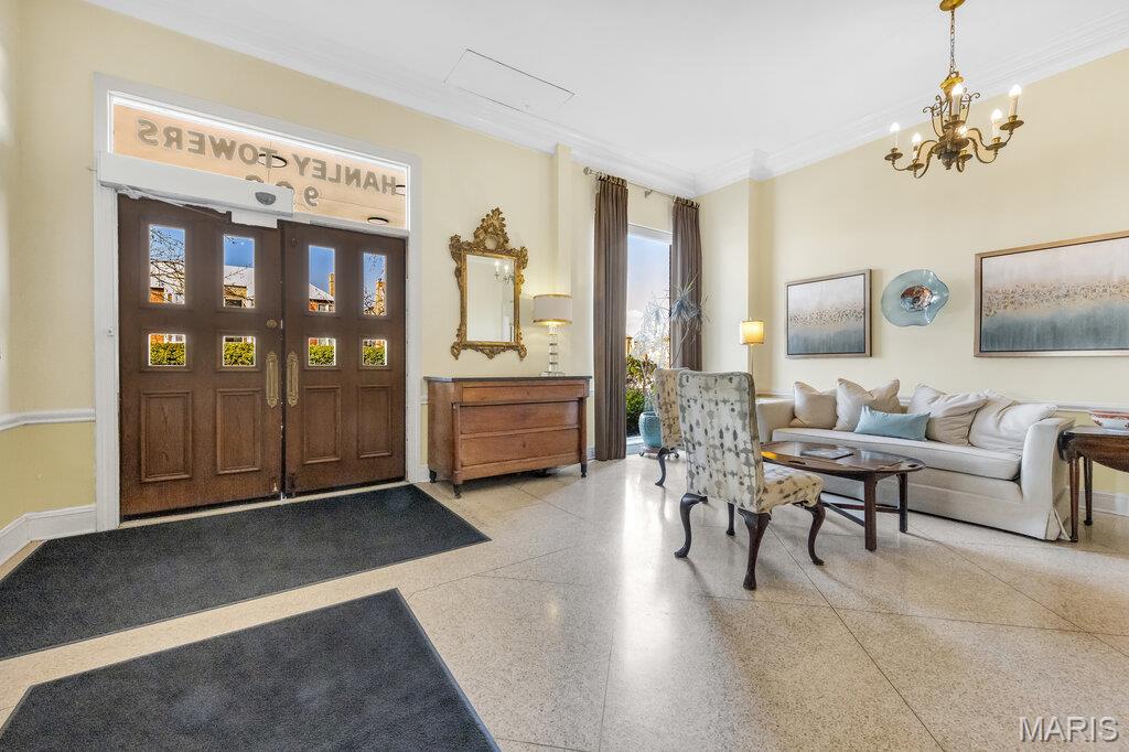 Incredible Clayton living in this beautiful 12th story condo with panoramic and awe inspiring views. You will love the ease of living with full service 24 hour security, a wonderful staff, space for entertaining in the formal common room, extensive gym, underground parking (parking spot is $60 per month), private dog park and a gorgeous outdoor pool. This home is a treasure of classic charm and modern updates. Enjoy the views as you enter the pretty foyer into the spacious and light living room and dining room with newer windows, custom window treatments, crown moldings throughout, gorgeous wood flooring and a cozy fireplace. The cooks kitchen has ample storage in its beautiful maple cabinetry, SS appliances, quartz countertops and stunning Ann Sachs Tile. Down the hall you will find an 9x6 laundry room with built in shelves, an updated hall bath, the second bedroom with custom built ins and a magnificent primary suite with views of the St Louis Arch. The generous en-suite bedroom opens into a huge closet and spacious bath with new shower, shower seat, Ann Sachs tile and gorgeous updated vanity. Nothing to do except move in and enjoy. Dining room chandelier excluded in the sale.