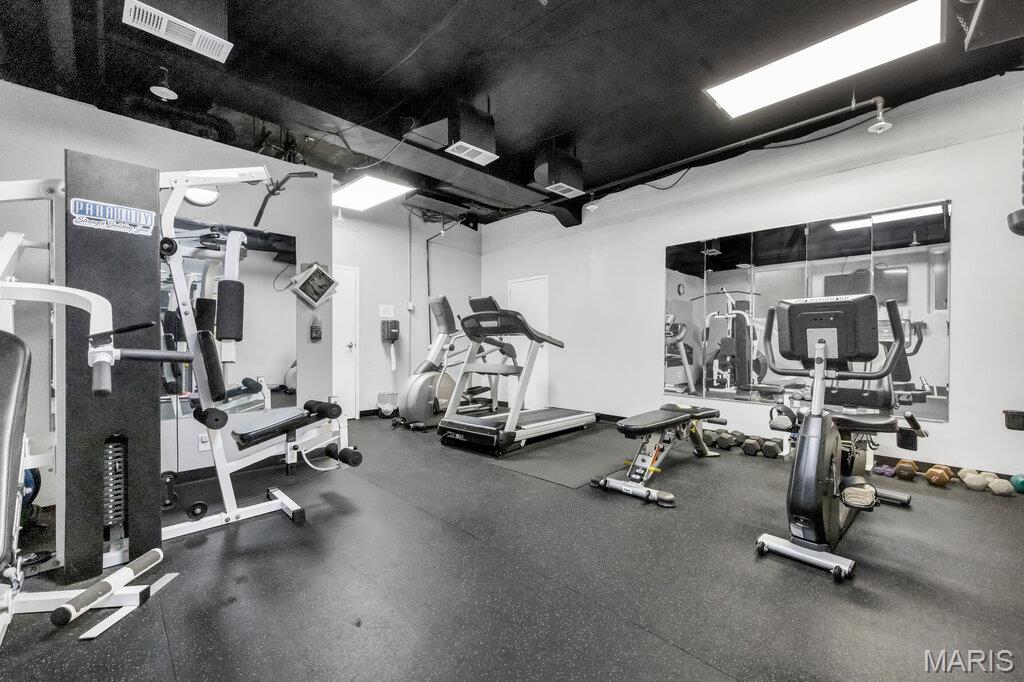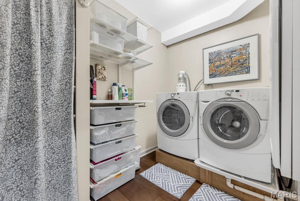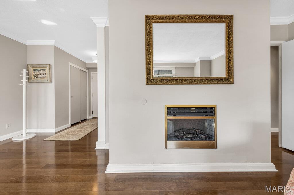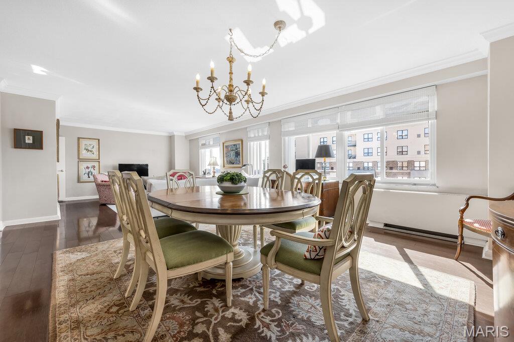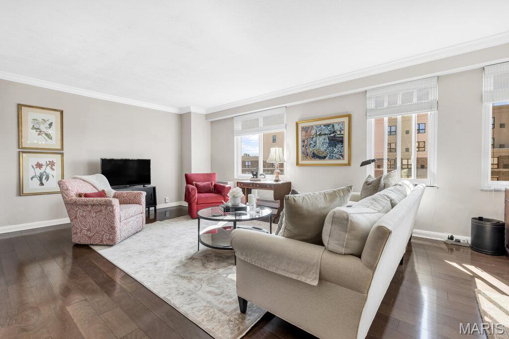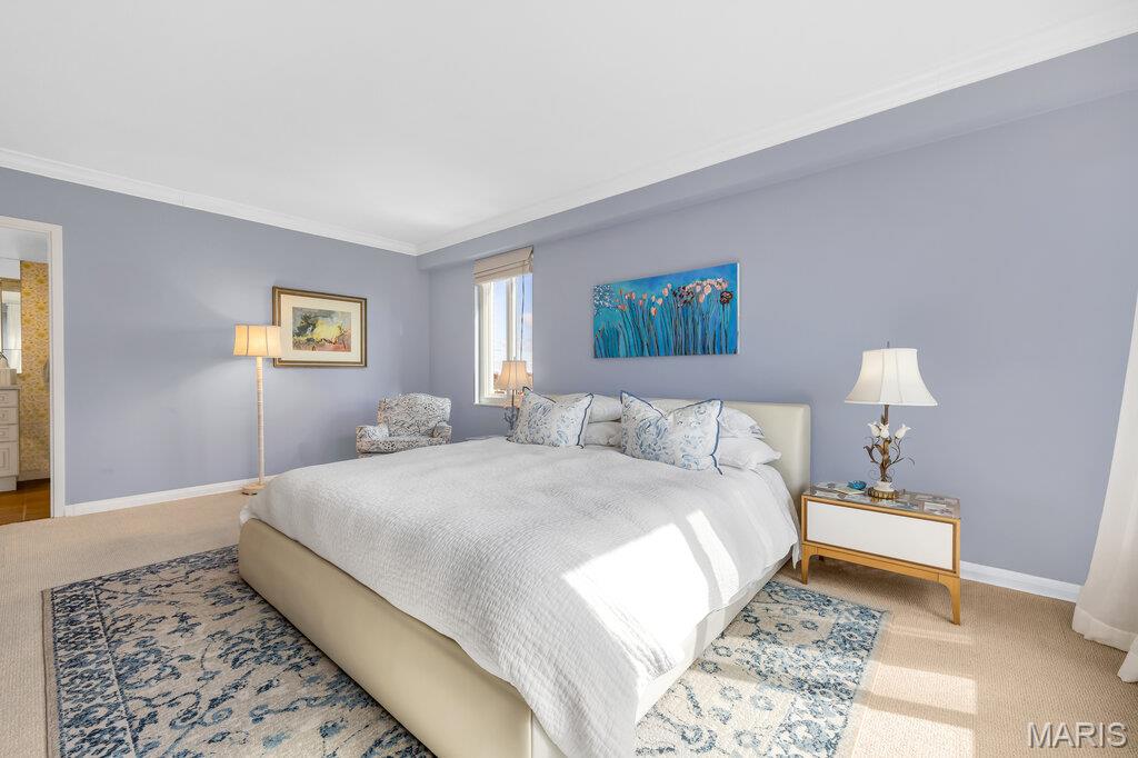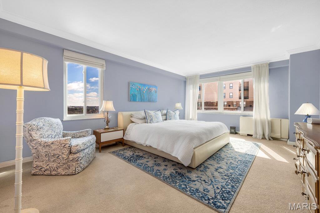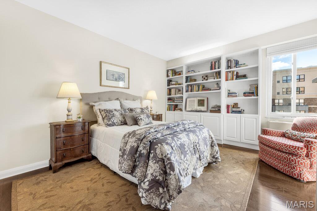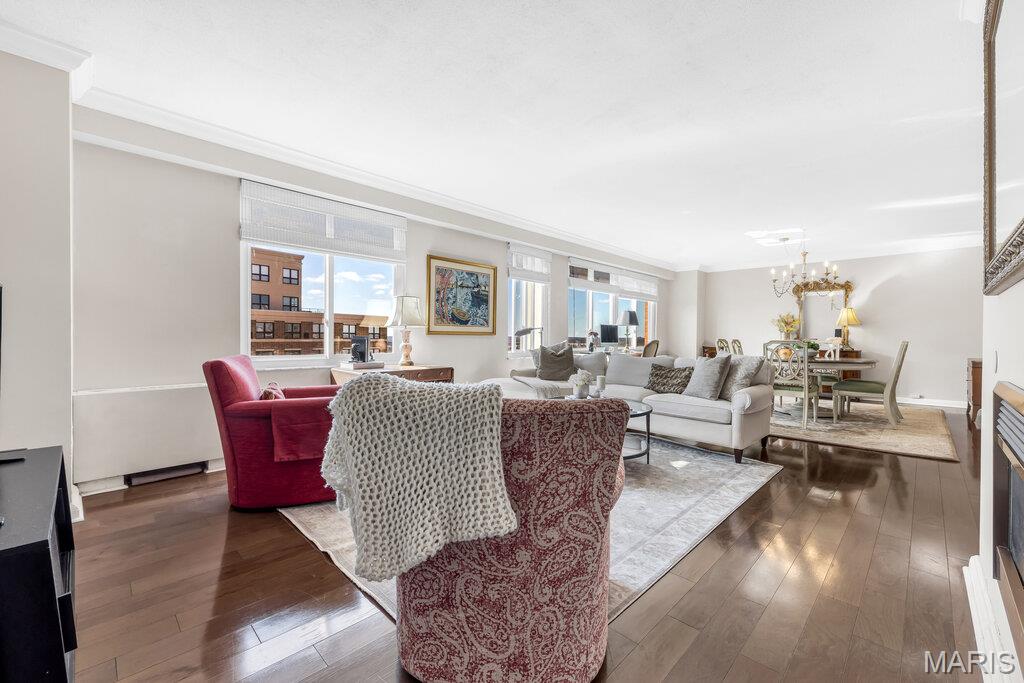 Incredible Clayton living in this beautiful 12th story condo with panoramic and awe inspiring views. You will love the ease of living with full service 24 hour security, a wonderful staff, space for entertaining in the formal common room, extensive gym, underground parking (parking spot is $60 per month), private dog park and a gorgeous outdoor pool. This home is a treasure of classic charm and modern updates. Enjoy the views as you enter the pretty foyer into the spacious and light living room and dining room with newer windows, custom window treatments, crown moldings throughout, gorgeous wood flooring and a cozy fireplace. The cooks kitchen has ample storage in its beautiful maple cabinetry, SS appliances, quartz countertops and stunning Ann Sachs Tile. Down the hall you will find an 9x6 laundry room with built in shelves, an updated hall bath, the second bedroom with custom built ins and a magnificent primary suite with views of the St Louis Arch. The generous en-suite bedroom opens into a huge closet and spacious bath with new shower, shower seat, Ann Sachs tile and gorgeous updated vanity. Nothing to do except move in and enjoy. Dining room chandelier excluded in the sale.