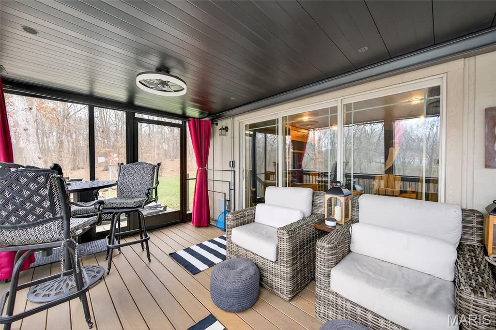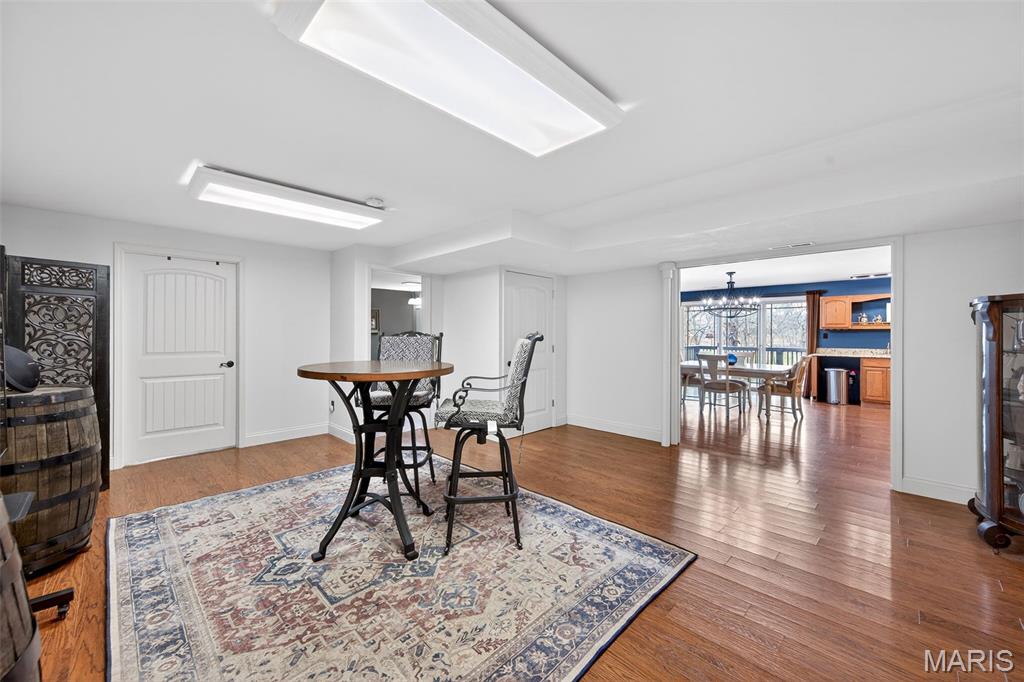 This wooded waterfront retreat on 1 full acre delivers the perfect combination of rustic warmth and thoughtful updates. From the moment you step through the updated front door into the vaulted, beamed entryway, you’ll feel the presence and craftsmanship that set this home apart. Rich wood floors flow throughout the main level, complemented by crown molding and timeless finishes. The kitchen is both beautiful and functional, featuring 42" custom cabinetry, granite countertops, stone backsplash, Bosch stainless steel appliances, smooth-top stove, breakfast bar, and eye-catching glass corner cabinets. The spacious dining room is ideal for gatherings and offers access to the huge deck. The primary suite is generously sized with dual closets and a well-appointed bath including double sinks, a garden tub, tiled shower, and crown molding. A dedicated main-floor office with custom cabinetry, additional deck access and amazing lake views provides the perfect work-from-home setup. Step outside and experience what truly makes this home exceptional — a two-level deck overlooking the water, a peaceful 3-season sunroom, a 26x17 stone patio with firepit, and your own 11x29 putting green. This backyard was designed for entertaining, relaxing, and everyday enjoyment. The walk-out lower level adds incredible versatility with a spacious family room anchored by a custom wood entertainment center, a separate rec room with pocket doors ideal for game tables or media space, a full bath, an additional bedroom, additional laundry area, and a dedicated workshop for projects or storage. A rare opportunity to own a private waterfront property that offers both everyday comfort and standout lifestyle features.