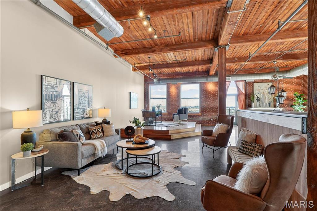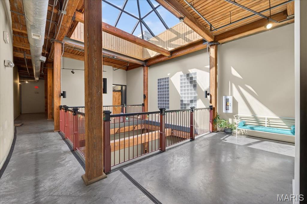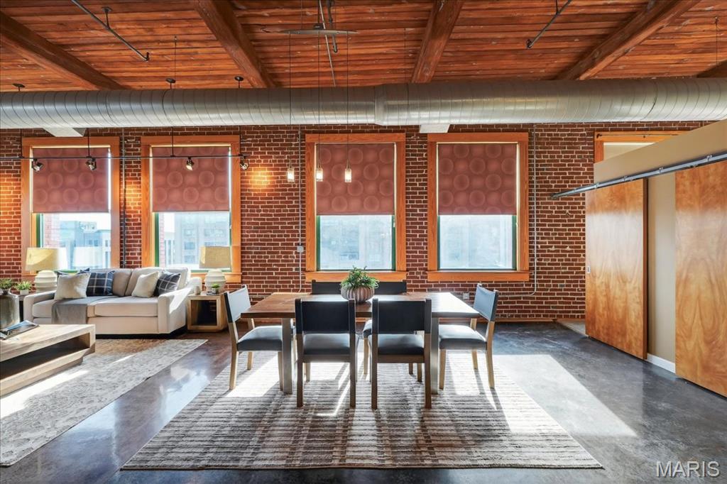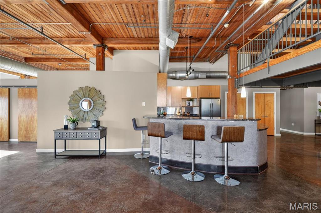 Welcome to this stunning penthouse loft offering over 3,000 sq ft of open, industrial-chic living in the historic Elder Shirt Lofts! This expansive 2-bed, 2-bath residence showcases soaring ceilings, exposed brick, rich wood beams, and oversized windows that flood the space with natural light, creating a true urban retreat. The impressive open floor plan is designed for both everyday living and entertaining, featuring a stylish kitchen with stainless steel appliances, solid surface countertops, and a breakfast bar that flows seamlessly into the spacious living and dining areas. The primary suite offers a private escape with a walk-in closet and en-suite bath, while the second bedroom features its own private loft area perfect for a unique sleeping space, office, or creative retreat. Enjoy the rare luxury of your own private rooftop patio, ideal for relaxing or entertaining with skyline views. Additional highlights include in-unit laundry, elevator access, storage space, and 2 assigned garage parking spaces. Located in the heart of downtown near City Museum, Union Station/St Louis Aquarium, America's Center Convention Complex, and the Enterprise Center, this is elevated city living with character, space, and unmatched access to St. Louis’ top attractions.