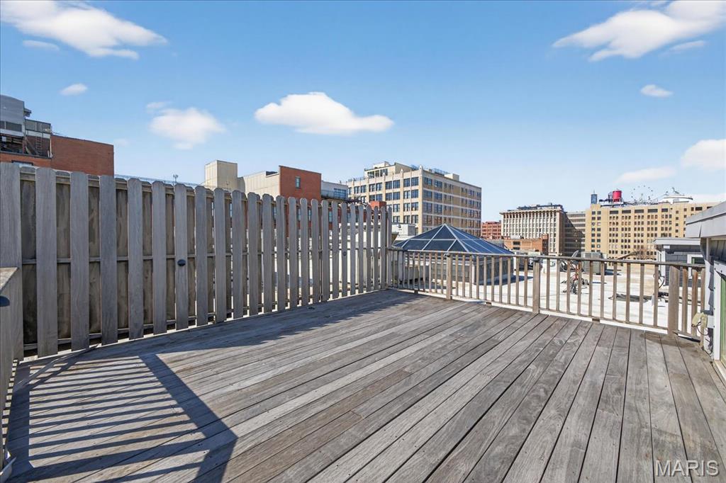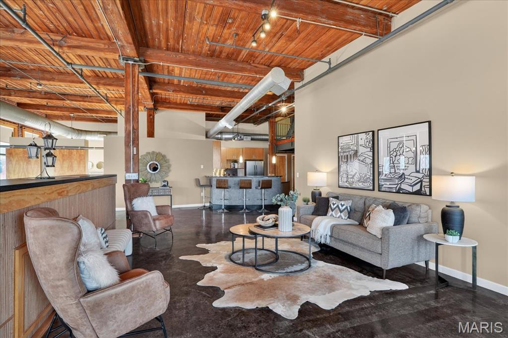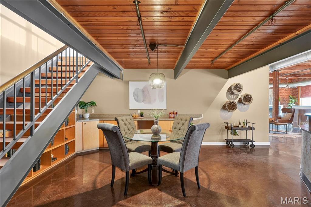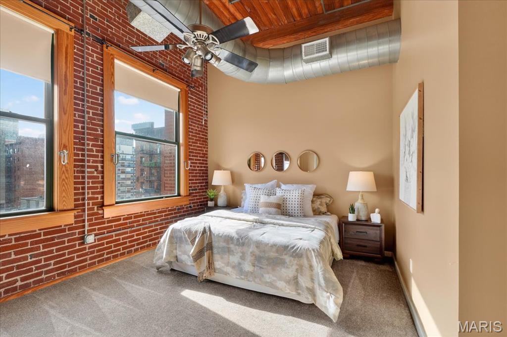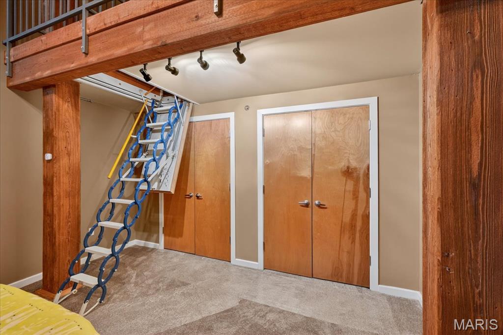 Welcome to this stunning penthouse loft offering over 3,000 sq ft of open, industrial-chic living in the historic Elder Shirt Lofts! This expansive 2-bed, 2-bath residence showcases soaring ceilings, exposed brick, rich wood beams, and oversized windows that flood the space with natural light, creating a true urban retreat. The impressive open floor plan is designed for both everyday living and entertaining, featuring a stylish kitchen with stainless steel appliances, solid surface countertops, and a breakfast bar that flows seamlessly into the spacious living and dining areas. The primary suite offers a private escape with a walk-in closet and en-suite bath, while the second bedroom features its own private loft area perfect for a unique sleeping space, office, or creative retreat. Enjoy the rare luxury of your own private rooftop patio, ideal for relaxing or entertaining with skyline views. Additional highlights include in-unit laundry, elevator access, storage space, and 2 assigned garage parking spaces. Located in the heart of downtown near City Museum, Union Station/St Louis Aquarium, America's Center Convention Complex, and the Enterprise Center, this is elevated city living with character, space, and unmatched access to St. Louis’ top attractions.