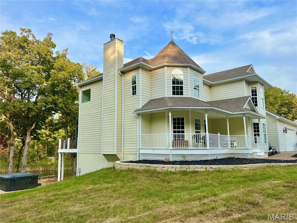 OPEN HOUSE: SATURDAY, MARCH 7TH, 2026 from 10am-12pm. This Victorian style welcomes you through the covered front porch into the Great room that boasts a wood burning fireplace and windows across the back of the home with a view of the lake/pond. Home has 3 Bedrooms on upper level and a room for an office/sewing room/gun room in lower level. Sits on 7 acres. 2 1/2 baths on main level and up, 1 full bath on lower level. Great room opens up to the breakfast room and kitchen which wraps around the formal dining room. Customed cabinets in kitchen gives you lots of countertop space and cabinets for storage and a walk-in pantry. Main level laundry. Wood floors. Primary suite has vaulted ceiling, large walk-in closet and primary bath has separate tub and shower. Jack and Jill bathroom between additional bedrooms on 2nd floor that have been painted a nuetral color. Zoned heating/cooling to keep each level at the temperature needed. Boasts crown molding throughout first level of home. Walk-out basement contains a recreation room and bar with refrigerator and office room with its own exterior door and bathroom. 2 car garage attached to house and additional garage below garage on lower level. Don't forget the temperature controlled detached garage 41 x 60 with 2 walk-in doors and 2 drive through overhead doors, with openers. Detached garage has hot water heater, sink and toilet, workbench area, it's a dream come true. Lean to off North side of garage and concrete to park your boats, trailers, RV's, etc. Wild Horse Farms Subdivision gives you rights to a 20 acre community lake. All this sits on 7 Acres. Washer,dryer, basketball hoop do not convey.