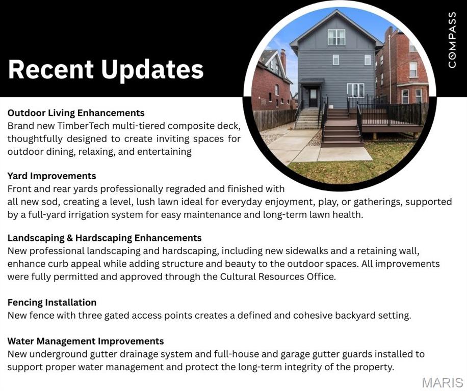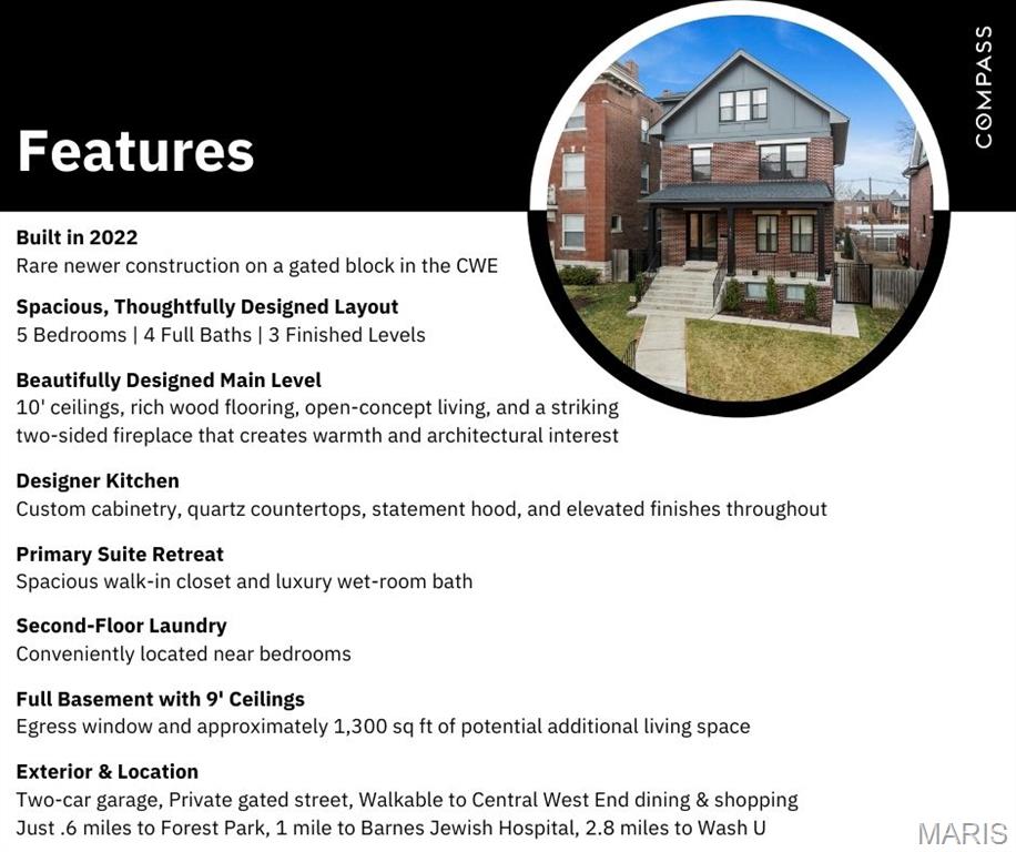 Nestled on a gated block in the heart of the Central West End, 4731 Westminster Place offers a rare opportunity to own newer construction in one of St. Louis’ most architecturally rich and established neighborhoods. Built in 2022 and thoughtfully enhanced since, this exceptional residence blends timeless design with elevated modern living. The stately brick facade opens to a light-filled interior defined by 10-foot ceilings, wide-plank Scandinavian inspired flooring, and a seamless open layout designed for both everyday living and refined entertaining. The kitchen serves as the centerpiece of the home, featuring custom cabinetry, quartz countertops, a statement hood, and designer finishes throughout. A striking two-sided fireplace adds warmth and architectural interest, connecting the main living spaces with understated sophistication. Upstairs, the primary suite offers a true retreat, complete with a spacious walk-in closet and a luxurious wet-room bath. Four additional bedrooms and a second-floor laundry provide flexibility and convenience, while the full basement with 9-foot ceilings and an egress window presents exceptional potential for additional living space, fitness, or recreation. Since purchasing, the current owners have made substantial exterior upgrades, including a multi-tiered TimberTech deck, extensive regrading, new sod and landscaping, hardscape improvements, fencing, and a full-yard irrigation system. Underground gutter drainage and full-house and garage gutter guards support proper water management and help protect the long-term integrity of the property. Located within a designated historic preservation district, all exterior improvements were fully permitted and approved through the Cultural Resources Office, ensuring thoughtful alignment with the architectural character and standards of the neighborhood. With its gated setting, two-car garage, and exceptional walkability, this home is just 0.6 miles to Forest Park, 1 mile to Barnes Jewish Hospital, and 2.8 miles to Washington University. It represents a truly rare offering: newer construction, elevated finishes, and turnkey condition in one of the city’s most sought-after locations.