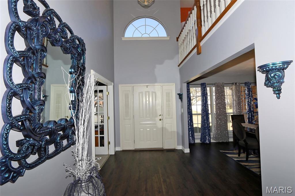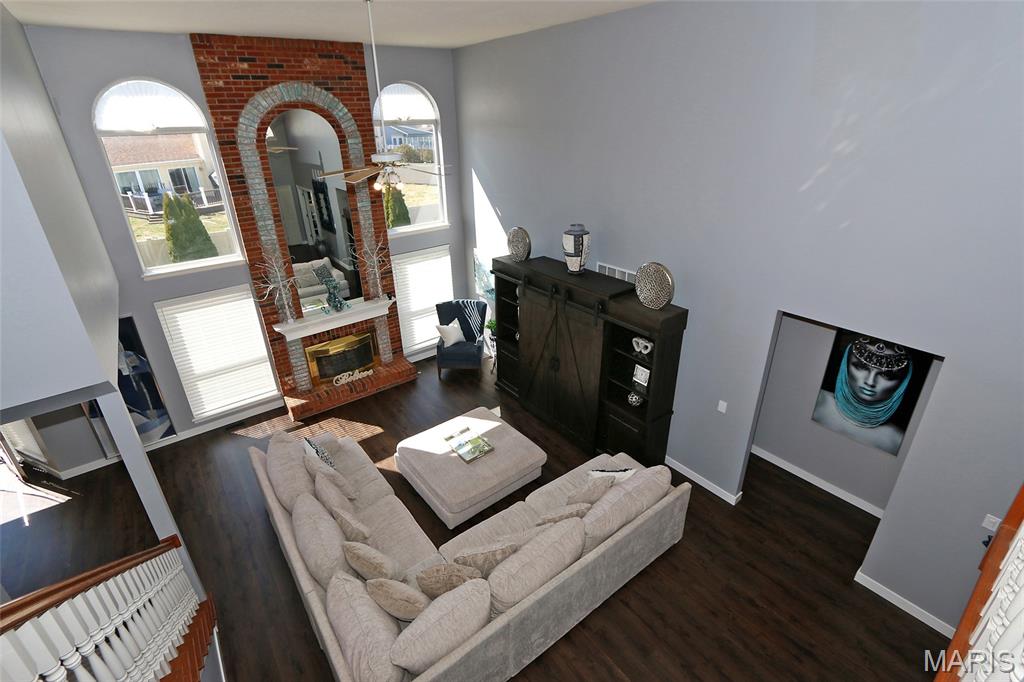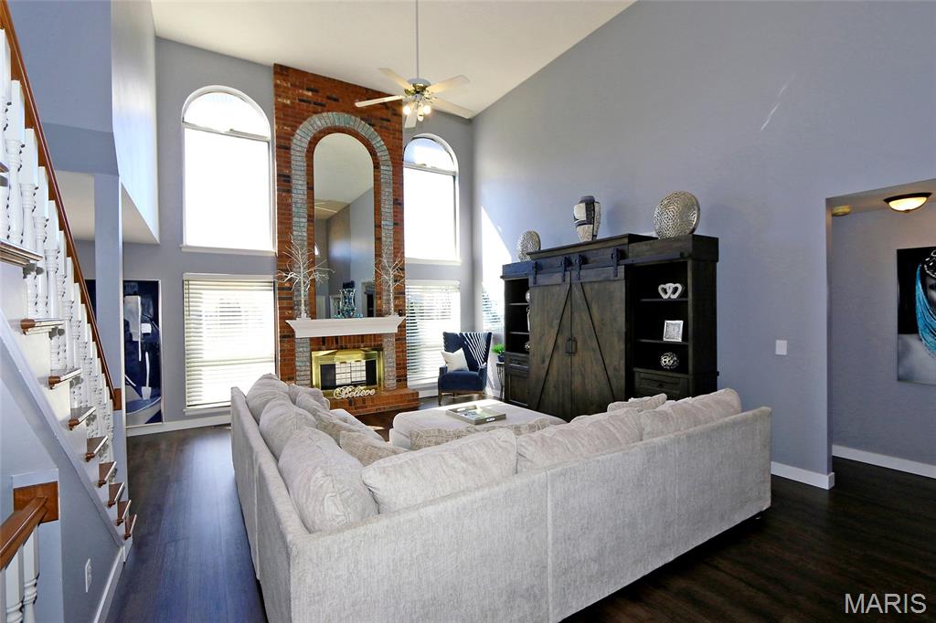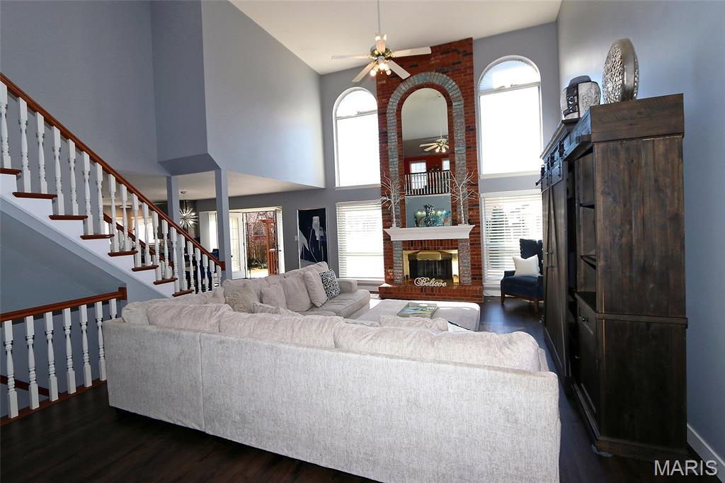 Architectural Elegance & Modern Style! From the moment you step into the soaring two-story foyer, the home’s wow factor is on full display. The expansive great room is anchored by a dramatic floor-to-ceiling brick fireplace with an upgraded mirrored arched inlay, flanked by large windows that fill the space with natural light. Rich wood-style flooring flows throughout the main level, providing a warm contrast to the crisp, modern grey and deep indigo accents. The Gourmet Kitchen is an upgraded dream and the heart of the home, featuring Custom Indigo Island: A massive upgraded central island with premium upgraded granite countertops and built-in storage. Modern Cabinetry: Sleek upgraded grey cabinetry complemented by a designer tiled backsplash. Premium Finishes: Stainless steel appliances and stylish pendant lighting. Open Concept: Seamlessly connects to the breakfast nook and living areas, perfect for entertaining. First-Floor Primary Suite: A true sanctuary featuring a unique tray ceiling with an indigo inlay, a custom wood-blade fan, and a spa-like ensuite with double vanities, a glass-enclosed shower, and upgraded marble look flooring. Versatile Upper Level: Includes a spacious loft overlooking the great room, two additional bedrooms, and a full bath. A dedicated main-floor den with large windows and French doors for privacy. Finished lower features a massive recreation area with upgraded modern flooring, a dedicated media room, an additional room with a large walk-in closet, and a kitchenette/bar area. The backyard features a large designer concrete patio and a custom wood pergola with bistro lighting.