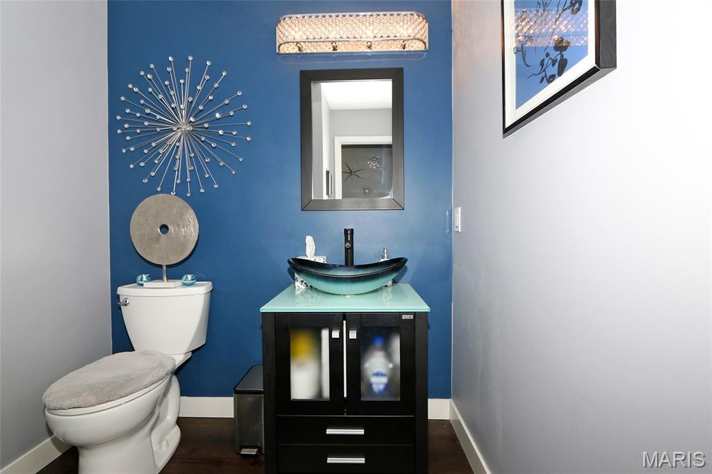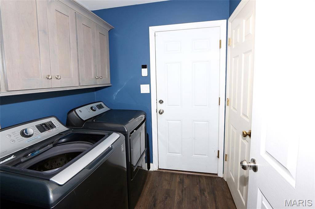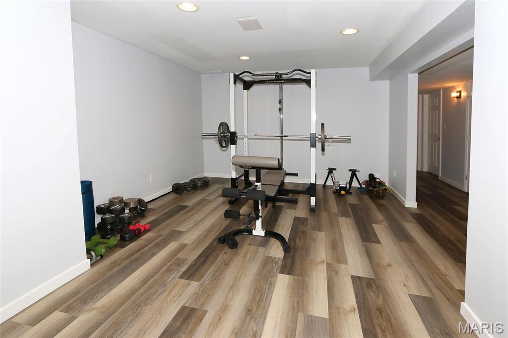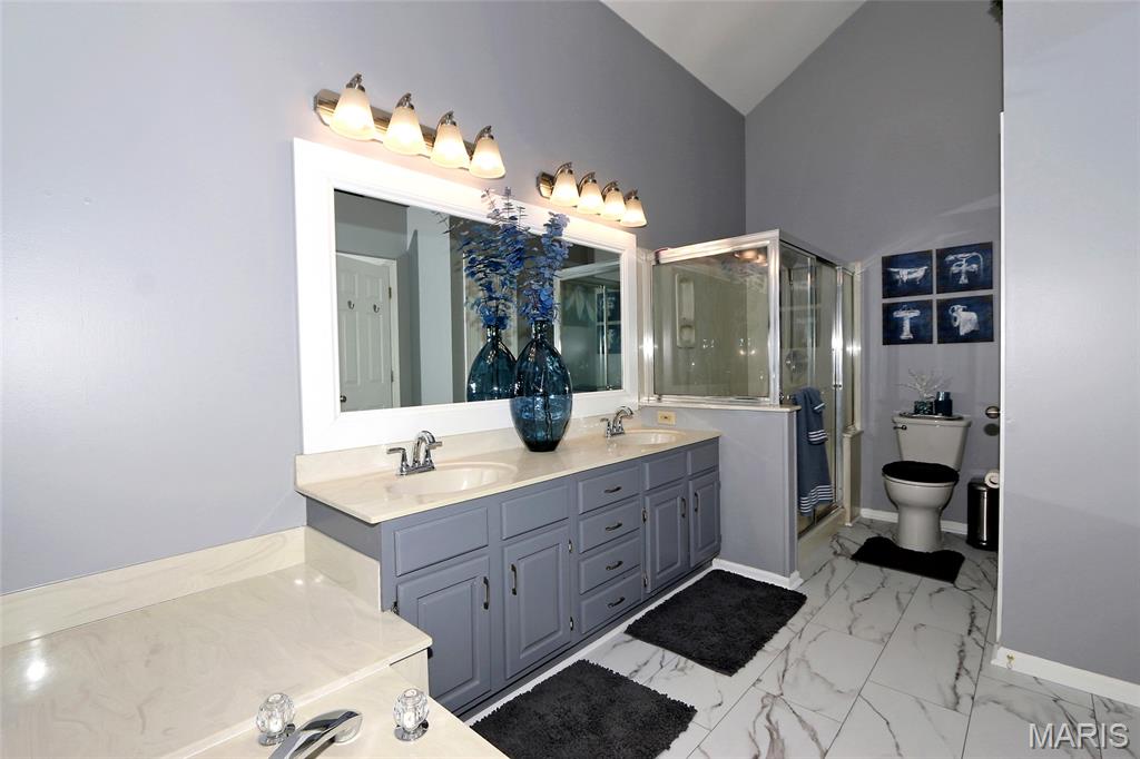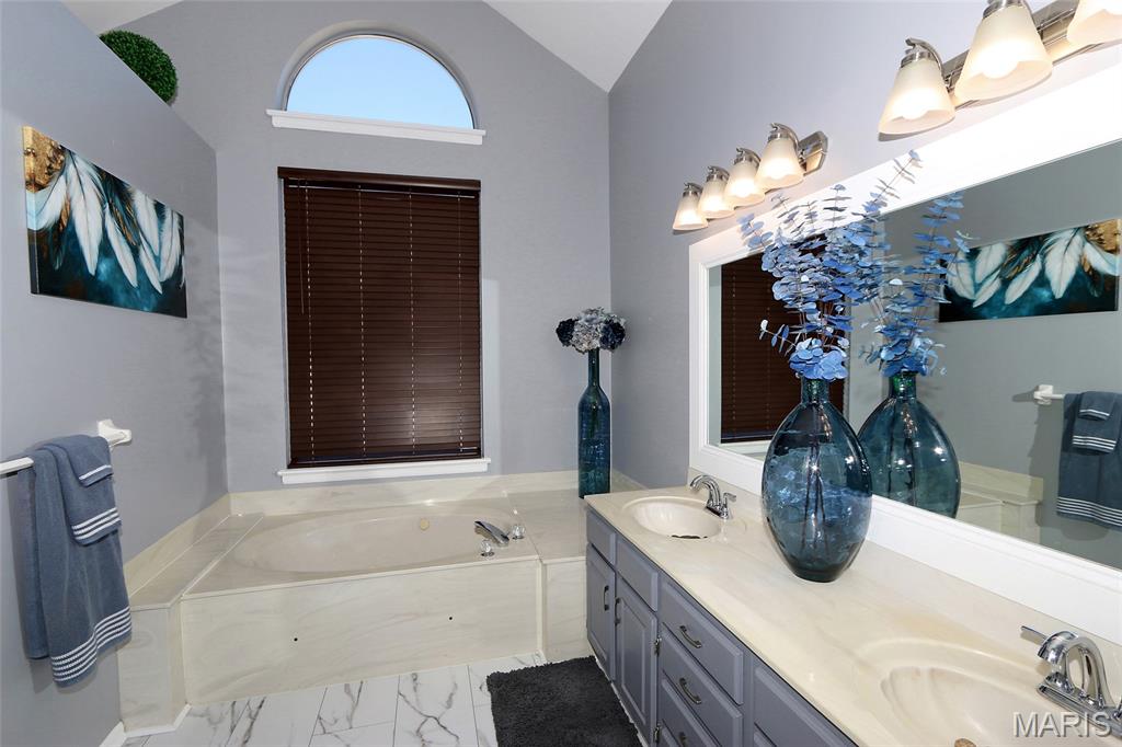 Architectural Elegance & Modern Style! From the moment you step into the soaring two-story foyer, the home’s wow factor is on full display. The expansive great room is anchored by a dramatic floor-to-ceiling brick fireplace with an upgraded mirrored arched inlay, flanked by large windows that fill the space with natural light. Rich wood-style flooring flows throughout the main level, providing a warm contrast to the crisp, modern grey and deep indigo accents. The Gourmet Kitchen is an upgraded dream and the heart of the home, featuring Custom Indigo Island: A massive upgraded central island with premium upgraded granite countertops and built-in storage. Modern Cabinetry: Sleek upgraded grey cabinetry complemented by a designer tiled backsplash. Premium Finishes: Stainless steel appliances and stylish pendant lighting. Open Concept: Seamlessly connects to the breakfast nook and living areas, perfect for entertaining. First-Floor Primary Suite: A true sanctuary featuring a unique tray ceiling with an indigo inlay, a custom wood-blade fan, and a spa-like ensuite with double vanities, a glass-enclosed shower, and upgraded marble look flooring. Versatile Upper Level: Includes a spacious loft overlooking the great room, two additional bedrooms, and a full bath. A dedicated main-floor den with large windows and French doors for privacy. Finished lower features a massive recreation area with upgraded modern flooring, a dedicated media room, an additional room with a large walk-in closet, and a kitchenette/bar area. The backyard features a large designer concrete patio and a custom wood pergola with bistro lighting.