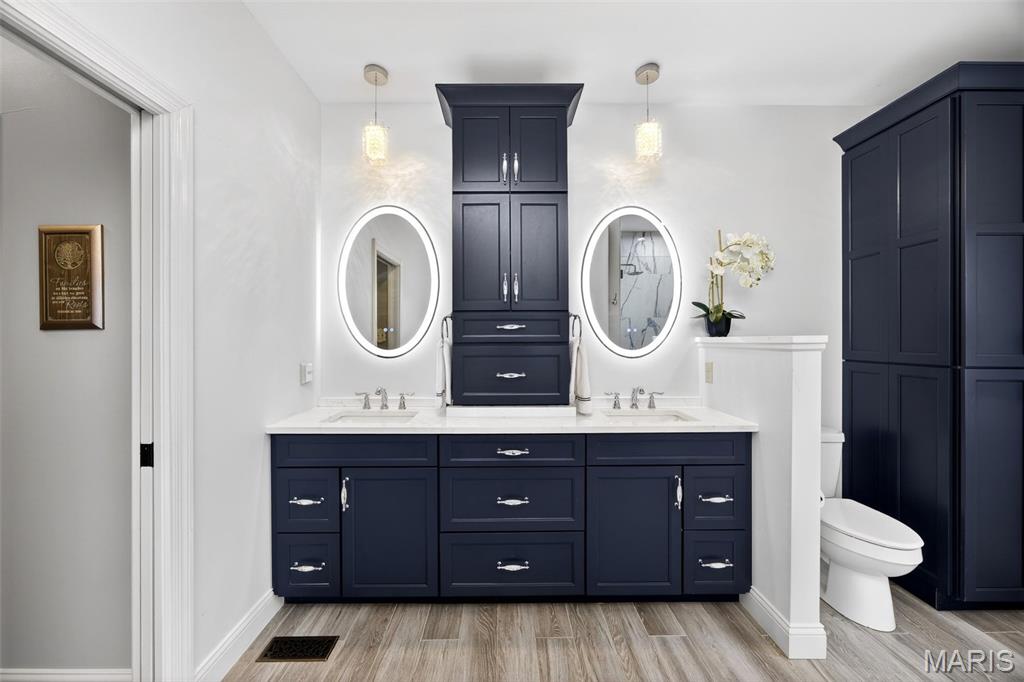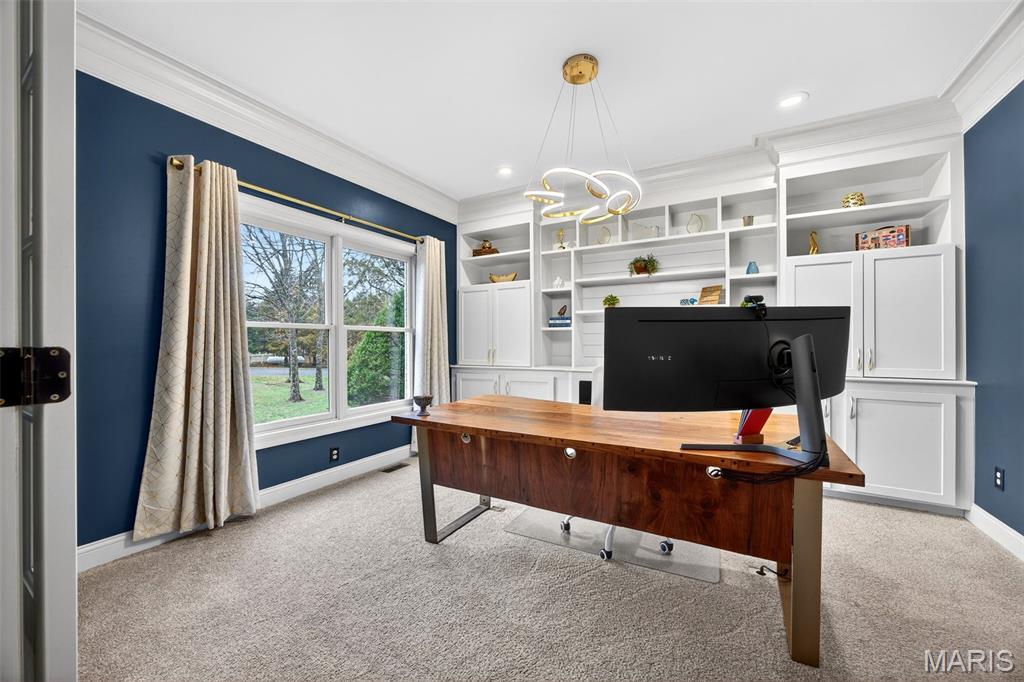 Set on 3 beautifully landscaped acres surrounded by mature trees, this exceptional story-and-a-half residence blends timeless architecture with the warm sophistication of a Ralph Lauren–inspired interior. Rich wood floors, custom millwork, and thoughtfully designed spaces create a home that feels both refined and welcoming. A dramatic two-story foyer makes an unforgettable first impression, flanked by a private executive office with custom built-ins, electric fireplace, and French doors, and an elegant formal dining room designed for entertaining. The heart of the home is the stunning great room, anchored by a fireplace and framed with custom built-in bookcases. French doors open to a spectacular all-window sunroom, filling the home with natural light and creating seamless views of the private, tree-lined property. The sunroom leads to an expansive maintenance-free deck, perfect for morning coffee or evening gatherings overlooking the peaceful landscape. The gourmet kitchen features rich cherry cabinetry, double ovens, a center island with cooktop and seating, and a spacious breakfast room with additional deck access, making indoor-outdoor entertaining effortless. The main-level primary suite is a true retreat, complete with its own fireplace, dual walk-in closets with custom organization systems, and a beautifully remodeled spa bath featuring adult-height double vanities, illuminated mirrors, a freestanding jetted soaking tub, and an oversized tiled shower. Upstairs, two generous bedrooms and a stylishly updated bath provide comfortable accommodations for family or guests. The walk-out lower level is nearly fully finished and ideal for multigenerational living, offering a kitchenette, full bar with seating, fireplace lounge area, game or dining space, exercise room, two additional bedrooms, and a full bath. One area has been thoughtfully designed to easily convert into a private theater room complete with buffet space and theater lighting. Outdoor living continues on the covered patio and extended entertaining area, all surrounded by lush landscaping and serene wooded views. Meticulously maintained and beautifully updated throughout, this extraordinary property offers luxury, privacy, and flexibility just minutes from everyday conveniences. Oepn House Sunday, March 22nd from 2-4pm.