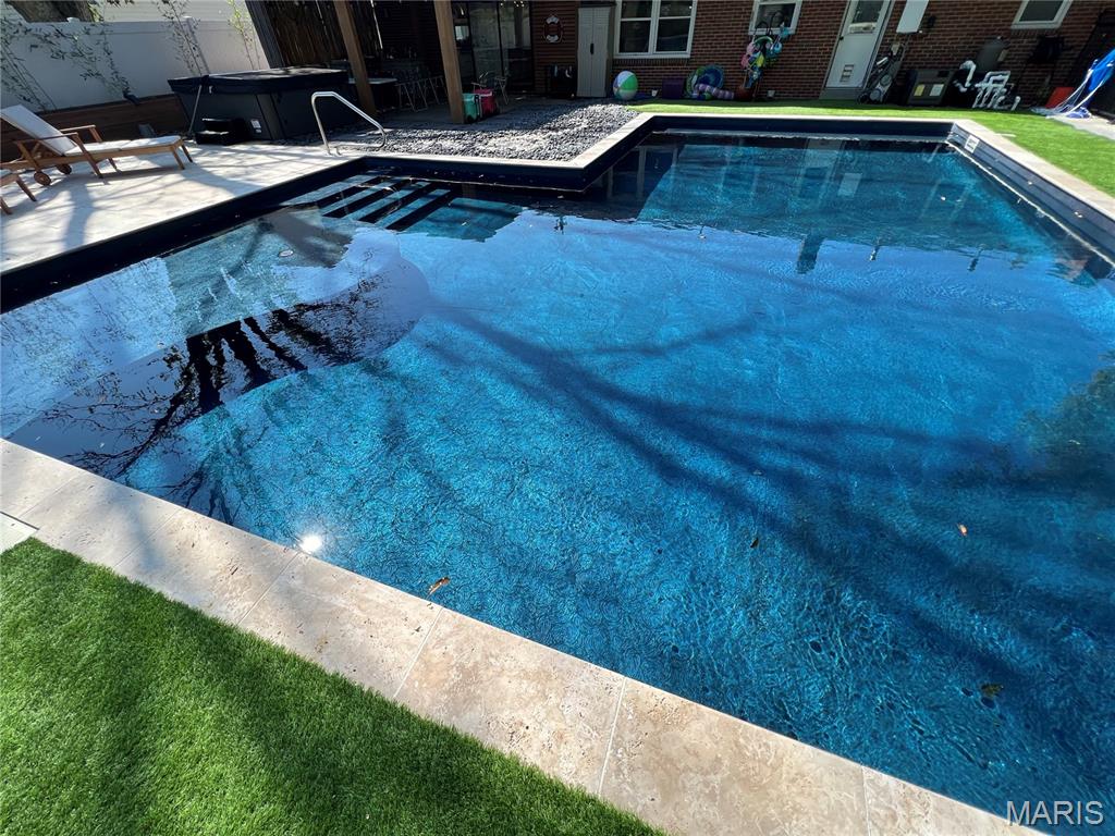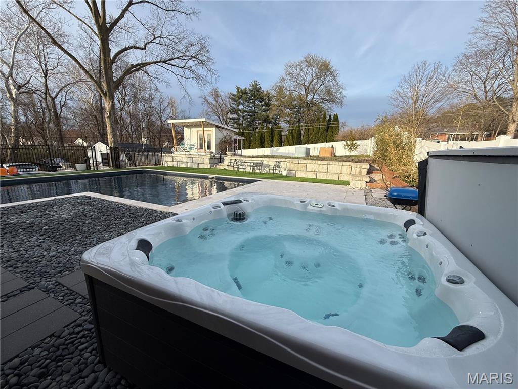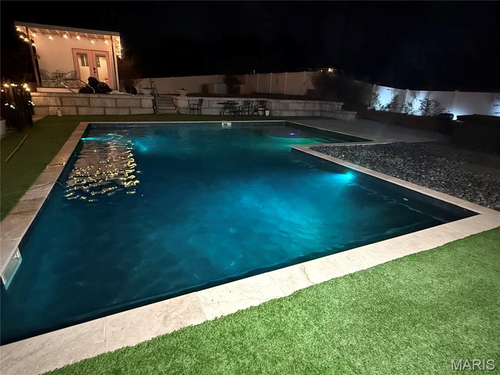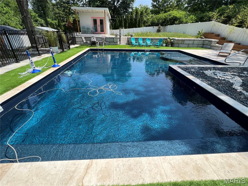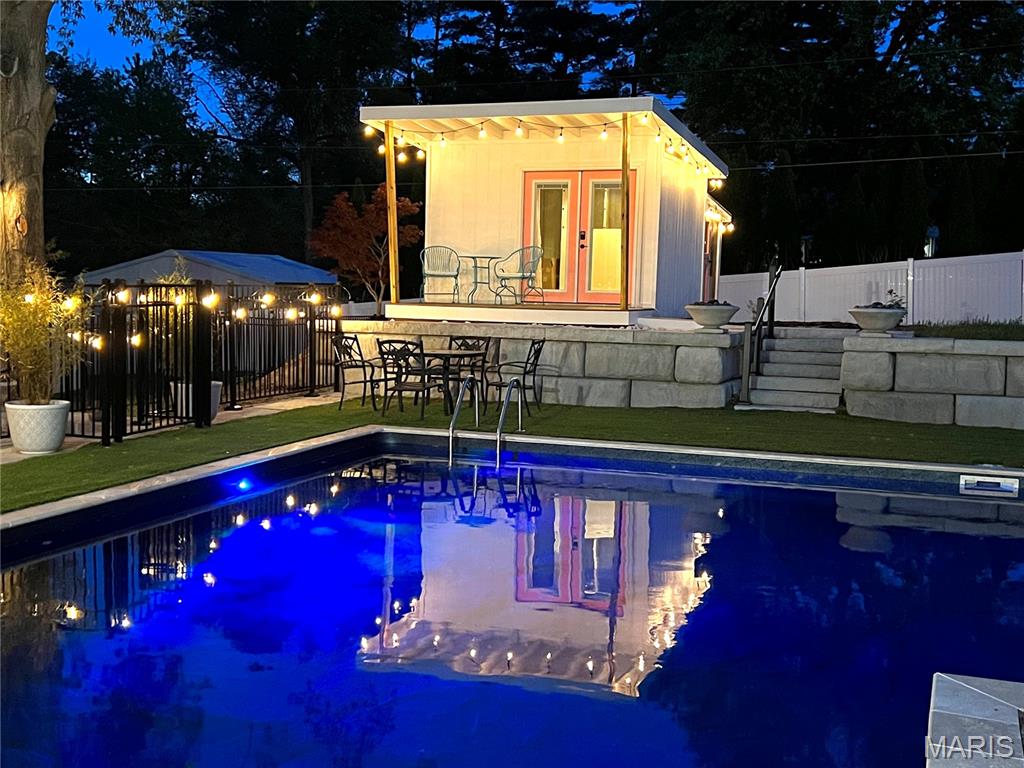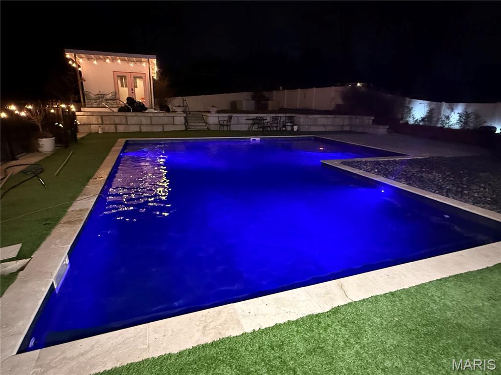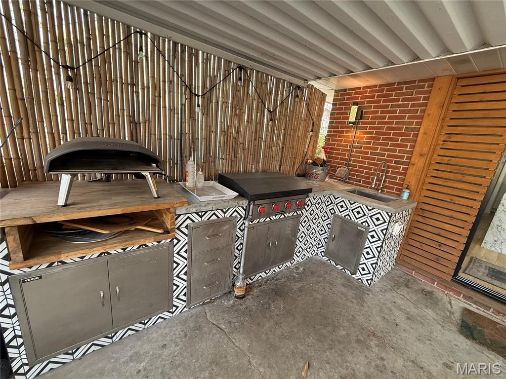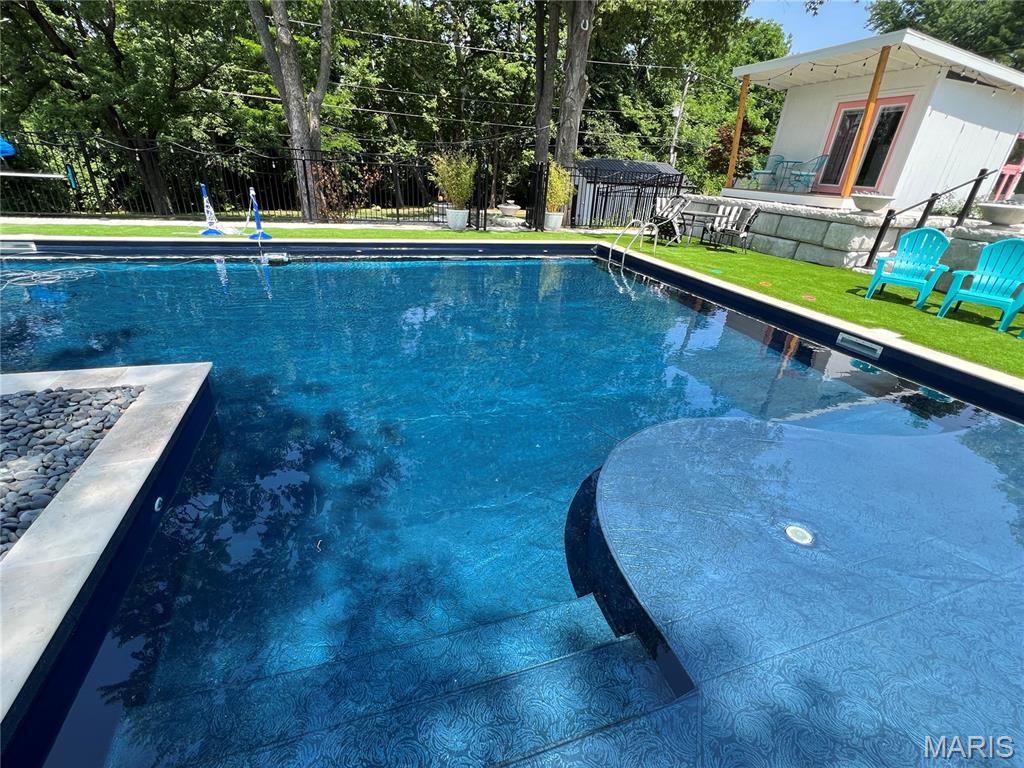 Agent owned. Francis Howell Central High School, unincorporated Saint Charles County. Designer kitchen with waterfall island, real ITALIAN marble backsplash, 6 burner gas cooktop, KITCHENAID wall oven/microwave, drink fridge, pantry cabinets, laundry built in. Outdoor kitchen with built in flat top, sink, and room for additional grill and pizza oven; natural gas so no need to replace the propane ever. 888 sq-ft surface area Saltwater pool with Baha tanning ledge (doubles as kiddie pool and has bubbler), 4 deck jets, sports court designed, HEATED, cartridge filter, travertine coping & patio, surrounded by turf. The lot is huge with a creek contained on the property and adjacent to a large 40+ acres of continuous common ground area in the neighboring subdivision. Basement has a kitchenette, full bath, recreation area with wood fireplace, and a room with closet, electric fireplace, and additional laundry. Large, detached garage or workshop area.