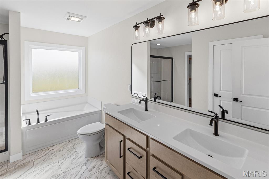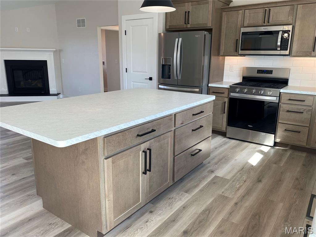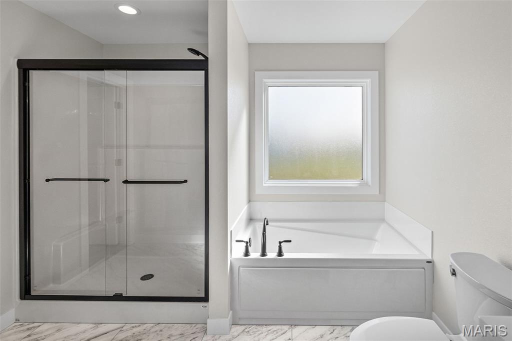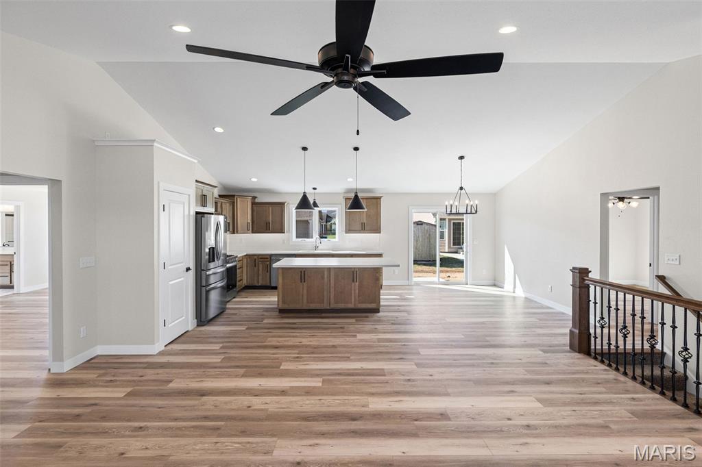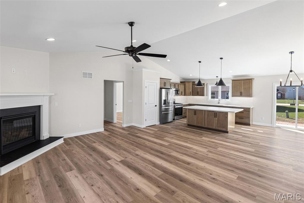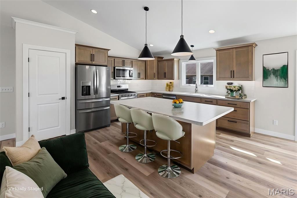 COMING SOON, FIRST SHOWINGS 3/22 NOON -3:00PM AT OPEN HOUSE. Another quality new construction by RWK Building & Remodeling, offering many features typically found in custom homes. This Craftsman-style ranch showcases an open floor plan with vaulted ceilings, a desirable split-bedroom layout, and abundant natural light throughout. The great room features a corner gas fireplace thoughtfully positioned to maximize wall space while creating a warm and inviting focal point. The kitchen is both stylish and functional, offering soft-close cabinetry and drawers, under-cabinet lighting, tiled backsplash, a lazy Susan, built-in trash storage, pantry, and a generously sized center island with additional seating and storage, along with stainless appliances already in place for your convenience. The dining area flows seamlessly with the kitchen and great room and opens to the patio through sliding glass doors, making it ideal for everyday living and entertaining. The primary suite is well appointed with a tray ceiling, a walk-in closet with wood shelving, plus an additional walk-in closet accessed through the private bath. The luxury primary bath includes a dual vanity, soaking tub, separate shower, and its own linen closet. Two additional main-level bedrooms also feature ceiling fans, with a full bath conveniently located between them and additional hallway linen storage. The laundry room includes a window for natural light and is ideally located near the garage to serve as a practical landing zone. The fully finished garage offers pull-down attic access, garage door openers, electric vehicle charging, and is complemented by generous concrete parking. An open staircase with decorative wrought iron spindles leads to the full unfinished basement offering approximately 1,648 square feet of space ready for future expansion, including two egress windows suitable for additional bedrooms, a rough-in for a third bathroom, and a radon mitigation system already in place. You will appreciate the attention to detail throughout, from the clean lines of the cabinetry and thoughtfully selected lighting to recessed lighting in key areas and ceiling fans in each bedroom and the great room. Landscaping is included in the price. Located just one mile from I-64, this home offers an easy commute to Scott AFB, MidAmerica Airport, and Boeing. Situated in the Wesclin School District, New Baden features a community park with a walking path, a pool with splash pad, and hosts local favorites like the June Jamboree and Chili Cookoff. We want to welcome you home.