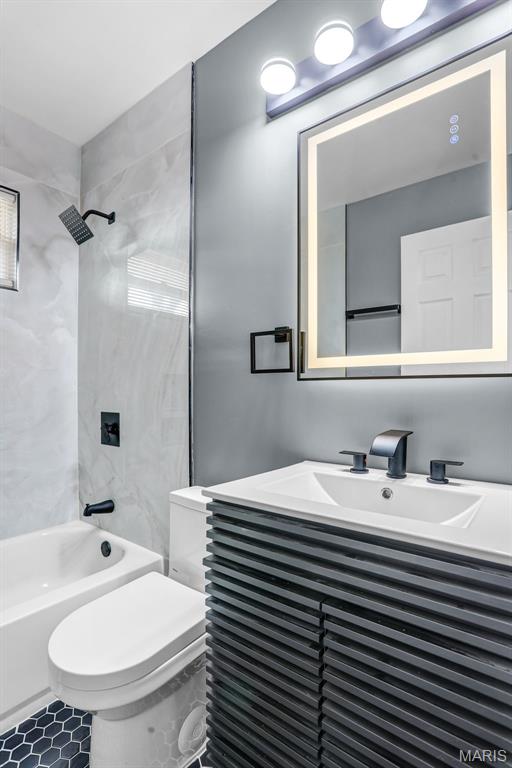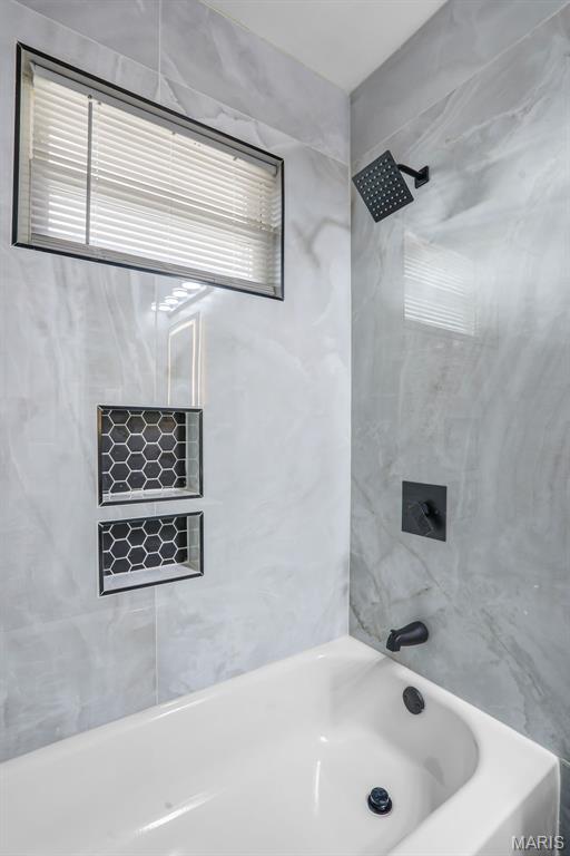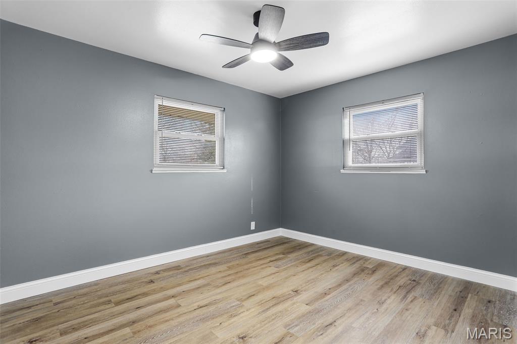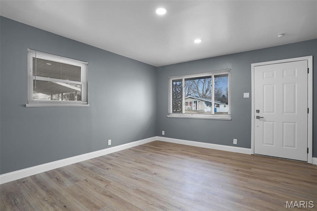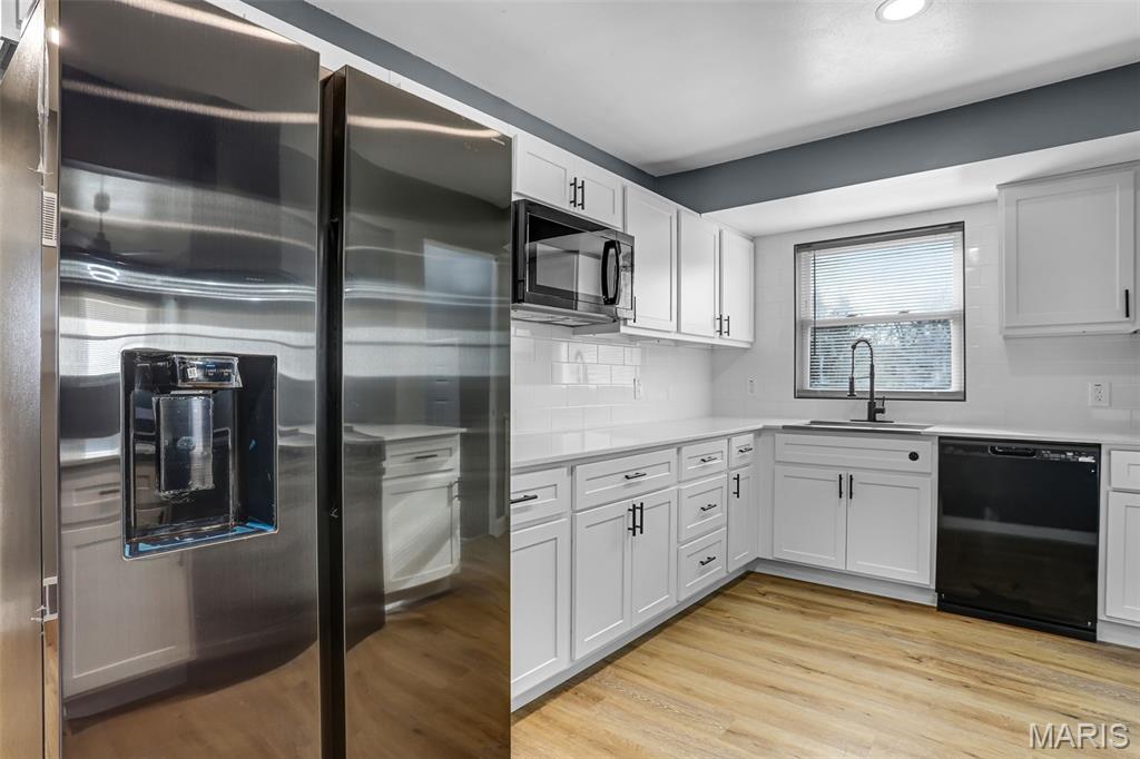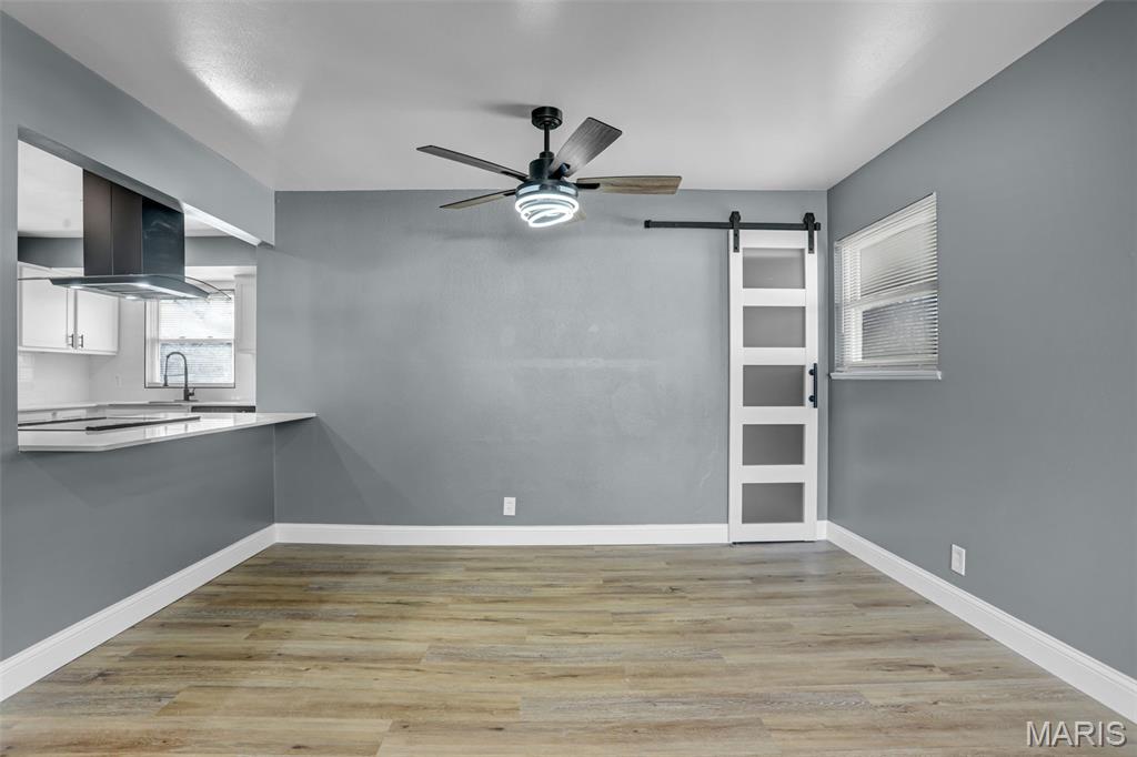Beautiful 3-bedroom, 1-bath home with basement and the updates are the real deal! This move-in ready home has been transformed with a modern aesthetic throughout. The stunning kitchen is the showstopper, featuring white shaker cabinetry, quartz countertops, subway tile backsplash, and a bold island with range and hood. Complete with a refrigerator, black dishwasher, and a workstation sink with a matte black pull-down faucet, this kitchen checks every box. The open living and dining area flows beautifully from the kitchen pass-through and boasts new flooring, recessed lighting, and a stylish ceiling fan. The bathroom has been completely reimagined with large-format marble-look tile, a stunning ribbed black vanity, LED backlit mirror, matte black fixtures throughout, and hexagon tile flooring. The full basement offers incredible bonus square footage with rooms, new carpet, a painted exposed ceiling with recessed lighting, and abundant built-in shelving and storage, ideal for a rec room, home gym, or workshop. Outside you'll find a covered carport, a patio with pavers, a spacious backyard with a chain link fence, and a large open yard with plenty of room to make it your own. Additional updates include a brand new AC unit, giving you peace of mind for years to come.